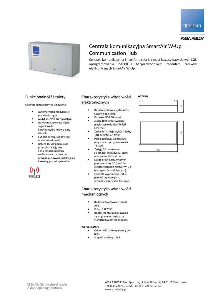 Centrala komunikacyjna SmartAir W-Up Communication Hub Centrala komunikacyjna SmartAir działa jak most łączący bazy danych SQL oprogramowania TS1000 z bezprzewodowymi modułami zamków elektronicznych SmartAir W-Up. Funkcjonalność i zalety Centrala komunikacyjna umożliwia: • • • • • Automatyczną modyfikację planów dostępu. Audyt w czasie rzeczywistym. Natychmiastowe usunięcie zagubionych kart/identyfikatorów z bazy danych. Funkcja bezprzewodowego otwierania drzwi itp. Usługa TCP/IP pozwala na prostą instalację bez konieczności montażu okablowania, zarówno w przypadku nowych instalacji jak i istniejących już systemów. Charakterystyka właściwości elektronicznych • • • • • • • • Wymiary Bezprzewodowa częstotliwość radiowa 868 MHZ. Protokół UDP Ethernet. Złącze RJ45 umożliwiające przyłączenie do sieci TCP/IP Ethernet. Zasilanie: istnieje wybór między 110-220VAC, a 12VCC. Pełna konfiguracja możliwa przy użyciu oprogramowania TS1000. Zasięg: 30 metrów (w zależności od budynku, ścian oraz parametrów drzwi). Liczba drzwi obsługiwanych przez centralę: 30 (zamków elektronicznych SmartAir W-Up lub czytników naściennych). Centrala wyposażona jest w pamięć zapasową – na wypadek przerwania łączności. Charakterystyka właściwości mechanicznych • • • Budowa: tworzywo sztuczne ABS. Kolor: RAL7035. Rodzaj montażu: mocowania zewnętrzne lub instalacja standardowa (mechaniczna). Warunki pracy • Odporność na temperaturę do 85C. • Stopień ochrony: IP65. ASSA ABLOY Poland Sp. z o.o., ul. Jana Olbrachta 94 01-102 Warszawa Tel: (+48 22) 751-53-54, Fax: (+48 22) 751-53-56 www.assaabloy.pl