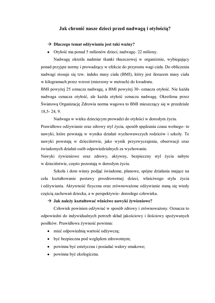 Jak chronić nasze dzieci przed nadwagą i otyłością? Dlaczego temat odżywiania jest taki ważny? Otyłość ma ponad 5 milionów dzieci, nadwagę- 22 miliony. Nadwagę określa nadmiar tkanki tłuszczowej w organizmie, wybiegający ponad przyjęte normy i prowadzący w efekcie do przyrostu wagi ciała. Do obliczenia nadwagi stosuje się tzw. indeks masy ciała (BMI), który jest ilorazem masy ciała w kilogramach przez wzrost (mierzony w metrach) do kwadratu. BMI powyżej 25 oznacza nadwagę, a BMI powyżej 30- oznacza otyłość. Nie każda nadwaga oznacza otyłość, ale każda otyłość oznacza nadwagę. Określona przez Światową Organizację Zdrowia norma wagowa to BMI mieszczący się w przedziale 18,5- 24, 9. Nadwaga w wieku dziecięcym prowadzi do otyłości w dorosłym życiu. Prawidłowe odżywianie oraz zdrowy styl życia, sposób spędzania czasu wolnego- to nawyki, które powstają w wyniku działań wychowawczych rodziców i szkoły. Te nawyki powstają w dzieciństwie, jako wynik przyzwyczajenia, obserwacji oraz świadomych działań osób odpowiedzialnych za wychowanie. Nawyki żywieniowe oraz zdrowy, aktywny, bezpieczny styl życia nabyte w dzieciństwie, często pozostają w dorosłym życiu. Szkoła i dom winny podjąć świadome, planowe, spójne działania mające na celu kształtowanie postawy prozdrowotnej dzieci, właściwego stylu życia i odżywiania. Aktywność fizyczna oraz zrównoważone odżywianie staną się wtedy częścią zachowań dziecka, a w perspektywie- dorosłego człowieka. Jak należy kształtować właściwe nawyki żywieniowe? Człowiek powinien odżywiać w sposób zdrowy i zrównoważony. Oznacza to odpowiedni do indywidualnych potrzeb skład jakościowy i ilościowy spożywanych posiłków. Prawidłowa żywność powinna: mieć odpowiednią wartość odżywczą; być bezpieczna pod względem zdrowotnym; powinna być estetyczna i posiadać walory smakowe; powinna być ekologiczna. Jakie są dobre nawyki żywieniowe? pełnowartościowe pierwsze śniadanie; regularne spożywanie 5 niezbyt obfitych posiłków w ciągu dnia; kolację należy spożyć 3 godziny przed snem; należy jeść bez pośpiechu; dieta powinna być zróżnicowana, bogata w błonnik, białko, dobre węglowodany oraz nienasycone kwasy tłuszczowe; należy pić dużo wody; zrezygnować z tuczących przekąsek; nie należy traktować jedzenia jako formy nagradzania dziecka. Jakie są złe nawyki żywieniowe? brak pierwszego i drugiego śniadania; nadmiar słodyczy, słonych przekąsek, słodkich napojów; spożywanie fast- foodów; za mała ilość warzyw i owoców; za mało chudych produktów mlecznych; zbyt długie przerwy między posiłkami; jedzenie podwójnych obiadów; zbyt obfite posiłki; późne kolacje. Jakie są konsekwencje nadwagi? BMI- Body- Mass- Index BMI= masa (kg) (wzrost w metrach) BMI pomiędzy 18,5- 24,9- norma BMI powyżej 25- nadwaga BMI powyżej 30- otyłość Konsekwencje nadwagi u dzieci: zwiększa ryzyko przedwczesnych zgonów; zwiększa ryzyko niepełnosprawności w dorosłym życiu; może powodować brak akceptacji w grupie rówieśniczej; sprzyja niechęci do kontaktów z innymi, wpływa na zaburzenie relacji z kolegami; wpływa na niskie poczucie własnej wartości, niską samoocenę, brak samoakceptacji. Jakie są konsekwencje otyłości? Konsekwencje otyłości to: nadciśnienie tętnicze; cukrzyca typu II; choroba wieńcowa; zwyrodnienie stawów; większe ryzyko występowania nowotworów; żylaki; udar mózgowy; niewydolność serca; kamica pęcherzyka żółciowego; zaburzenia oddychania w czasie snu; zaburzenia hormonalne i powikłania ciąży; zespół X (zespół polimetaboliczny). Chrońmy nasze dzieci przed nadwagą i otyłością!