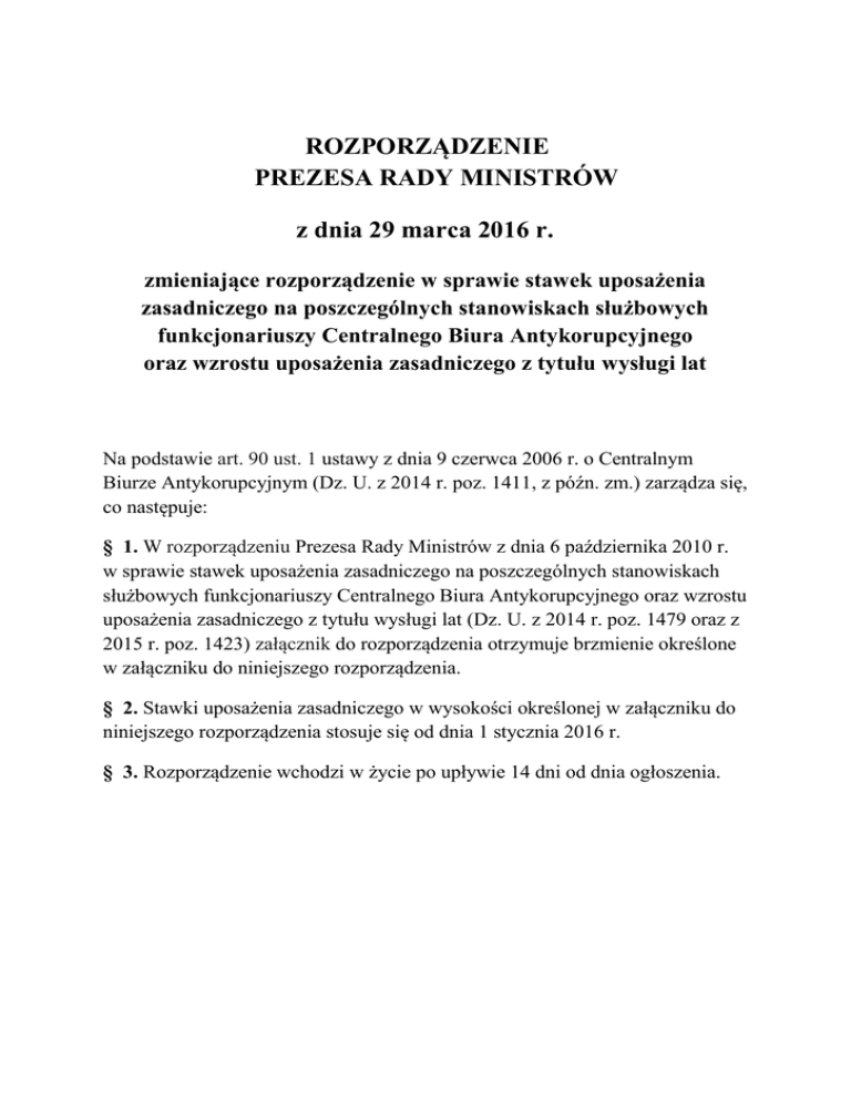 ROZPORZĄDZENIE PREZESA RADY MINISTRÓW z dnia 29 marca 2016 r. zmieniające rozporządzenie w sprawie stawek uposażenia zasadniczego na poszczególnych stanowiskach służbowych funkcjonariuszy Centralnego Biura Antykorupcyjnego oraz wzrostu uposażenia zasadniczego z tytułu wysługi lat Na podstawie art. 90 ust. 1 ustawy z dnia 9 czerwca 2006 r. o Centralnym Biurze Antykorupcyjnym (Dz. U. z 2014 r. poz. 1411, z późn. zm.) zarządza się, co następuje: § 1. W rozporządzeniu Prezesa Rady Ministrów z dnia 6 października 2010 r. w sprawie stawek uposażenia zasadniczego na poszczególnych stanowiskach służbowych funkcjonariuszy Centralnego Biura Antykorupcyjnego oraz wzrostu uposażenia zasadniczego z tytułu wysługi lat (Dz. U. z 2014 r. poz. 1479 oraz z 2015 r. poz. 1423) załącznik do rozporządzenia otrzymuje brzmienie określone w załączniku do niniejszego rozporządzenia. § 2. Stawki uposażenia zasadniczego w wysokości określonej w załączniku do niniejszego rozporządzenia stosuje się od dnia 1 stycznia 2016 r. § 3. Rozporządzenie wchodzi w życie po upływie 14 dni od dnia ogłoszenia. ZAŁĄCZNIK TABELA STAWEK UPOSAŻENIA ZASADNICZEGO FUNKCJONARIUSZY CENTRALNEGO BIURA ANTYKORUPCYJNEGO Lp. 1 2 3 4 5 6 7 8 9 10 11 12 13 14 15 16 17 18 19 Stanowisko służbowe Szef Zastępca Szefa Dyrektor departamentu Dyrektor biura Dyrektor delegatury Zastępca dyrektora departamentu Naczelnik wydziału Zastępca naczelnika wydziału Kierownik sekcji Radca prawny Audytor Ekspert Agent specjalny Starszy agent Agent Młodszy agent Starszy inspektor Inspektor Młodszy inspektor Stawka uposażenia zasadniczego w złotych 10 500-13 500 9200-12000 8200-9200 7800-9200 7800-9200 7600-8700 7200-8300 6200-7800 5300-7800 3600-7800 3600-7800 3600-7800 6500-7000 5400-6200 4800-5200 4400-4600 4000-4200 3600-3800 3200-3400