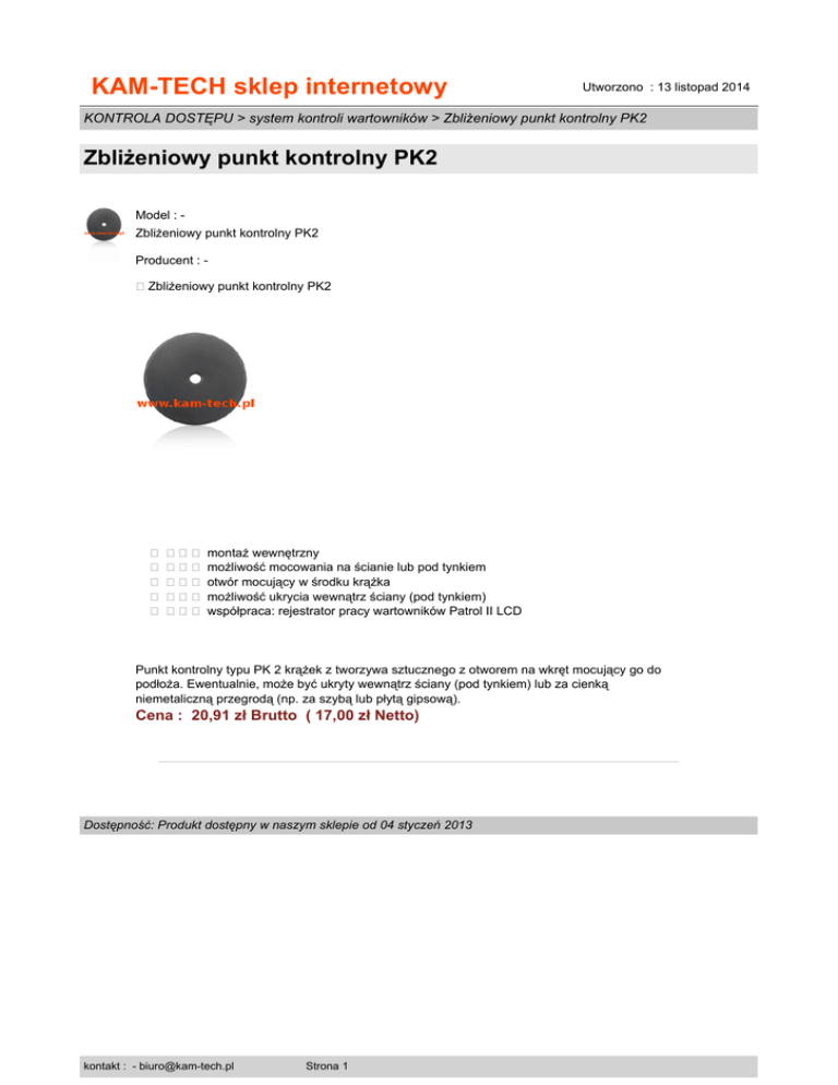 KAM-TECH sklep internetowy Utworzono : 13 listopad 2014 KONTROLA DOSTĘPU > system kontroli wartowników > Zbliżeniowy punkt kontrolny PK2 Zbliżeniowy punkt kontrolny PK2 Model : Zbliżeniowy punkt kontrolny PK2 Producent : �Zbliżeniowy punkt kontrolny PK2 � ��� montaż wewnętrzny � ��� możliwość mocowania na ścianie lub pod tynkiem � ��� otwór mocujący w środku krążka � ��� możliwość ukrycia wewnątrz ściany (pod tynkiem) � ��� współpraca: rejestrator pracy wartowników Patrol II LCD Punkt kontrolny typu PK 2 krążek z tworzywa sztucznego z otworem na wkręt mocujący go do podłoża. Ewentualnie, może być ukryty wewnątrz ściany (pod tynkiem) lub za cienką niemetaliczną przegrodą (np. za szybą lub płytą gipsową). Cena : 20,91 zł Brutto ( 17,00 zł Netto) Dostępność: Produkt dostępny w naszym sklepie od 04 styczeń 2013 kontakt : - [email protected] Strona 1