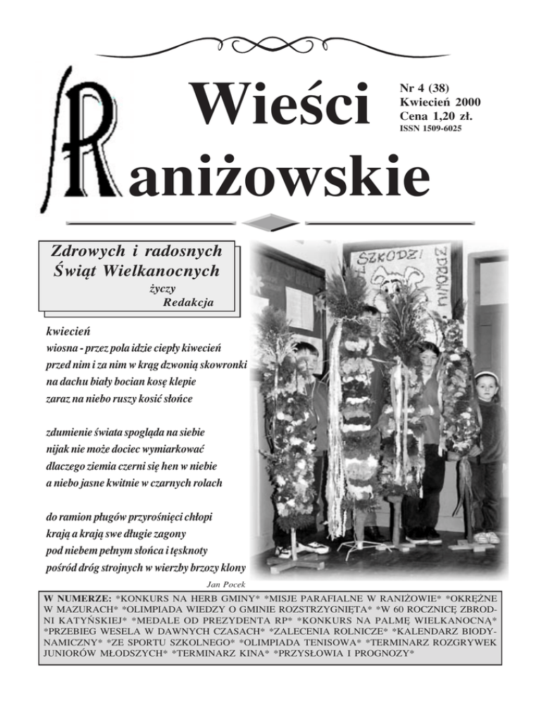 Wieúci aniøowskie Nr 4 (38) KwiecieÒ 2000 Cena 1,20 z≥. ISSN 1509-6025 Zdrowych i radosnych åwiπt Wielkanocnych øyczy Redakcja kwiecieÒ wiosna - przez pola idzie ciep≥y kiwecieÒ przed nim i za nim w krπg dzwoniπ skowronki na dachu bia≥y bocian kosÍ klepie zaraz na niebo ruszy kosiÊ s≥oÒce zdumienie úwiata spoglπda na siebie nijak nie moøe dociec wymiarkowaÊ dlaczego ziemia czerni siÍ hen w niebie a niebo jasne kwitnie w czarnych rolach do ramion p≥ugÛw przyroúniÍci ch≥opi krajπ a krajπ swe d≥ugie zagony pod niebem pe≥nym s≥oÒca i tÍsknoty poúrÛd drÛg strojnych w wierzby brzozy klony Jan Pocek W NUMERZE: *KONKURS NA HERB GMINY* *MISJE PARAFIALNE W RANIØOWIE* *OKR ØNE W MAZURACH* *OLIMPIADA WIEDZY O GMINIE ROZSTRZYGNI TA* *W 60 ROCZNIC ZBRODNI KATY—SKIEJ* *MEDALE OD PREZYDENTA RP* *KONKURS NA PALM WIELKANOCN•* *PRZEBIEG WESELA W DAWNYCH CZASACH* *ZALECENIA ROLNICZE* *KALENDARZ BIODYNAMICZNY* *ZE SPORTU SZKOLNEGO* *OLIMPIADA TENISOWA* *TERMINARZ ROZGRYWEK JUNIOR”W M£ODSZYCH* *TERMINARZ KINA* *PRZYS£OWIA I PROGNOZY* 2 Wieúci Raniøowskie nr 4 (38) HERB DLA GMINY Zarzπd Gminy RaniøÛw og≥asza konkurs na opracowanie HERBU GMINY RANIØ”W, ktÛry w przysz≥oúci sta≥by siÍ wizytÛwkπ i symbolem naszej gminy, znakiem rozpoznawczym umieszczanym na tablicach informacyjnych, pismach o szczegÛlnym znaczeniu dla historii miejscowoúci. W projektach plastycznych sugeruje siÍ uwzglÍdniÊ: f tradycje historyczne, f warunki geograficzne gminy, f barwy stosowne do punktÛw wymienionych powyøej. Do konkursu naleøy przed≥oøyÊ: 1. pracÍ graficznπ wykonanπ na formacie A4, 2. opis herbu, 3. uzasadnienie. Prace konkursowe naleøy sk≥adaÊ do UrzÍdu Gminy w Raniøowie do dnia 31 maja 2000 r. w zapieczÍtowanych kopertach z dopiskiem "HERB GMINY". Do oceny projektÛw herbÛw zostanie powo≥ana specjalna komisja, ktÛra wstÍpnie dokona oceny, po czym projekty wybrane zostanπ przed≥oøone do opinii do Heraldycznego Punktu Konsultacyjnego przy MSWiA. Autor projektu po zatwierdzeniu herbu przez RadÍ Gminy w Raniøowie otrzyma nagrodÍ pieniÍønπ. MISJE PARAFIALNE W RANI¯OWIE "KoúciÛ≥ pielgrzymujπcy jest misyjny ze swej natury, poniewaø swÛj poczπtek bierze wedle planu Ojca z pos≥ania (ex missione) Syna i z pos≥ania Ducha úw." - tak misyjnoúÊ Koúcio≥a okreúla Prawo Kanoniczne i Synod Diecezji Sandomierskiej. Samo s≥owo "misje" pochodzi od ≥aciÒskiego wyrazu mitto - posy≥am, missio - pos≥annictwo, poselstwo. Wywodzi siÍ ten termin od s≥Ûw Chrystusa zapisanych w Ewangelii: "Jako mnie pos≥a≥ Ojciec, tak i Ja was posy≥am idπc na ca≥y úwiat nauczajcie wszystkie narody". Z takπ misjπ wyruszali misjonarze do pogaÒskich krajÛw. RÛøne misje podejmowali takøe ludzie úwieccy. Misje dyplomatyczne, polityczne czy naukowe. W znaczeniu duszpasterskim, misje to uroczyste g≥oszenie S≥owa Boøego w parafii. KoúciÛ≥ praktykuje rÛøne formy g≥oszenia prawd wiary. Podstawowπ formπ ich g≥oszenia dla dzieci jest katechizacja, a dla doros≥ych kazania niedzielne i úwiπteczne, czy homilie sakramentalne. Formπ uroczystπ sπ rekolekcje Wielkopostne czy Adwentowe dla ca≥ej parafii. Sπ takøe organizowane rekolekcje dla poszczegÛlnych grup wiernych: rekolekcje ewangelizacyjne oazowe, czy zamkniÍte. Najuroczystszπ formπ g≥oszenia S≥owa Boøego sπ misje parafialne. Prawo Kanoniczne i Synod Diecezji Sandomierskiej nakazuje organizowaÊ je przynajmniej co 10 lat lub z okazji waønych zbawczych wydarzeÒ. Takim np. waønym wydarzeniem zbawczym jest Jubileusz 2000-lecia narodzenia Chrystusa, ktÛry teraz przeøywamy. Z okazji tego wielkiego Jubileuszu wiary parafia RaniøÛw przeøy≥a misje parafialne. Zbieg≥y siÍ one z terminem misji organizowanych przez parafiÍ od 1960 r. co 10 lat aø po rok 2000 - Jubileuszowy. Misje by≥y poprzedzone d≥ugim przygotowaniem modlitewnym, ktÛre trwa≥o od wielu tygodni i miesiÍcy w parafii. Codziennie np. wierni w tej intencji przed naboøeÒstwami odmawiali KoronkÍ do Mi≥osierdzia Boøego, ko≥a rÛøaÒcowe modli≥y siÍ na rÛøaÒcu, dzieci przygotowywa≥y siÍ do misji na katechizacji. Po takim przygotowaniu misje parafialne rozpoczÍto w drugπ NiedzielÍ Wielkiego Postu w uroczystoúÊ åwiÍtego JÛzefa Patrona Koúcio≥a i zakoÒczono je w NiedzielÍ nastÍpnπ przypadajπcπ po uroczystoúci Zwiastowania NMP 26 marca 2000 r. Nauki misyjne g≥osili wybitni misjonarze diecezjalni: ks. Micha≥ JÛzef- UroczystoúÊ poúwiÍcenia nowego Krzyøa Misyjnego w dniu 24.03.2000 r. czyk - proboszcz parafii w Tarnobrzegu i ks. Franciszek BoguÒ - kustosz Sanktuarium Matki Boøej w Tarnowcu. Przygotowanie duchowe zaowocowa≥o piÍknymi owocami misji w postaci licznej frekwencji i spowiedzi a takøe oøywienia øycia religijnego parafii. ks. Henryk SmaroÒ Wieúci Raniøowskie nr 4 (38) OKR ØNE W MAZURACH W dniu 25 marca 2000 roku WojewÛdzki Dom Kultury w Rzeszowie zorganizowa≥ juø po raz XII wojewÛdzki konkurs "Ludowe obrzÍdy i zwyczaje". Jego celem jest ochrona przed zanikaniem i popularyzacja obrzÍdÛw i zwyczajÛw ludowych a takøe dokumentacja prezentowanych programÛw. Do konkursu zg≥osi≥o siÍ kilkanaúcie zespo≥Ûw z wojewÛdztwa podkarpackiego. WúrÛd nich znalaz≥ siÍ rÛwnieø nasz "eksportowy" zespÛ≥ z MazurÛw z przedstawieniem pn. "OkrÍøne w Mazurach". Akcja widowiska rozgrywa siÍ w chacie gospodarza. Rozpoczyna siÍ pobudkπ wczesnym rankiem. Domownicy szykujπ siÍ do øniwa. WÛwczas przychodzπ do nich sπsiedzi i inni mieszkaÒcy i oferujπ swπ pomoc przy pracy w polu w zamian za odrobek w terminie pÛüniejszym. Wszyscy razem wychodzπ na pole. Wieczorem po skoÒczonej pracy w izbie gospodarza odbywa siÍ wspÛlna zabawa wszystkich øeÒcÛw i wychwalanie cÛrki gospodarza, ktÛra zosta≥a przodownicπ w úcinaniu sierpem zboøa. Naleøy nadmieniÊ, øe akcja rozgrywa siÍ w czasach, gd