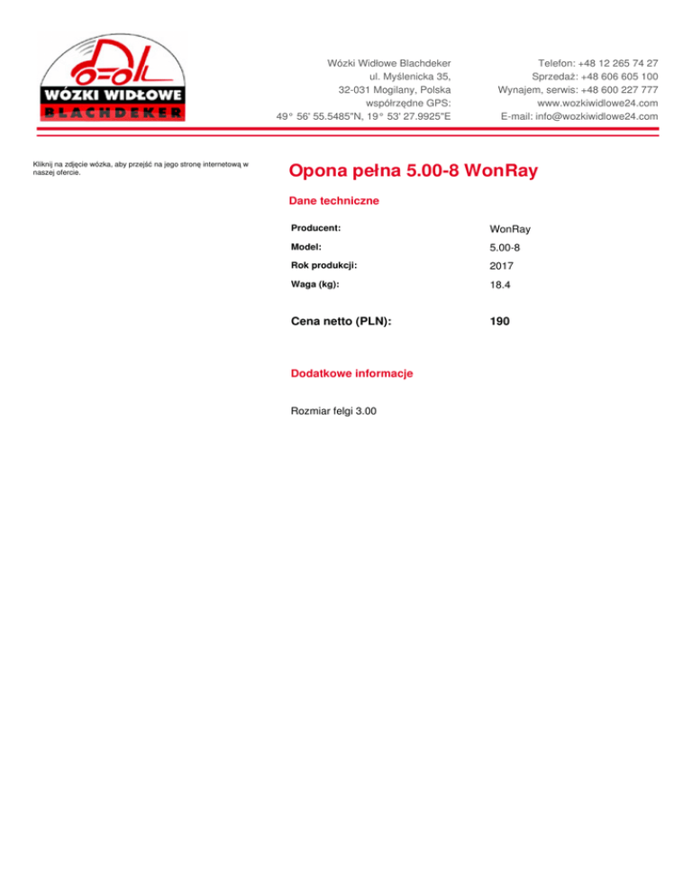 Kliknij na zdjęcie wózka, aby przejść na jego stronę internetową w naszej ofercie. Wózki Widłowe Blachdeker ul. Myślenicka 35, 32-031 Mogilany, Polska współrzędne GPS: 49° 56' 55.5485"N, 19° 53' 27.9925"E Telefon: +48 12 265 74 27 Sprzedaż: +48 606 605 100 Wynajem, serwis: +48 600 227 777 www.wozkiwidlowe24.com E-mail: [email protected] Opona pełna 5.00-8 WonRay Dane techniczne Producent: WonRay Model: 5.00-8 Rok produkcji: 2017 Waga (kg): 18.4 Cena netto (PLN): Dodatkowe informacje Rozmiar felgi 3.00 190