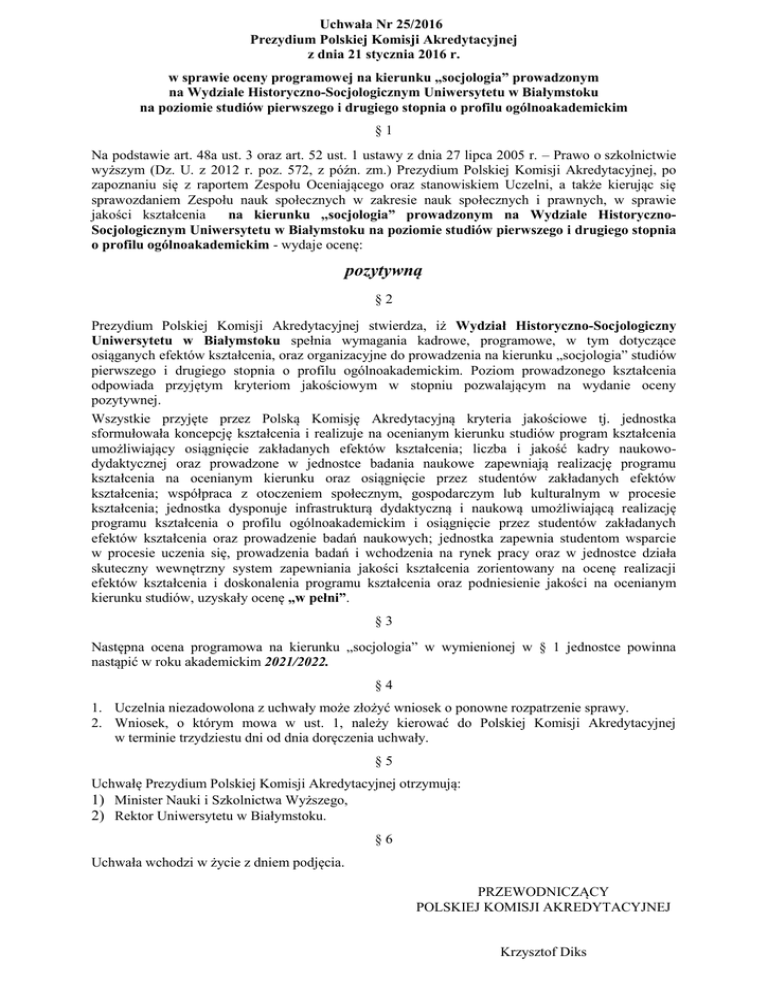 Uchwała Nr 25/2016 Prezydium Polskiej Komisji Akredytacyjnej z dnia 21 stycznia 2016 r. w sprawie oceny programowej na kierunku ,,socjologia” prowadzonym na Wydziale Historyczno-Socjologicznym Uniwersytetu w Białymstoku na poziomie studiów pierwszego i drugiego stopnia o profilu ogólnoakademickim §1 Na podstawie art. 48a ust. 3 oraz art. 52 ust. 1 ustawy z dnia 27 lipca 2005 r. – Prawo o szkolnictwie wyższym (Dz. U. z 2012 r. poz. 572, z późn. zm.) Prezydium Polskiej Komisji Akredytacyjnej, po zapoznaniu się z raportem Zespołu Oceniającego oraz stanowiskiem Uczelni, a także kierując się sprawozdaniem Zespołu nauk społecznych w zakresie nauk społecznych i prawnych, w sprawie jakości kształcenia na kierunku ,,socjologia” prowadzonym na Wydziale HistorycznoSocjologicznym Uniwersytetu w Białymstoku na poziomie studiów pierwszego i drugiego stopnia o profilu ogólnoakademickim - wydaje ocenę: pozytywną §2 Prezydium Polskiej Komisji Akredytacyjnej stwierdza, iż Wydział Historyczno-Socjologiczny Uniwersytetu w Białymstoku spełnia wymagania kadrowe, programowe, w tym dotyczące osiąganych efektów kształcenia, oraz organizacyjne do prowadzenia na kierunku „socjologia” studiów pierwszego i drugiego stopnia o profilu ogólnoakademickim. Poziom prowadzonego kształcenia odpowiada przyjętym kryteriom jakościowym w stopniu pozwalającym na wydanie oceny pozytywnej. Wszystkie przyjęte przez Polską Komisję Akredytacyjną kryteria jakościowe tj. jednostka sformułowała koncepcję kształcenia i realizuje na ocenianym kierunku studiów program kształcenia umożliwiający osiągnięcie zakładanych efektów kształcenia; liczba i jakość kadry naukowodydaktycznej oraz prowadzone w jednostce badania naukowe zapewniają realizację programu kształcenia na ocenianym kierunku oraz osiągnięcie przez studentów zakładanych efektów kształcenia; współpraca z otoczeniem społecznym, gospodarczym lub kulturalnym w procesie kształcenia; jednostka dysponuje infrastrukturą dydaktyczną i naukową umożliwiającą realizację programu kształcenia o profilu ogólnoakademickim i osiągnięcie przez studentów zakładanych efektów kształcenia oraz prowadzenie badań naukowych; jednostka zapewnia studentom wsparcie w procesie uczenia się, prowadzenia badań i wchodzenia na rynek pracy oraz w jednostce działa skuteczny wewnętrzny system zapewniania jakości kształcenia zorientowany na ocenę realizacji efektów kształcenia i doskonalenia programu kształcenia oraz podniesienie jakości na ocenianym kierunku studiów, uzyskały ocenę „w pełni”. §3 Następna ocena programowa na kierunku „socjologia” w wymienionej w § 1 jednostce powinna nastąpić w roku akademickim 2021/2022. §4 1. Uczelnia niezadowolona z uchwały może złożyć wniosek o ponowne rozpatrzenie sprawy. 2. Wniosek, o którym mowa w ust. 1, należy kierować do Polskiej Komisji Akredytacyjnej w terminie trzydziestu dni od dnia doręczenia uchwały. §5 Uchwałę Prezydium Polskiej Komisji Akredytacyjnej otrzymują: 1) Minister Nauki i Szkolnictwa Wyższego, 2) Rektor Uniwersytetu w Białymstoku. §6 Uchwała wchodzi w życie z dniem podjęcia. PRZEWODNICZĄCY POLSKIEJ KOMISJI AKREDYTACYJNEJ Krzysztof Diks