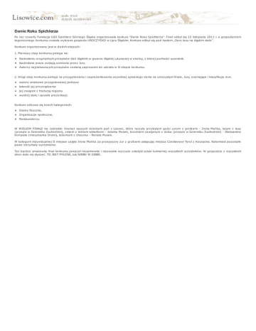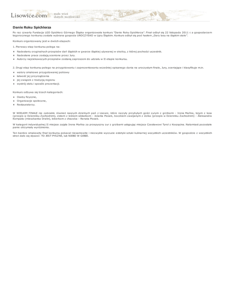 Danie Roku Spichlerza Po raz czwarty Fundacja LGD Spichlerz Górnego Śląska organizowała konkurs "Danie Roku Spichlerza". Finał odbył się 22 listopada 2011 r. a gospodarzem tegorocznego konkursu została wybrana gospoda UROCZYSKO w Lipiu Śląskim. Konkurs odbył się pod hasłem „Dary lasu na śląskim stole”. Konkurs organizowany jest w dwóch etapach: 1. Pierwszy etap konkursu polega na: Nadesłaniu oryginalnych przepisów dań śląskich w gwarze śląskiej używanej w okolicy, z której pochodzi uczestnik. Nadesłane prace zostają ocenione przez Jury. Autorzy najciekawszych przepisów zostaną zaproszeni do udziału w II etapie konkursu. 2. Drugi etap konkursu polega na przygotowaniu i zaprezentowaniu wcześniej opisanego dania na uroczystym finale, Jury, oceniające i klasyfikuje m.in. walory smakowe przygotowanej potrawy łatwość jej przyrządzenia jej związek z tradycją regionu wystrój stołu i sposób prezentacji. Konkurs odbywa się trzech kategoriach: Osoby fizyczne, Organizacje społeczne, Restauratorzy. W WIELKIM FINALE nie zabrakło również naszych dzielnych pań z Lisowic, które raczyły przybyłych gości zurym z grzibami - Irena Mańka, tejym z lasa (przepis w Dzienniku Zachodnim), zistom z leśnom wkładkom - Jolanta Piosek, boczkiem zawijanym z dzika (przepis w Dzienniku Zachodnim) - Aleksandra Kompała (mieszkanka Dralin), leberkom z chazoka - Renata Piosek. W kategorii indywidualnej II miejsce zajęła Irena Mańka za przepyszny zur z grzibami ustępując miejsca Czesławowi Tyrol z Koszęcina. Natomiast pozostałe panie otrzymały wyróżnienia. Ten bardzo smakowity finał konkursu pokazał niesamowite i niezwykłe wyczucie estetyki sztuki kulinarnej wszystkich uczestników. W gospodzie z wszystkich stron dało się słyszeć: TO JEST PYSZNE, lub NIEBO W GEBIE.