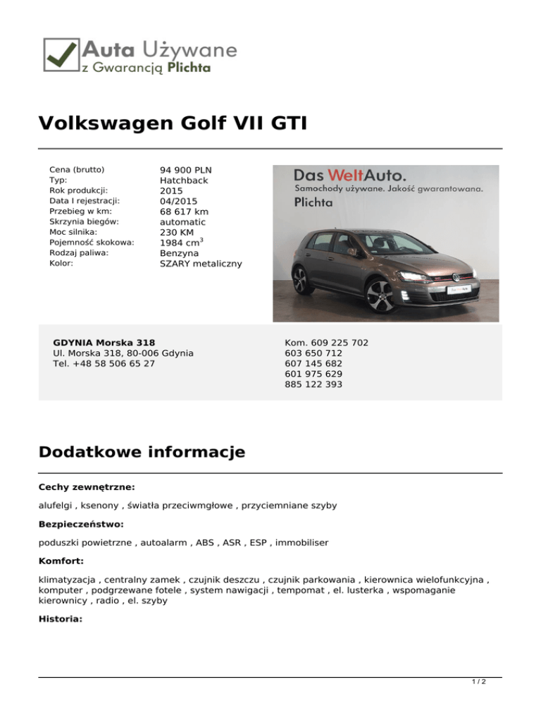 Volkswagen Golf VII GTI Cena (brutto) Typ: Rok produkcji: Data I rejestracji: Przebieg w km: Skrzynia biegów: Moc silnika: Pojemność skokowa: Rodzaj paliwa: Kolor: 94 900 PLN Hatchback 2015 04/2015 68 617 km automatic 230 KM 1984 cm3 Benzyna SZARY metaliczny GDYNIA Morska 318 Ul. Morska 318, 80-006 Gdynia Tel. +48 58 506 65 27 Kom. 609 225 702 603 650 712 607 145 682 601 975 629 885 122 393 Dodatkowe informacje Cechy zewnętrzne: alufelgi , ksenony , światła przeciwmgłowe , przyciemniane szyby Bezpieczeństwo: poduszki powietrzne , autoalarm , ABS , ASR , ESP , immobiliser Komfort: klimatyzacja , centralny zamek , czujnik deszczu , czujnik parkowania , kierownica wielofunkcyjna , komputer , podgrzewane fotele , system nawigacji , tempomat , el. lusterka , wspomaganie kierownicy , radio , el. szyby Historia: 1/2 pierwszy właściciel , bezwypadkowy , serwisowany w ASO Gwarancja Szanowni Państwo, Pragniemy Państwa poinformować, iż firma Plichta – Autoryzowany Dealer Škoda Auto prowadzi skup oraz sprzedaż samochodów używanych wszystkich marek, oferując także samochody używane z gwarancją objęte programem „Auta używane z Gwarancją Plichta”. W ramach programu „Auta Używane z Gwarancją Plichta ” każdy Klient otrzymuje atrakcyjny pakiet zniżek pozwalający zoptymalizować koszty eksploatacji samochodu: -50% na serwis klimatyzacji -50% na ustawienie zbieżności -50% na kosmetykę auta -50% na ścieżkę diagnostyczną -25% na wymiany oleju -25% na zakup opon + 5zł na sezon za hotelowanie opon -15% na części i akcesoria Oferujemy również kompleksową obsługę w zakresie finansowania i ubezpieczenia: - kredyty już od 4,99% - leasingi i kredyty bez zaświadczeń - uproszczone procedury – decyzja już od 30 min. - atrakcyjne pakiety AC/OC/NW/ASS wiodących firm ubezpieczeniowych Możliwość pozostawienia dotychczas użytkowanego auta w rozliczeniu – BEZPŁATNA WYCENA!!! Zapraszamy wszystkich Klientów na jazdę próbną wybranym autem. Numer oferty: E9150 Informacja nie stanowi oferty w rozumieniu art. 66 KC. Podane dane mają charakter wyłącznie informacyjny. 2/2 Powered by TCPDF (www.tcpdf.org)