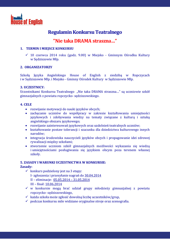 Regulamin Konkursu Teatralnego ”Nie taka DRAMA straszna…” 1. TERMIN I MIEJSCE KONKURSU 10 czerwca 2014 roku (godz. 9.00) w Miejsko - Gminnym Ośrodku Kultury w Sędziszowie Młp. 2. ORGANIZATORZY Szkołą Języka Angielskiego House of English z siedzibą w Ropczycach i w Sędziszowie Młp. i Miejsko - Gminny Ośrodek Kultury w Sędziszowie Młp. 3. UCZESTNICY: Uczestnikami Konkursu Teatralnego „Nie taka DRAMA straszna…” są uczniowie szkół gimnazjalnych z powiatu ropczycko- sędziszowskiego. 4. CELE rozwijanie motywacji do nauki języków obcych; zachęcanie uczniów do współpracy w zakresie kształtowania umiejętności językowych i zdobywania wiedzy na tematy związane z kulturą i sztuką angielskiego obszaru językowego; rozwijanie zainteresowań językowych oraz uzdolnień teatralnych uczniów; kształtowanie postaw tolerancji i szacunku dla dziedzictwa kulturowego innych narodów; integracja środowiska nauczycieli języków obcych i propagowanie idei zdrowej rywalizacji między szkołami; stworzenie uczniom szkół gimnazjalnych możliwości wykazania się wiedzą i umiejętnościami posługiwania się językiem obcym poza terenem własnej szkoły. 5. ZASADY I WARUNKI UCZESTNICTWA W KONKURSIE: Zasady: konkurs podzielony jest na 3 etapy: I- zgłoszenia i przesyłanie nagrań do 30.04.2014 II – eliminacje: 05.05.2014 – 31.05.2014 III – finał: 10.06.2014 w konkursie mogą brać udział grupy młodzieży gimnazjalnej z powiatu ropczycko- sędziszowskiego, każda szkoła może zgłosić dowolną liczbę uczestników/grup, podczas konkursu mile widziane oryginalne stroje oraz scenografia. Warunki: Uczestnicy przygotowują jeden spektakl w języku angielskim nagrany na kamerze, telefonie komórkowym czy tablecie i przesyłają na adres mailowy: [email protected] do dnia 30.04.2014 spośród wszystkich uczestników Jury wybiera 10 grup, które zaprezentują swoje wykonanie podczas konkursu piosenki obcojęzycznej; w czasie prezentacji dozwolone jest wykorzystanie środków artystycznych (mimika, gesty, ruch, strój, rekwizyty oraz inne pomoce techniczne), uczestnicy przygotowują sztukę teatralną trwającą nie dłużej niż 15 minut, formularze zgłoszeniowe (wypełnione drukowanymi literami) należy przysłać drogą mailową lub dostarczyć osobiście do ORGANIZATORA: House of English ul. Konopnickiej 2, 39-100 Ropczyce z dopiskiem “Nie taka DRAMA straszna…” 6. KRYTERIA OCENY I NAGRÓD Organizatorzy Konkursu Teatralnego „Nie taka DRAMA straszna…” powołują Jury, które oceniać będzie poprawność językowa spektaklu, walory teatralne, interpretację sztuki, poziom trudności przedstawianej sztuki, umiejętności warsztatowe (strój, kreatywność, itp.), ogólne wrażenia artystyczne, o przyznaniu nagród decyduje Jury. 7. DODATKOWE INFORMACJE i UWAGI KOŃCOWE Wykonawcom zapewniamy sprzęt nagłaśniający, możliwość korzystania z odtwarzacza CD, laptopa, projektora, tablicy interaktywnej, decyzje jury są ostateczne, niepełnoletnim uczestnikom konkursu musi towarzyszyć pełnoletni opiekun lub rodzic, uczestnik konkursu zezwala na wykorzystanie i przetwarzanie danych zawartych w karcie zgłoszenia, sprawy nie ujęte w regulaminie rozstrzyga organizator. House of English zaprasza do wspólnej ZABAWY! ORGANIZATOR : House of English Kontakt: Ropczyce – tel. : +48 17 222 70 96 Sędziszów Młp.: tel. 794 770 170 e-mail: [email protected] strona internetowa: www.houseofenglish.com.pl