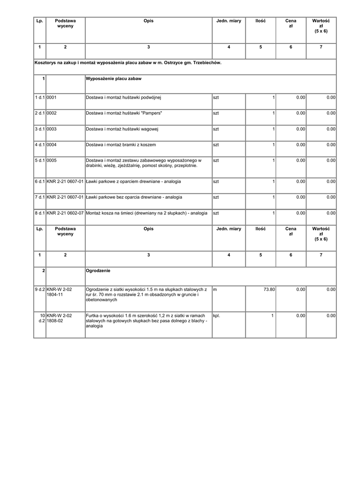 Lp. Podstawa wyceny Opis Jedn. miary Ilość Cena zł Wartość zł (5 x 6) 1 2 3 4 5 6 7 Kosztorys na zakup i montaż wyposażenia placu zabaw w m. Ostrzyce gm. Trzebiechów. 1 Wyposażenie placu zabaw 1 d.1 0001 Dostawa i montaż huśtawki podwójnej szt 1 0.00 0.00 2 d.1 0002 Dostawa i montaż huśtawki "Pampers" szt 1 0.00 0.00 3 d.1 0003 Dostawa i montaż huśtawki wagowej szt 1 0.00 0.00 4 d.1 0004 Dostawa i montaż bramki z koszem szt 1 0.00 0.00 5 d.1 0005 Dostawa i montaż zestawu zabawowego wyposażonego w drabinki, wieżę, zjeżdżalnię, pomost skośny, przeplotnie. szt 1 0.00 0.00 6 d.1 KNR 2-21 0607-01 Ławki parkowe z oparciem drewniane - analogia szt 1 0.00 0.00 7 d.1 KNR 2-21 0607-01 Ławki parkowe bez oparcia drewniane - analogia szt 1 0.00 0.00 8 d.1 KNR 2-21 0602-07 Montaż kosza na śmieci (drewniany na 2 słupkach) - analogia szt 1 0.00 0.00 Lp. Podstawa wyceny Opis Jedn. miary Ilość Cena zł Wartość zł (5 x 6) 1 2 3 4 5 6 7 2 Ogrodzenie 9 d.2 KNR-W 2-02 1804-11 Ogrodzenie z siatki wysokości 1.5 m na słupkach stalowych z rur śr. 70 mm o rozstawie 2.1 m obsadzonych w gruncie i obetonowanych m 10 KNR-W 2-02 d.2 1808-02 Furtka o wysokości 1.6 m szerokość 1,2 m z siatki w ramach stalowych na gotowych słupkach bez pasa dolnego z blachy analogia kpl. 73.80 0.00 0.00 1 0.00 0.00