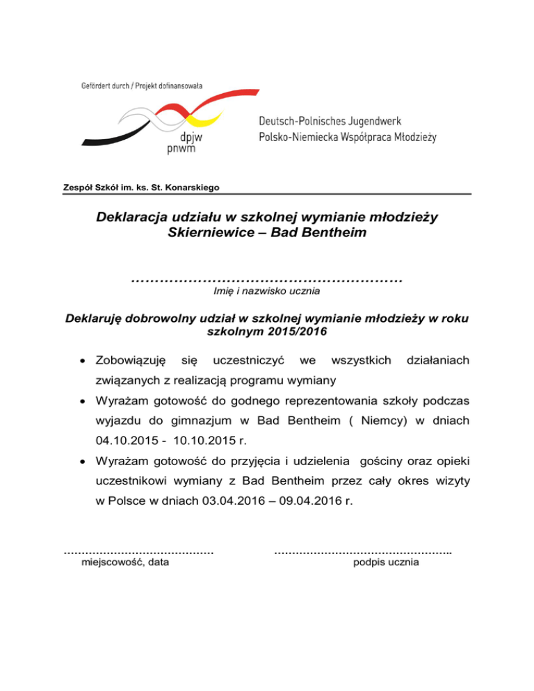 Zespół Szkół im. ks. St. Konarskiego Deklaracja udziału w szkolnej wymianie młodzieży Skierniewice – Bad Bentheim ………………………………………………… Imię i nazwisko ucznia Deklaruję dobrowolny udział w szkolnej wymianie młodzieży w roku szkolnym 2015/2016 Zobowiązuję się uczestniczyć we wszystkich działaniach związanych z realizacją programu wymiany Wyrażam gotowość do godnego reprezentowania szkoły podczas wyjazdu do gimnazjum w Bad Bentheim ( Niemcy) w dniach 04.10.2015 - 10.10.2015 r. Wyrażam gotowość do przyjęcia i udzielenia gościny oraz opieki uczestnikowi wymiany z Bad Bentheim przez cały okres wizyty w Polsce w dniach 03.04.2016 – 09.04.2016 r. …………………………………… miejscowość, data ………………………………………….. podpis ucznia