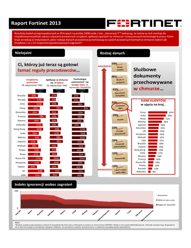 Raport Fortinet 2013 Rezultaty badań przeprowadzonych w 20 krajach na próbie 3200 osób z tzw. „Generacji-Y”* pokazują, że rośnie w nich niechęć do respektowania polityki zakazu używania prywatnych urządzeń, aplikacji opartych na chmurze i nowoczesnych technologii w pracy. Które kraje przodują w statystykach, jakie rodzaje danych pracownicy przechowują na swoich prywatnych kontach w chmurze (takich jak Dropbox) i co z ich znajomością podstawowych zagrożeń? Nielojalni Rodzaj danych Ci, którzy już teraz są gotowi łamać reguły pracodawców… Urządzenia przenośne (% odpowiedzi TAK) Średnio 51% Brazylia 39% Aplikacje w chmurze np. Dropbox (% odpowiedzi TAK) 31% Chile 60% 32% Niemcy 42% 70% 49% Holandia 57% Hong Kong Indie Włochy Japonia Meksyk Polska Rosja 60% Tajwan UK USA 50% 33% 48% 28% 45% 33% 35% 44% 50% 52% 51% 37% 29% 40% 50% 47% 57% 51% 25% 28% 39% 40% 32% 35% 63% 53% 71% 33% 42% 43% Korea Pd. Hiszpania 51% 45% 36% Służbowe dokumenty przechowywane w chmurze… DANE KLIENTÓW w ujęciu na kraj… 48% 46% Francja Średnio 48% 32% 24% Chiny odpowiedzi TAK/MOŻE) 27% 61% Kolumbia Technologie „samonośne” np. Google Glass (% Średnio 36% Kanada NAJCZĘŚCIEJ 57% 58% 56% 47% 52% 44% 52% 55% 49% 42% 51% NAJRZADZIEJ Chiny Indie Rosja Włochy Japonia Kolumbia UK Hiszpania Meksyk USA Brazylia Tajwan Hong Kong Chile Niemcy Francja Korea Pd. Polska Kanada Holandia 64% 59% 52% 46% 36% 35% 33% 33% 32% 31% 30% 30% 29% 27% 24% 20% 18% 16% 13% 8% 46% Indeks ignorancji wobec zagrożeń 100 Rozumiem Obiło mi się o uszy Nigdy nie słyszałem 0 Nota *Badanie zostało przeprowadzone w dniach 9-13 października 2013 roku w 20 krajach na świecie na zlecenie firmy FORTINET. Wzięło w nim udział 3200 badanych (ok. 150 osób na każdy kraj). Respondenci na co dzień korzystają ze smartfonów, laptopów i tabletów. Są zatrudnieni w pełnym wymiarze pracy i w większości posiadają wyższe wykształcenie.