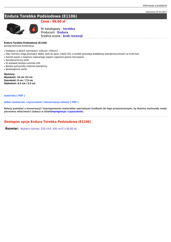 Informacje o produkcie Utworzono 07-03-2017 Endura Torebka Podsiodowa (E1106) Cena : 99,00 zł Nr katalogowy : torebka Producent : Endura Średnia ocena : brak recenzji Endura Torebka Podsiodowa (E1106) Aerodynamiczna konstrukcja ● ● ● ● ● ● ● Dostępne w dwóch rozmiarach: 220cm3 i 430cm3 Oba rozmiary mogą pomieścić dętkę, łyżki do opon, nabój CO2, a torebki posiadają dodatkową zewnętrzną kieszeń na multi-tool Szeroki pasek z neoprenu zapinanego rzepem zapewnia pewne mocowanie Aerodynamiczny profil W zestawie lamkpa Luminite LED Bardzo wytrzymały materiał zewnętrzny Wodoodporne zamki Wymiary: Wysokość: 14 cm /13 cm Szerokość: 8 cm / 7.5 cm Głębokość: 6.5 cm / 5.5 cm materiały [ PDF ] dobór rozmiarów, czyszcczenie i konserwacja odzieży [ PDF ] Należy pamiętać o konserwacji i impregnowaniu materiałów specialnymi środkami do tego przeznaczonymi, by tkaniny zachowały swoje pierwotne właściwości (zobacz w dzialeImpregnacja i czyszczenie). Dostępne opcje Endura Torebka Podsiodowa (E1106) Rozmiar: Wybierz rozmiar, 220 cm3, 430 cm3 (+30,00 zł).