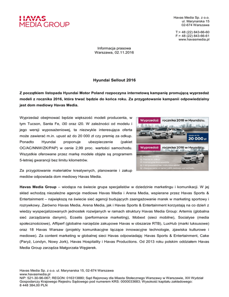 Havas Media Sp. z o.o. ul. Marynarska 15 02-674 Warszawa T:+ 48 (22) 843-66-60 F:+ 48 (22) 843-66-61 www.havasmedia.pl Informacja prasowa Warszawa, 02.11.2016 Hyundai Sellout 2016 Z początkiem listopada Hyundai Motor Poland rozpoczyna internetową kampanię promującą wyprzedaż modeli z rocznika 2016, która trwać będzie do końca roku. Za przygotowanie kampanii odpowiedzialny jest dom mediowy Havas Media. Wyprzedaż obejmować będzie większość modeli producenta, w tym Tucson, Santa Fe, i30 oraz i20. W zależności od modelu i jego wersji wyposażeniowej, ta niezwykle interesująca oferta może zawierać m.in. upust aż do 20 000 zł czy premię za odkup. Ponadto Hyundai proponuje ubezpieczenie (pakiet OC/AC/NNW/ZK/PAP) w cenie 2,99 proc. wartości samochodu. Wszystkie oferowane przez markę modele objęte są programem 5-letniej gwarancji bez limitu kilometrów. Za przygotowanie materiałów kreatywnych, planowanie i zakup mediów odpowiada dom mediowy Havas Media. Havas Media Group – wiodąca na świecie grupa specjalistów w dziedzinie marketingu i komunikacji. W jej skład wchodzą niezależne agencje mediowe Havas Media i Arena Media, wspierane przez Havas Sports & Entertainment – największą na świecie sieć agencji budujących zaangażowanie marek w marketing sportowy i rozrywkowy. Zarówno Havas Media, Arena Media, jak i Havas Sports & Entertainment korzystają na co dzień z wiedzy wyspecjalizowanych jednostek rozwijanych w ramach struktury Havas Media Group: Artemis (globalna sieć zarządzania danymi), Ecselis (performance marketing), Mobext (sieci mobilne), Socialyse (media społecznościowe), Affiperf (globalne narzędzie zakupowe Havas w obszarze RTB), LuxHub (marki luksusowe) oraz 18 Havas Warsaw (projekty komunikacyjne łączące innowacyjne technologie, zjawiska kulturowe i mediowe). Za content marketing w globalnej sieci Havas odpowiadają: Havas Sports & Entertainment, Cake (Paryż, Londyn, Nowy Jork), Havas Hospitality i Havas Productions. Od 2013 roku polskim oddziałem Havas Media Group zarządza Małgorzata Węgierek. Havas Media Sp. z o.o. ul. Marynarska 15, 02-674 Warszawa www.havasmedia.pl NIP: 521-30-96-067; REGON: 016313880; Sąd Rejonowy dla Miasta Stołecznego Warszawy w Warszawie, XIII Wydział Gospodarczy Krajowego Rejestru Sądowego pod numerem KRS: 0000033683; Wysokość kapitału zakładowego: 8 448 384,00 PLN Dodatkowe informacje: Karolina Szaflarska PR Kwadrat [email protected] Tel. 606 254 700 Anna Wodzyńska Havas Media Group [email protected] Tel. 607 167 503