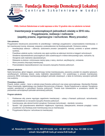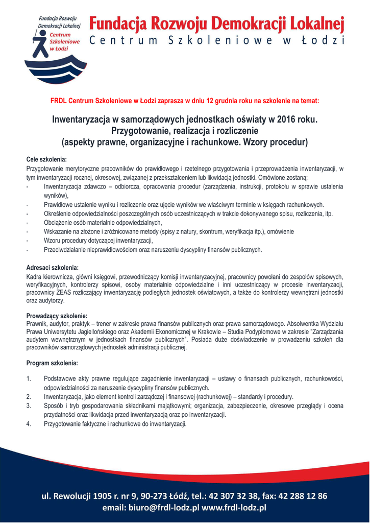 FRDL Centrum Szkoleniowe w Łodzi zaprasza w dniu 12 grudnia roku na szkolenie na temat: Inwentaryzacja w samorządowych jednostkach oświaty w 2016 roku. Przygotowanie, realizacja i rozliczenie (aspekty prawne, organizacyjne i rachunkowe. Wzory procedur) Cele szkolenia: Przygotowanie merytoryczne pracowników do prawidłowego i rzetelnego przygotowania i przeprowadzenia inwentaryzacji, w tym inwentaryzacji rocznej, okresowej, związanej z przekształceniem lub likwidacją jednostki. Omówione zostaną: Inwentaryzacja zdawczo – odbiorcza, opracowania procedur (zarządzenia, instrukcji, protokołu w sprawie ustalenia wyników), Prawidłowe ustalenie wyniku i rozliczenie oraz ujęcie wyników we właściwym terminie w księgach rachunkowych. Określenie odpowiedzialności poszczególnych osób uczestniczących w trakcie dokonywanego spisu, rozliczenia, itp. Obciążenie osób materialnie odpowiedzialnych, Wskazanie na złożone i zróżnicowane metody (spisy z natury, skontrum, weryfikacja itp.), omówienie Wzoru procedury dotyczącej inwentaryzacji, Przeciwdziałanie nieprawidłowościom oraz naruszeniu dyscypliny finansów publicznych. Adresaci szkolenia: Kadra kierownicza, główni księgowi, przewodniczący komisji inwentaryzacyjnej, pracownicy powołani do zespołów spisowych, weryfikacyjnych, kontrolerzy spisowi, osoby materialnie odpowiedzialne i inni uczestniczący w procesie inwentaryzacji, pracownicy ZEAS rozliczający inwentaryzację podległych jednostek oświatowych, a także do kontrolerzy wewnętrzni jednostki oraz audytorzy. Prowadzący szkolenie: Prawnik, audytor, praktyk – trener w zakresie prawa finansów publicznych oraz prawa samorządowego. Absolwentka Wydziału Prawa Uniwersytetu Jagiellońskiego oraz Akademii Ekonomicznej w Krakowie – Studia Podyplomowe w zakresie "Zarządzania audytem wewnętrznym w jednostkach finansów publicznych”. Posiada duże doświadczenie w prowadzeniu szkoleń dla pracowników samorządowych jednostek administracji publicznej. Program szkolenia: 1. 2. 3. 4. Podstawowe akty prawne regulujące zagadnienie inwentaryzacji – ustawy o finansach publicznych, rachunkowości, odpowiedzialności za naruszenie dyscypliny finansów publicznych. Inwentaryzacja, jako element kontroli zarządczej i finansowej (rachunkowej) – standardy i procedury. Sposób i tryb gospodarowania składnikami majątkowymi; organizacja, zabezpieczenie, okresowe przeglądy i ocena przydatności oraz likwidacja przed inwentaryzacją oraz po inwentaryzacji. Przygotowanie faktyczne i rachunkowe do inwentaryzacji. ul. Rewolucji 1905 r. nr 9, 90-273 Łódź, tel.: 42 632 63 19, fax: 42 288 12 86 email: [email protected] www.frdl-lodz.pl 5. 6. 7. 8. 9. 10. 11. 12. 13. 14. 15. 16. Rodzaje inwentaryzacji – częstotliwość, terminowość i sposób jej przeprowadzenia w zależności od rodzaju posiadanego majątku (aktywa, pasywa). Inwentaryzacja zbiorów bibliotecznych – szkolne biblioteki, publiczne biblioteki samorządowe. Zasady wyceny darowizn i nadwyżek oraz niedoborów. Zadania i odpowiedzialność kierownika jednostki. Obowiązki głównego księgowego (skarbnika), członków komisji inwentaryzacyjnej, zespołów spisowych, przewodniczącego oraz osób materialnie i służbowo odpowiedzialnych za powierzone mienie (dochodzenie roszczeń). Zasady i sposoby powoływania pracowników jednostki do funkcji i prac związanych z przeprowadzeniem inwentaryzacji. Procedury – zarządzenie kierownika jednostki w sprawie przeprowadzenia inwentaryzacji wraz z instrukcją inwentaryzacyjną i niezbędnymi załącznikami (świadczenia osób materialnie odpowiedzialnych, zestawienia różnic, sprawozdanie opisowe z przebiegu spisu z natury, sprawozdanie końcowe z ustalenia wyników, itp. (wzory załączone do materiałów szkoleniowych). Dokumentacja inwentaryzacyjna: arkusze spisu z natury, potwierdzenie sald, weryfikacja. Rozliczenie inwentaryzacji: ustalenie różnic (niedobory, nadwyżki), wyjaśnienie różnic i przyczyn ich powstania, rozliczenie różnic w księgach rachunkowych. Odpowiedzialność materialna za ujawnione, zawinione niedobory (tryb postępowania), obciążenie i rozliczenie finansowe zawinionych i niezawinionych niedoborów, granice odpowiedzialności majątkowej pracowników. Naruszenie dyscypliny finansów publicznych związane z inwentaryzacją - najczęstsze nieprawidłowości i jak ich uniknąć. Procedury. ul. Rewolucji 1905 r. nr 9, 90-273 Łódź, tel.: 42 632 63 19, fax: 42 288 12 86 email: [email protected] www.frdl-lodz.pl Informacje organizacyjne i warunki zgłoszeń: Szkolenie odbędzie się w siedzibie FRDL Centrum Szkoleniowego w Łodzi, ul. Rewolucji 1905 roku nr 9, II PIĘTRO (DOMOFON NR 36) 12 grudnia 2016 r. w godzinach 10.00 – 15.00. Cena szkolenia wynosi 290 zł netto przy zgłoszeniu do 1 grudnia. Cena po 1 grudnia wynosi 319 zł netto. RABAT 10% dla drugiej i następnej osoby z tej samej instytucji. Zwolnione z VAT w przypadku finansowania ze środków publicznych. W cenie szkolenia materiały szkoleniowe, zaświadczenie, lunch oraz przerwy kawowe. Płatność przelewem na podstawie wystawionej faktury w dniu szkolenia. Prosimy o przesyłanie zgłoszeń 6 grudnia 2016 r. na adres mailowy [email protected] wysyłając uzupełnioną kartę zgłoszenia faksem na numer wysyłając uzupełnioną kartę zgłoszenia 42 / 288 12 86 przez formularz elektroniczny zamieszczony na www.frdl-lodz.pl Szkolenia realizujemy również w formie zamkniętej na terenie instytucji. Zapytania prosimy kierować na adres mailowy [email protected] Zgłoszenie na szkolenie nt. Inwentaryzacja w samorządowych jednostkach oświaty w 2016 roku. Przygotowanie, realizacja i rozliczenie (aspekty prawne, organizacyjne i rachunkowe. Wzory procedur). w dniu 12 grudnia 2016 r. Instytucja (dane do faktury) …………………………………………………………………………………………………………………………………………