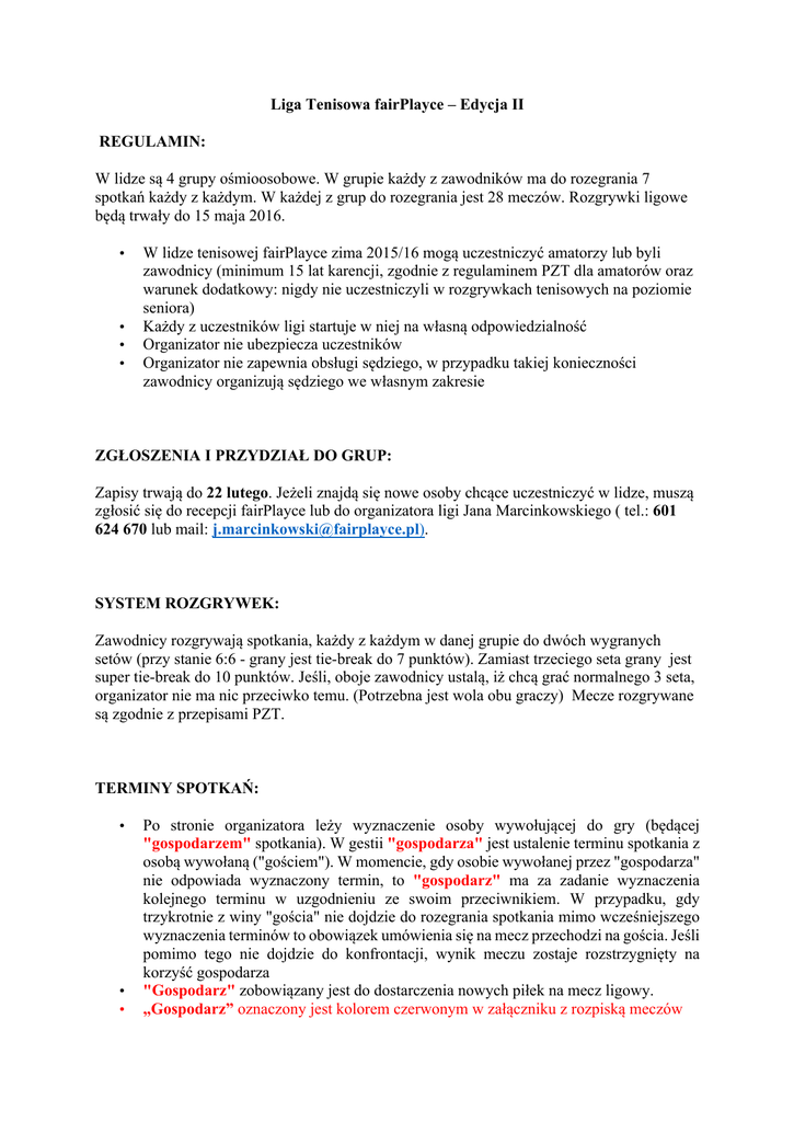 Liga Tenisowa fairPlayce – Edycja II REGULAMIN: W lidze są 4 grupy ośmioosobowe. W grupie każdy z zawodników ma do rozegrania 7 spotkań każdy z każdym. W każdej z grup do rozegrania jest 28 meczów. Rozgrywki ligowe będą trwały do 15 maja 2016. W lidze tenisowej fairPlayce zima 2015/16 mogą uczestniczyć amatorzy lub byli zawodnicy (minimum 15 lat karencji, zgodnie z regulaminem PZT dla amatorów oraz warunek dodatkowy: nigdy nie uczestniczyli w rozgrywkach tenisowych na poziomie seniora) • Każdy z uczestników ligi startuje w niej na własną odpowiedzialność • Organizator nie ubezpiecza uczestników • Organizator nie zapewnia obsługi sędziego, w przypadku takiej konieczności zawodnicy organizują sędziego we własnym zakresie • ZGŁOSZENIA I PRZYDZIAŁ DO GRUP: Zapisy trwają do 22 lutego. Jeżeli znajdą się nowe osoby chcące uczestniczyć w lidze, muszą zgłosić się do recepcji fairPlayce lub do organizatora ligi Jana Marcinkowskiego ( tel.: 601 624 670 lub mail: [email protected]). SYSTEM ROZGRYWEK: Zawodnicy rozgrywają spotkania, każdy z każdym w danej grupie do dwóch wygranych setów (przy stanie 6:6 - grany jest tie-break do 7 punktów). Zamiast trzeciego seta grany jest super tie-break do 10 punktów. Jeśli, oboje zawodnicy ustalą, iż chcą grać normalnego 3 seta, organizator nie ma nic przeciwko temu. (Potrzebna jest wola obu graczy) Mecze rozgrywane są zgodnie z przepisami PZT. TERMINY SPOTKAŃ: Po stronie organizatora leży wyznaczenie osoby wywołującej do gry (będącej "gospodarzem" spotkania). W gestii "gospodarza" jest ustalenie terminu spotkania z osobą wywołaną ("gościem"). W momencie, gdy osobie wywołanej przez "gospodarza" nie odpowiada wyznaczony termin, to "gospodarz" ma za zadanie wyznaczenia kolejnego terminu w uzgodnieniu ze swoim przeciwnikiem. W przypadku, gdy trzykrotnie z winy "gościa" nie dojdzie do rozegrania spotkania mimo wcześniejszego wyznaczenia terminów to obowiązek umówienia się na mecz przechodzi na gościa. Jeśli pomimo tego nie dojdzie do konfrontacji, wynik meczu zostaje rozstrzygnięty na korzyść gospodarza • "Gospodarz" zobowiązany jest do dostarczenia nowych piłek na mecz ligowy. • „Gospodarz” oznaczony jest kolorem czerwonym w załączniku z rozpiską meczów • Osoba ("Gospodarz") chcąca rozegrać mecz ligowy powinna podjąć poniższe kroki: 1. 2. 3. 4. 5. Ustalić termin spotkania poprzez umówienie się na konkretny dzień i godzinę. Zadzwonić do recepcji w celu rezerwacji kortu. Powiadomić smsowo bądź mailowo opiekuna ligi o terminie rozgrywanego meczu. Pobrać protokół meczowy z recepcji przed rozegraniem meczu. Wypełnić protokół meczowy i zostawić go w recepcji klubu. PUNKTACJA: Każde zwycięstwo premiowane jest 30 punktami, przegrana 10 punktem, mecz nierozegrany (osoba oddająca walkowera) to 0 punktów. O pozycji w lidze decydują: punkty, sety, gemy; w przypadku takiej samej liczby punktów pomiędzy dwoma zawodnikami decyduje wynik bezpośredniego spotkania, natomiast jeżeli takich zawodników jest więcej decyduje stosunek setów, gemów oraz punktów AKTUALIZACJA WYNIKÓW W TABELACH: Wyniki z rozegranych meczów będą aktualizowane i udostępniane na naszej stronie www.fairplayce.pl w zakładce ligi w każdą niedzielę około godziny 22:30 ze względu na charakter rozgrywek. OPŁATY: Opłata za udział w Lidze Tenisa fairPlayce 2016 to jednorazowe wpisowe w wysokości 70 zł od osoby na początku sezonu. Opłaty za wynajem kortu w Parku Rekreacyjno Sportowym fairPlayce dla osób zapisanych do Ligi obowiązują zgodnie z poniższym cennikiem: Poniedziałek – Piątek 7:00 – 11:00 75 zł/h lub 110 zł/1,5h 11:00 – 16:00 50 zł/h lub 75 zł/1,5h 16:00 – 23:00 100 zł/h lub 150 zł/1,5h Sobota 7:00 – 11:00 100 zł/h lub 150 zł/1,5h 11:00 – 23:00 50 zł/h lub 75 zł/1,5h Niedziela 7:00 – 23:00 50 zł/h lub 75 zł/1,5h Wpisowe należy uregulować najpóźniej przed rozegraniem pierwszego meczu ligowego. AWANSE I SPADKI: Po każdym terminie końcowym danej edycji ligi nastąpi podsumowanie i podliczenie wyników. Zgodnie z regulaminem rozgrywek w danym terminie zostaną wyznaczone przez organizatora osoby, zajmujące odpowiednio drugie i trzecie miejsce od końca w grupie 1 oraz osoby zajmujące drugie i trzecie miejsce w grupie 2. Zawodnicy z grupy 1 zajmujący odpowiednio drugie i trzecie miejsce od końca będą walczyli o utrzymanie w swojej grupie z zawodnikami zajmującymi miejsca 2 i 3 w grupie 2. Natomiast zawodnicy z grupy 2 zajmujący miejsca drugie i trzecie będą rozgrywali mecze barażowe, o ewentualny awans do ligi wyższej z zawodnikami zajmującymi drugie i trzecie miejsce od końca w grupie 1. Osoba zajmująca ostatnie miejsce w grupie 1 automatycznie spada do grupy 2. A osoba zajmująca 1 miejsce w grupie 2 automatycznie awansuje do grupy 1. Organizator zastrzega sobie możliwość zmiany sposobu rozgrywania meczów barażowych o awans i utrzymanie w poszczególnych grupach ligi. W pozostałych grupach awans i spadek będzie wyglądał analogicznie do przykładu opisanego powyżej. Zostanie stworzony RANKING zawodników LIGI TENISOWEJ zgodnie z ich wynikami. Wszelkie pytania i pojawiające się nieścisłości prosimy kierować do organizatora ligi: Jan Marcinkowski, tel. 601 624 670, [email protected]