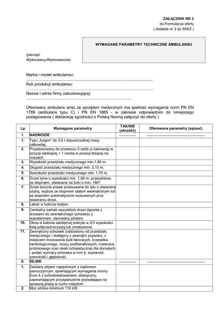 ZAŁĄCZNIK NR 2 do Formularza oferty ( dodatek nr 3 do SIWZ ) WYMAGANE PARAMETRY TECHNICZNE AMBULANSU (pieczęć Wykonawcy/Wykonawców) Marka i model ambulansu: ................................................................................................................ Rok produkcji ambulansu: …………………………………………………………………………………. Nazwa i adres firmy zabudowującej: …………………………………………………………………… Oferowany ambulans wraz ze sprzętem medycznym ma spełniać wymagania norm PN EN 1789 (ambulans typu C) i PN EN 1865 - w zakresie odpowiednim do niniejszego postępowania ( deklarację zgodności z Polską Normą załączyć do oferty ) Lp I. 1. 2. 3. 4. 5. 6. 7. 8. 9. 10. 11. II. 1. 2. Wymagane parametry TAK/NIE (określić) -------------- NADWOZIE Typu „furgon” do 3,5 t dopuszczalnej masy całkowitej. Przystosowany do przewozu 5 osób (z kierowcą) w pozycji siedzącej + 1 osoba w pozycji leŜącej na noszach. Wysokość przedziału medycznego min.1,80 m. Długość przedziału medycznego min. 3,13 m. Szerokość przedziału medycznego min. 1,70 m. Drzwi tylne o wysokości min. 1,80 m, przeszklone, ze stopniem, otwierane na boki o min. 180º. Drzwi boczne prawe przesuwane do tyłu z otwieraną szybą, wyjście ze stopniem stałym wewnętrznym lub ze stopniem automatycznie wysuwanym przy otwieraniu drzwi. Lakier w kolorze białym. Centralny zamek wszystkich drzwi (łącznie z drzwiami do zewnętrznego schowka) z autoalarmem, sterowany pilotem. Okna w kabinie sanitarnej pokryte w 2/3 wysokości folią półprzeźroczystą lub zmatowione. Zewnętrzny schowek (oddzielony od przedziału medycznego i dostępny z zewnątrz pojazdu), z miejscem mocowania butli tlenowych, krzesełka kardiologicznego, noszy podbierakowych, materaca próŜniowego oraz deski ortopedycznej dla dorosłych - podać wymiary schowka w mm tj. wysokość, szerokość i głębokość. SILNIK -------------Zasilany olejem napędowym z zapłonem samoczynnym, spełniającym wymagania normy Euro 4 z turbodoładowaniem, elastyczny, zapewniającym przyspieszenie pozwalające na sprawną pracę w ruchu miejskim Moc silnika minimum 110 kW. Oferowane parametry (opisać) ----------------------------------------------- ----------------------------------------------- 3. III. 1. Pojemność silnika nie mniejsz niŜ 2464 cm3 ZESPÓŁ PRZENIESIENIA NAPĘDU Skrzynia biegów manualna, zsynchronizowana, min. 5 –biegów do przodu i bieg wsteczny 2. Napęd na koła przednie lub tylne. 3. Elektroniczny system stabilizacji toru jazdy (ESP). IV. ZAWIESZENIE 1. Gwarantujące dobrą przyczepność kół do nawierzchni, stabilność i manewrowość w trudnym terenie, umoŜliwiające komfortowy przewóz pacjentów. 2. Fabryczny stabilizator osi przedniej i tylnej lub fabryczne zawieszenie pneumatyczne lub fabryczne zawieszenie niezaleŜne (fabryczne tj. będące oryginalnym wyposaŜeniem pojazdu bazowego). V. UKŁAD HAMULCOWY 1. Systemem ABS zapobiegający blokadzie kół podczas hamowania. 2. Elektroniczny system podziału siły hamowania. 3. System zapobiegający poślizgowi kół osi napędzanej. 4. System wspomagania nagłego hamowania. VI. UKŁAD KIEROWNICZY 1. Ze wspomaganiem. 2. Regulowana kolumna kierownicy w minimum dwóch płaszczyznach lub regulacja fotela kierowcy w minimum 3 płaszczyznach ( łącznie z regulacją kąta oparcia fotela kierowcy i połoŜenia wysokości siedzenia ) VII. OGRZEWANIE I WENTYLACJA 1. Ogrzewanie przedziału medycznego cieczą chłodzącą silnik poprzez nagrzewnicę zamontowaną w przedziale medycznym. 2. Ogrzewanie postojowe – grzejnik elektryczny z sieci 230 V z moŜliwością ustawienia temperatury i termostatem, min. moc grzewcza 2000 W. 3. NiezaleŜny od silnika system ogrzewania przedziału kierowcy i przedziału medycznego, umoŜliwiający ogrzanie silnika a takŜe kabiny kierowcy i przedziału medycznego przed rozruchem silnika z moŜliwością ustawienia temperatury i termostatem. 4. Mechaniczna wentylacja nawiewno – wywiewna zapewniająca prawidłową wentylację przedziału medycznego. 5. Klimatyzacja dwuparownikowa, oddzielna dla przedziału sanitarnego i kabiny kierowcy. W przedziale medycznym klimatyzacja automatyczna tj. po ustawieniu Ŝądanej temperatury systemy chłodzące lub grzewcze automatycznie utrzymują zadaną temperaturę w przedziale medycznym. 6. Szyber dach pełniący jednocześnie funkcję wyjścia ewakuacyjnego o wymiarach min. 800 mm x 500 mm - podać markę, model, wymiary. 7. W przedziale medycznym wyświetlacz informujący o temperaturze w przedziale medycznym oraz temperaturze na zewnątrz pojazdu. VIII. INSTALACJA ELEKTRYCZNA 1. Zespól 2 akumulatorów o łącznej pojemności min. 160 Ah do zasilania wszystkich odbiorników prądu. -------------- ----------------------------------------------- -------------- ----------------------------------------------- -------------- ----------------------------------------------- -------------- ----------------------------------------------- -------------- ----------------------------------------------- -------------- ----------------------------------------------- 2. 3. 4. IX. 1. 2. 3. 4. 5. 6. 7. 8. 9. 10. 11. 12. X. 1. 2. 3. 4. 5. W kabinie kierowcy wskaźnik naładowania kaŜdego akumulatora. Zasilanie zewnętrzne 230 V z 2 gniazdami wewnętrznymi z zabezpieczeniem uniemoŜliwiającym rozruch silnika przy podłączonym zasilaniu zewnętrznym oraz z zabezpieczeniem przeciwporaŜeniowym. Automatyczna ładowarka akumulatorowa umoŜliwiająca jednoczesne ładowanie dwóch akumulatorów na postoju – podać markę i model. Min. 4 gniazda 12 V w przedziale medycznym (w tym jedno 20A), do podłączenia urządzeń medycznych wyposaŜone we wtyki . SYGNALIZACJA ŚWIETLNO – DŹWIĘKOWA I -------------OZNAKOWANIE Belka świetlna z min. 4 lampami wyładowczymi lub LED w przedniej części pojazdu , z wbudowanymi halogenami do oś