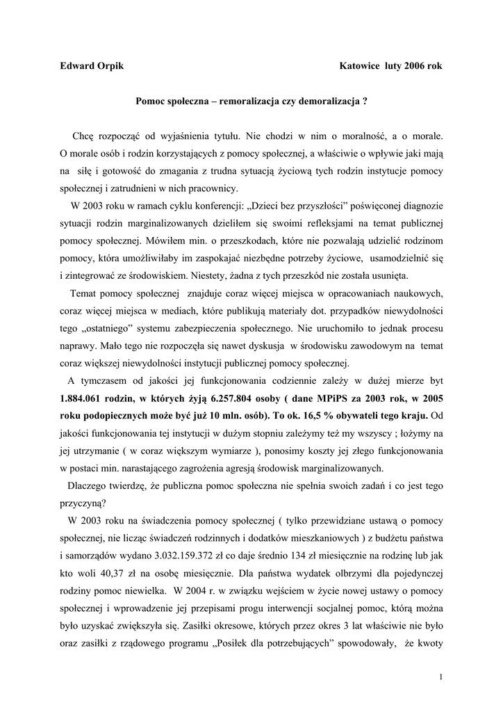 Edward Orpik Katowice luty 2006 rok Pomoc społeczna – remoralizacja czy demoralizacja ? Chcę rozpocząć od wyjaśnienia tytułu. Nie chodzi w nim o moralność, a o morale. O morale osób i rodzin korzystających z pomocy społecznej, a właściwie o wpływie jaki mają na siłę i gotowość do zmagania z trudna sytuacją życiową tych rodzin instytucje pomocy społecznej i zatrudnieni w nich pracownicy. W 2003 roku w ramach cyklu konferencji: „Dzieci bez przyszłości” poświęconej diagnozie sytuacji rodzin marginalizowanych dzieliłem się swoimi refleksjami na temat publicznej pomocy społecznej. Mówiłem min. o przeszkodach, które nie pozwalają udzielić rodzinom pomocy, która umożliwiłaby im zaspokajać niezbędne potrzeby życiowe, usamodzielnić się i zintegrować ze środowiskiem. Niestety, żadna z tych przeszkód nie została usunięta. Temat pomocy społecznej znajduje coraz więcej miejsca w opracowaniach naukowych, coraz więcej miejsca w mediach, które publikują materiały dot. przypadków niewydolności tego „ostatniego” systemu zabezpieczenia społecznego. Nie uruchomiło to jednak procesu naprawy. Mało tego nie rozpoczęła się nawet dyskusja w środowisku zawodowym na temat coraz większej niewydolności instytucji publicznej pomocy społecznej. A tymczasem od jakości jej funkcjonowania codziennie zależy w dużej mierze byt 1.884.061 rodzin, w których żyją 6.257.804 osoby ( dane MPiPS za 2003 rok, w 2005 roku podopiecznych może być już 10 mln. osób). To ok. 16,5 % obywateli tego kraju. Od jakości funkcjonowania tej instytucji w dużym stopniu zależymy też my wszyscy ; łożymy na jej utrzymanie ( w coraz większym wymiarze ), ponosimy koszty jej złego funkcjonowania w postaci min. narastającego zagrożenia agresją środowisk marginalizowanych. Dlaczego twierdzę, że publiczna pomoc społeczna nie spełnia swoich zadań i co jest tego przyczyną? W 2003 roku na świadczenia pomocy społecznej ( tylko przewidziane ustawą o pomocy społecznej, nie licząc świadczeń rodzinnych i dodatków mieszkaniowych ) z budżetu państwa i samorządów wydano 3.032.159.372 zł co daje średnio 134 zł miesięcznie na rodzinę lub jak kto woli 40,37 zł na osobę miesięcznie. Dla państwa wydatek olbrzymi dla pojedynczej rodziny pomoc niewielka. W 2004 r. w związku wejściem w życie nowej ustawy o pomocy społecznej i wprowadzenie jej przepisami progu interwencji socjalnej pomoc, którą można było uzyskać zwiększyła się. Zasiłki okresowe, których przez okres 3 lat właściwie nie było oraz zasiłki z rządowego programu „Posiłek dla potrzebujących” spowodowały, że kwoty 1 które rodziny uzyskiwały mogły się nawet podwoić. Dodatkowo reforma świadczeń rodzinnych spowodowała, że do korzystających z pomocy społecznej popłynął szerszy strumień pieniędzy. Mogłoby się wydawać, że sytuacja tych rodzin poprawiła się. W mojej ocenie tak się jednak nie stało. Zmieniono tylko system redystrybucji i na dodatek skomplikowano go w nieprawdopodobny wręcz sposób. W tej chwili w trzech odrębnych systemach ( świadczenia rodzinne, świadczenia pomocy społecznej, dodatki mieszkaniowe ) według różnych kryteriów, kompletnie różnych procedurach przyznaje się ok. 25 rodzajów świadczeń. Do każdego potrzeba sterty dokumentów, zaświadczeń. Przepisy dotyczące np. samotnego wychowywania dziecka są niezrozumiałe dla pracowników, jak więc mają być zrozumiałe dla korzystających z tych świadczeń. W 2004 r. weszła w życie nowa ustawa przyznająca zasiłki rodzinne i dodatki do nich. Bałagan przy jej wprowadzaniu powodował, że korzystający często po wielokroć byli wysyłani po to by donieść jeszcze jeden dokument. Żeby go złożyć musieli czekać w wielogodzinnych kolejkach. Do pomocy przy przyznawaniu świadczeń rodzinnych często oddelegowywani byli pracownicy socjalni z terenu. To z kolei powodowało, że jakość obsługiwania korzystających z pomocy społecznej obniżała się. W tej sytuacji nie było mowy o jakiejkolwiek pracy socjalnej. W najgorszym przypadku były osoby, które korzystały i ze świadczeń rodzinnych i z pomocy społecznej ( zdecydowana większość ). Donosząc kolejne dokumenty czekali na przyznanie świadczeń rodzinnych, a równocześnie czekali na przyznanie świadczeń z pomocy społecznej, do których naliczenia potrzebne były przyznane już świadczenia rodzinne. No i jeszcze to nieszczęsne „samotne wychowywanie dziecka”; „ proszę napisać oświadczenie, że samotnie wychowuje pani dziecko” ( warunek otrzymania zasiłku ), a po jakimś czasie wezwanie i „…to co pani uznaje za samotne wychowywanie dziecka, w naszej (ministerstwa, kolegium odwoławczego, przepisów ustawy – wstaw dowolne) interpretacji nie jest samotnym wychowywaniem dziecka” , pobrała pani nienależnie świadczenia. Trudno się dziwić, że ludzie mówili o tym, iż traktuje się ich jak bydło, złodziei, czują się upokarzani i poniżani. Trudno się dziwić histerii, rozpaczy, łzom czy wściekłości. Nie była to na pewno sytuacja, która powoduje, że w marginalizowanych środowiskach instytucja pomocy społecznej odbierana jest jako dająca wsparcie. Nie dziwię się , że w takim przypadku każdy sposób na wyciągnięcie pieniędzy jest dobry. Co by się nie powiedziało prawdę czy kłamstwo to efekt jest i tak nieprzewidywalny. To dlaczego nie próbować może się uda. A tym, którzy najlepiej zaadaptowali się do konieczności wyciągania świadczeń udaje się zawsze. Dodatkowo, w zabawie w policjantów i złodziei, w końcu bawiący się stają się… policjantami i złodziejami. 2 Zatrudnienie w instytucjach pomocy społecznej. razem Domy pomocy Placówki społecznej 111000 Terenowi Kierownicy, opiekuńczo- pracownicy administracja wychowawcze socjalni obsługa 45000 15000 Specjaliści 2680 12000 36320 Wg danych Ministerstwa Pracy i Polityki Społecznej. 