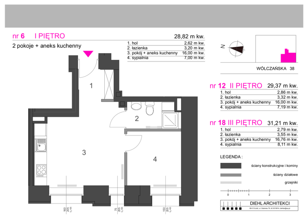 I PIĘTRO 1. 2. 3. 4. 2 pokoje + aneks kuchenny hol łazienka pokój + aneks kuchenny sypialnia 2,62 3,20 16,00 7,00 m kw. m kw. m kw. m kw. N 28,82 m kw. WÓLCZAŃSKA 38 1 nr 12 II PIĘTRO 29,37 m kw. 1. 2. 3. 4. 2 hol łazienka pokój + aneks kuchenny sypialnia 2,86 m kw. 3,32 m kw. 16,00 m kw. 7,19 m kw. nr 18 III PIĘTRO 31,21 m kw. 1. 2. 3. 4. 3 hol łazienka pokój + aneks kuchenny sypialnia 2,79 m kw. 3,55 m kw. 16,76 m kw. 8,11 m kw. LEGENDA : 4 ściany konstrukcyjne i kominy ściany działowe grzejniki 0 1 2 3 hp =85 hp =85 75 205 hp =85 160 205 DIEHL ARCHITEKCI 150 205 nr 6 90-6 13 Łódź, ul. Gdańska 79, 42 6319914, [email protected]