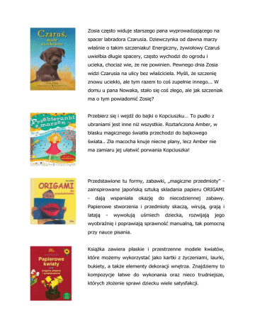 Zosia często widuje starszego pana wyprowadzającego na spacer labradora Czarusia. Dziewczynka od dawna marzy właśnie o takim szczeniaku! Energiczny, żywiołowy Czaruś uwielbia długie spacery, często wychodzi do ogrodu i ucieka, chociaż wie, że nie powinien. Pewnego dnia Zosia widzi Czarusia na ulicy bez właściciela. Myśli, że szczenię znowu uciekło, ale tym razem to coś zupełnie innego... W domu u pana Nowaka, stało się coś złego, ale jak szczeniak ma o tym powiadomić Zosię? Przebierz się i wejdź do bajki o Kopciuszku… To pudło z ubraniami jest inne niż wszystkie. Roztańczona Amber, w blasku magicznego światła przechodzi do bajkowego świata.. Zła macocha knuje niecne plany, lecz Amber nie ma zamiaru jej ułatwić porwania Kopciuszka! Przedstawione tu formy, zabawki, „magiczne przedmioty” zainspirowane japońską sztuką składania papieru ORIGAMI - dają wspaniała okazję do niecodziennej zabawy. Papierowe stworzenia i przedmioty skaczą, wirują, grają i latają - wywołują uśmiech dziecka, rozwijają jego wyobraźnię i poprawiają sprawność manualną, tak pomocną przy nauce pisania. Książka zawiera płaskie i przestrzenne modele kwiatów, które możemy wykorzystać jako kartki z życzeniami, laurki, bukiety, a także elementy dekoracji wnętrza. Znajdziemy to kompozycje łatwe do wykonania oraz nieco trudniejsze, których złożenie sprawi dziecku wiele satysfakcji. Główna bohaterka - pani Eustaszyna, mająca tak naprawdę na imię Jadwiga - przedwojenna "arystokratka", jest postacią niesamowitą. Walka ze służbą zdrowia, rewolucje domowe, organizowanie życia męża, loty samolotem, obrót nieruchomościami czy napisanie książki? Wszystko to drobiazgi dla naszej bohaterki. Luty 2012 - Ile jest w stanie zrobić matka, by ochronić własne dziecko? Jedynym marzeniem ośmioletniej Sophie Donohue jest być jak inne dziewczynki. Jej matka Janine z ociąganiem zgadza się, by córka razem z zastępem zuchów pojechała na dwudniowy biwak. Dziewczynka z wyjazdu nie wraca.... Książka pełna emocji, złamanych serc i marzeń. Wiarygodne i sympatyczne postacie, które potrafią radzić sobie z życiowymi zmianami. Opowieść o ludzkich wyborach i niebezpieczeństwach, jakie niesie ze sobą matczyna miłość. Nikt nie mógł przewidzieć, co wydarzy się tego dnia, kiedy Rose zgłosiła się do pomocy w szkolnej stołówce, by dyskretnie poobserwować swoją córkę, uroczą, choć nieśmiałą trzecioklasistkę Melly. Rok 1992. Leo Deakin budzi się w nieznanym mu szpitalu, gdzieś w Ameryce Południowej. Jego dziewczyna, Eleni, nie żyje, a on nie potrafi się z tym faktem pogodzić. Obarczając się bezustannie winą za wypadek, wpada w spiralę rozpaczy i beznadziei. Czy Leo ma jeszcze szansę odkryć coś, co na zawsze zmieni jego życie? Fascynująca podróż w gęste lasy i na warowne zamki dwunastowiecznej Saksonii. Wspaniała, klimatyczna opowieść o miłości, uporze i odwadze. Niezwykle wzruszająca historia umierającego ojca, który szuka nowego domu dla swego synka. Michael jest ośmioletnim chłopcem. Przez sześć ostatnich lat opiekował się nim tylko ojciec – jego mama zmarła, kiedy chłopiec miał zaledwie dwa latka. Teraz ma stracić także ukochanego tatę, który jest nieuleczalnie chory. Przerażony ojciec chce więc znaleźć kogoś, kto zaopiekuje się jego synkiem, który wkrótce zostanie zupełnie sam na świecie...