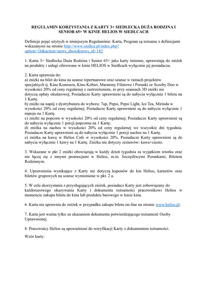 REGULAMIN KORZYSTANIA Z KARTY 3+ SIEDLECKA DUŻA RODZINA I SENIOR 65+ W KINIE HELIOS W SIEDLCACH Definicje pojęć użytych w niniejszym Regulaminie: Karta, Program są tożsame z definicjami wskazanymi na stronie http://www.siedlce.pl/index.php? option=16&action=news_show&news_id=182 1. Karta 3+ Siedlecka Duża Rodzina i Senior 65+ jako karty imienne, uprawniają do zniżek na produkty i usługi oferowane w kinie HELIOS w Siedlcach wyłącznie jej posiadacza. 2. Karta uprawnia do: a) zniżki na bilet do kina na seanse repertuarowe oraz seanse w ramach projektów specjalnych tj. Kino Konesera, Kino Kobiet, Maratony Filmowe i Poranki ze Scooby Doo w wysokości 20% od ceny regularnej z zastrzeżeniem, że przy seansach 3D zniżki nie dotyczą opłaty okularowej; Posiadacze Karty uprawnieni są do nabycia wyłącznie 1 biletu na 1 Kartę. b) zniżki na napój z dystrybutora do wyboru: 7up, Pepsi, Pepsi Light, Ice Tea, Mirinda w wysokości 20% od ceny regularnej; Posiadacze Karty uprawnieni są do nabycia wyłącznie 1 napoju na 1 Kartę. c) zniżki na popcorn w wysokości 20% od ceny regularnej; Posiadacze Karty uprawnieni są do nabycia wyłącznie 1 porcji popcornu na 1 Kartę. d) zniżka na nachos w wysokości 20% od ceny regularnej we wszystkie dni tygodnia. Posiadacze Karty uprawnieni są do nabycia wyłącznie 1 porcji nachos na 1 Kartę. e) zniżka na kawę w Helios Cafe w wysokości 20%. Posiadacze Karty uprawnieni są do nabycia wyłącznie 1 kawy na 1 Kartę. Zniżka nie dotyczy zestawów: kawa+ciasto. 3. Wskazane w pkt 2 zniżki obowiązują w każdy dzień tygodnia za wyjątkiem wtorku oraz nie łączą się z innymi promocjami w Helios, m.in. Szczęśliwymi Porankami, Biletem Rodzinnym. 4. Uprawnienia wynikające z Karty nie dotyczą kuponów do kin Helios, karnetów oraz biletów grupowych na seanse wymienione w pkt. 2 a. 5. W celu skorzystania z przysługujących zniżek, posiadacz Karty jest zobowiązany do każdorazowego okazywania Karty i dokumentu tożsamości pracownikowi Helios w momencie zakupu biletu do kina lub produktu barowego w kasie kina. 6. Karta nie uprawnia do zniżek w przypadku zakupu biletu on-line na stronie www.helios.pl. 7. Karta jest ważna tylko za okazaniem dokumentu potwierdzającego tożsamość Osoby Uprawnionej. 8. Pracownicy Helios są upoważnieni do weryfikacji Karty z dokumentem tożsamości. Wzór karty: