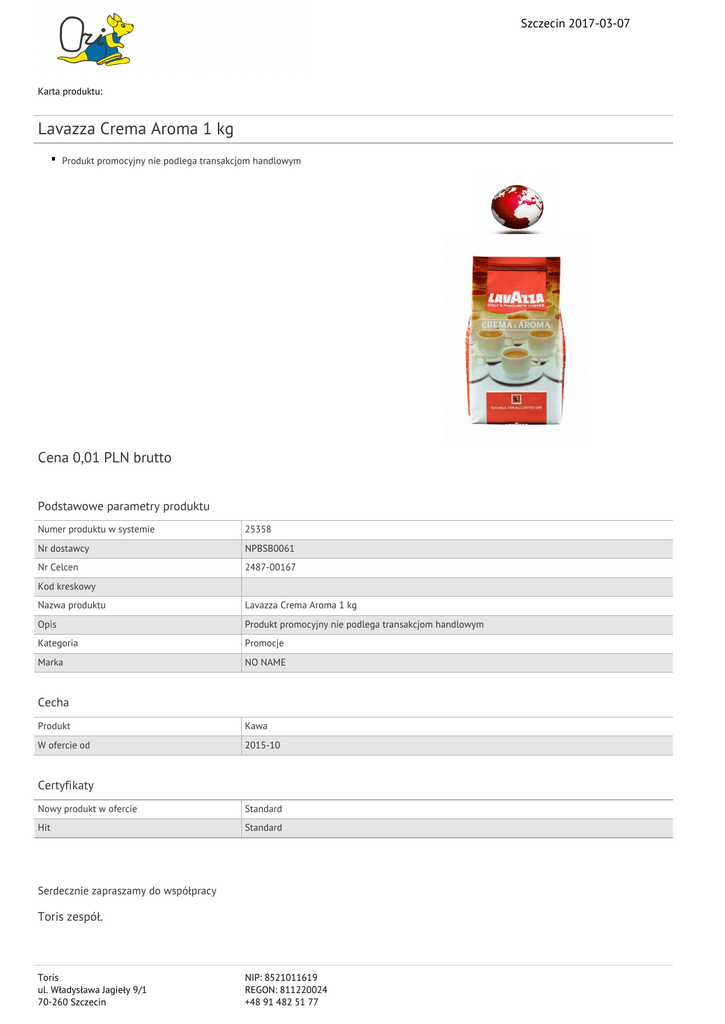 Szczecin 2017-03-07 Karta produktu: Lavazza Crema Aroma 1 kg Produkt promocyjny nie podlega transakcjom handlowym Cena 0,01 PLN brutto Podstawowe parametry produktu Numer produktu w systemie 25358 Nr dostawcy NPBSB0061 Nr Celcen 2487-00167 Kod kreskowy Nazwa produktu Lavazza Crema Aroma 1 kg Opis Produkt promocyjny nie podlega transakcjom handlowym Kategoria Promocje Marka NO NAME Cecha Produkt Kawa W ofercie od 2015-10 Certyfikaty Nowy produkt w ofercie Standard Hit Standard Serdecznie zapraszamy do współpracy Toris zespół. Toris ul. Władysława Jagieły 9/1 70-260 Szczecin NIP: 8521011619 REGON: 811220024 +48 91 482 51 77