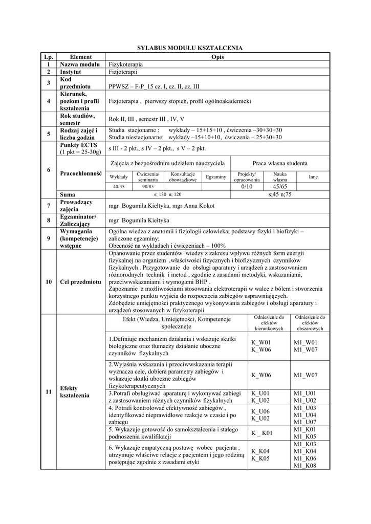 Lp. 1 2 3 4 5 Element Nazwa modułu Instytut Kod przedmiotu Kierunek, poziom i profil kształcenia Rok studiów, semestr Rodzaj zajęć i liczba godzin Punkty ECTS (1 pkt = 25-30g) SYLABUS MODUŁU KSZTAŁCENIA Opis Fizykoterapia Fizjoterapii PPWSZ – F-P_15 cz. I, cz. II, cz. III Fizjoterapia , pierwszy stopień, profil ogólnoakademicki Rok II, III , semestr III , IV, V Studia stacjonarne : wykłady – 15+15+10 , ćwiczenia –30+30+30 Studia niestacjonarne: wykłady –15+10+10, ćwiczenia – 25+30+30 s III - 2 pkt., s IV – 2 pkt., s V – 2 pkt. Zajęcia z bezpośrednim udziałem nauczyciela 6 Pracochłonność Wykłady 40/35 7 8 9 10 Suma Prowadzący zajęcia Egzaminator/ Zaliczający Wymagania (kompetencje) wstępne Cel przedmiotu Ćwiczenia/ seminaria 90/85 Konsultacje obowiązkowe Egzaminy Praca własna studenta Projekty/ opracowania Nauka własna 0/10 45/65 s;45 n;75 s; 130 n; 120 mgr Bogumiła Kiełtyka, mgr Anna Kokot mgr Bogumiła Kiełtyka Ogólna wiedza z anatomii i fizjologii człowieka; podstawy fizyki i biofizyki – zaliczone egzaminy; Obecność na wykładach i ćwiczeniach – 100% Opanowanie przez studentów wiedzy z zakresu wpływu różnych form energii fizykalnej na organizm ,właściwości fizycznych i biofizycznych czynników fizykalnych . Przygotowanie do obsługi aparatury i urządzeń z zastosowaniem różnorodnych technik i metod , zgodnie z zasadami metodyki, wskazaniami, przeciwwskazaniami i wymogami BHP . Zapoznanie z możliwościami stosowania elektroterapii w walce z bólem i stworzenia korzystnego punktu wyjścia do rozpoczęcia zabiegów usprawniających. Zdobędzie umiejętności praktycznego wykonywania zabiegów i obsługi aparatury i urządzeń stosowanych w fizykoterapii Odniesienie do Odniesienie do Efekt (Wiedza, Umiejętności, Kompetencje efektów efektów społeczne)e kierunkowych obszarowych 1.Definiuje mechanizm działania i wskazuje skutki biologiczne oraz tłumaczy działanie uboczne czynników fizykalnych 11 Efekty kształcenia Inne 2.Wyjaśnia wskazania i przeciwwskazania terapii wyznacza cele, dobiera parametry zabiegów i wskazuje skutki uboczne zabiegów fizykoterapeutycznych 3.Potrafi obsługiwać aparaturę i wykonywać zabiegi z zastosowaniem różnych czynników fizykalnych 4. Potrafi kontrolować efektywność zabiegów , identyfikować nieprawidłowe reakcje w czasie i po zabiegu 5. Wykazuje gotowość do samokształcenia i stałego podnoszenia kwalifikacji 6. Wykazuje empatyczną postawę wobec pacjenta , utrzymuje właściwe relacje z pacjentem i jego rodziną postępując zgodnie z zasadami etyki K_W01 K_W06 M1_W01 M1_W07 K_W06 M1_W07 K_U01 K_U02 M1_U01 M1_U02 M1_U03 M1_U04 M1_U07 M1_K01 M1_K05 M1_K03 M1_K04 M1_K06 M1_K08 K_U06 K_U02 K _ K01 K_K04 K_K05 Efekt kształcenia 1.Definiuje mechanizm działania i wskazuje skutki biologiczne oraz tłumaczy działanie uboczne czynników fizykalnych. 2.Wyjaśnia wskazania i przeciwwskazania terapii ,wyznacza cele, dobiera parametry zabiegów i wskazuje skutki uboczne zabiegów fizykoterapeutycznych. 12 13 Forma i warunki potwierdzenia efektu kształcenia Treści merytoryczne przedmiotu Sposób potwierdzenia (weryfikacji) Kolokwium pisemnepoprawność rozwiązania testów. Sprawdzian ustny i pisemny – rozwiązywanie zadań problemowych Prawidłowość doboru parametrów w zależności od celu terapii i ocenić jej efekty- ćwiczenia sprawdzające . 3.Potrafi obsługiwać aparaturę i wykonywać zabiegi z zastosowaniem różnych czynników fizykalnych. Prawidłowa obsługa aparatury i poprawność wykonania zabiegów fizykalnych . 4. Potrafi kontrolować efektywność zabiegów , identyfikować nieprawidłowe reakcje w czasie i po zabiegu. Działania praktyczne –poprawność wykonania ćwiczeń sprawdzających. 5. Wykazuje gotowość do samokształcenia i stałego podnoszenia kwalifikacji . Przygotowywanie się do zajęć, aktywny udział w dyskusji i ćwiczeniach. 6. Wykazuje empatyczną postawę wobec pacjenta , utrzymuje właściwe relacje z pacjentem i jego rodziną postępując zgodnie z zasadami etyki. Współpraca w zespole , rozwiązywanie zadań problemowych. Wykłady: Rola i zadania czynników fizykalnych we współczesnej fizjoterapii. Rodzaje czynników fizykalnych. Podstawy fizyczne działania prądu. Mechanizmy łagodzenia bólu za pomocą elektroterapii. Fizjologiczne efekty w tkankach pod wpływem działania prądu stałego, niskiej i średniej częstotliwości. Metodyka zabiegów z elektroterapii. Wskazania, przeciwwskazani, środki ostrożności. Elektrodiagnostyka nerwów i mięśni. Elektrostymulacja mięśni w porażeniu nerwów obwodowych. Elektrostymulacja w spastyczności. Neuromięśniowa elektrostymulacja mięśni prawidłowo unerwionych. Wpływ czynników termicznych na organizm człowieka. Mechanizmy termoregulacji. Fizjologiczne reakcje na zwiększenie i zmniejszenie temperatury w tkankach. Hydroterapia - działanie na organizm człowieka, podstawowe zasady, rodzaje zabiegów wodoleczniczych. Ultradźwięki- podstawowe właściwości fizyczne i biofizyczne, efekty działania na tkanki. Metody i techniki nadźwiękawiania. Aplikacje specjalne: fonoforeza, elektrofonoforeza, terapia skojarzona. Pole elektromagnetyczne wielkiej częstotliwości- podstawy fizyczne, efekty działania na tkanki: termiczny. Pole magnetyczne niskiej częstotliwości - właściwości fizyczne i biofizyczne pola magnetycznego i parametry. Światłolecznictwo- biologiczne działanie promieniowania ultrafioletowego, widzialnego i podczerwonego. Zastosowanie w profilaktyce i terapii. Biostymulacja promieniowaniem laserowym -podstawy fizyczne i działanie biologiczne. Dobór parametrów i metod aplikacji w zależności od stanu leczonej tkanki. Metodyka zabiegów ,wskazania, przeciwwskazania, środki ostrożności w czasie wykonywania wszystkich zabiegów. Ćwiczenia: Nauka obsługi urządzeń z zachowaniem warunków bezpieczeństwa dla obsługującego oraz pacjenta. Wykonywanie 