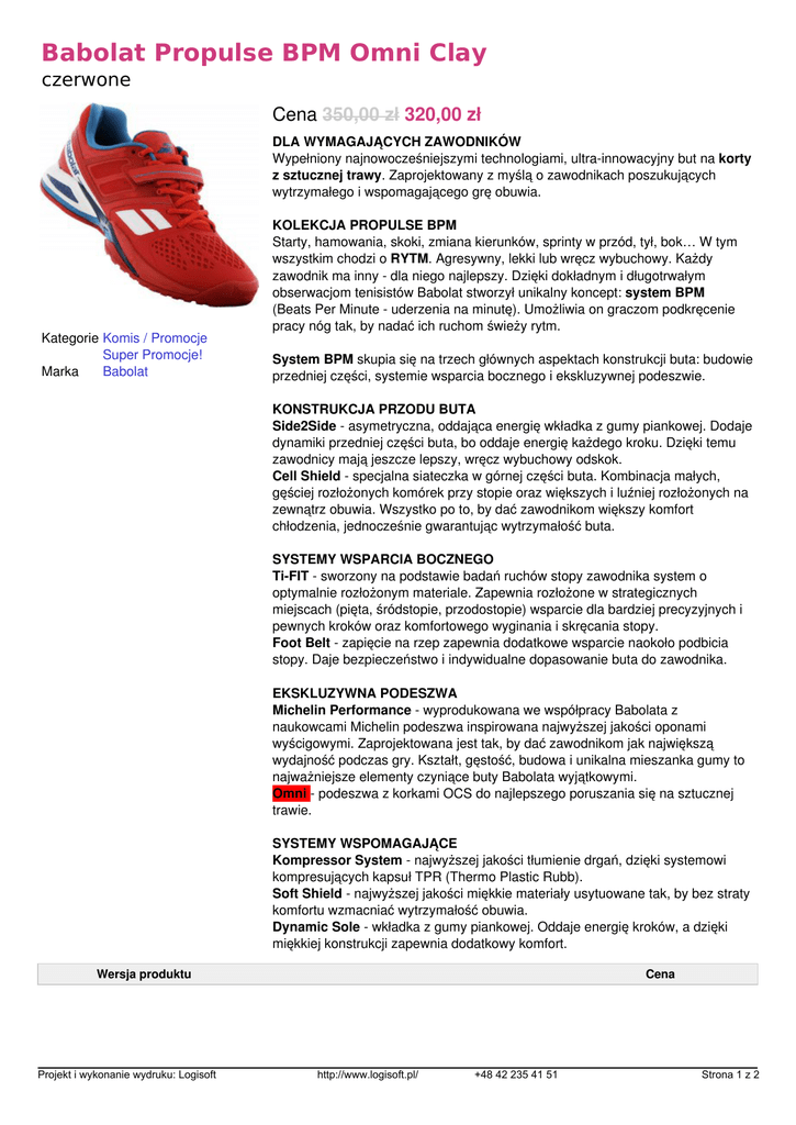 Babolat Propulse BPM Omni Clay czerwone Cena 350,00 zł 320,00 zł DLA WYMAGAJĄCYCH ZAWODNIKÓW Wypełniony najnowocześniejszymi technologiami, ultra-innowacyjny but na korty z sztucznej trawy. Zaprojektowany z myślą o zawodnikach poszukujących wytrzymałego i wspomagającego grę obuwia. Kategorie Komis / Promocje Super Promocje! Marka Babolat KOLEKCJA PROPULSE BPM Starty, hamowania, skoki, zmiana kierunków, sprinty w przód, tył, bok… W tym wszystkim chodzi o RYTM. Agresywny, lekki lub wręcz wybuchowy. Każdy zawodnik ma inny - dla niego najlepszy. Dzięki dokładnym i długotrwałym obserwacjom tenisistów Babolat stworzył unikalny koncept: system BPM (Beats Per Minute - uderzenia na minutę). Umożliwia on graczom podkręcenie pracy nóg tak, by nadać ich ruchom świeży rytm. System BPM skupia się na trzech głównych aspektach konstrukcji buta: budowie przedniej części, systemie wsparcia bocznego i ekskluzywnej podeszwie. KONSTRUKCJA PRZODU BUTA Side2Side - asymetryczna, oddająca energię wkładka z gumy piankowej. Dodaje dynamiki przedniej części buta, bo oddaje energię każdego kroku. Dzięki temu zawodnicy mają jeszcze lepszy, wręcz wybuchowy odskok. Cell Shield - specjalna siateczka w górnej części buta. Kombinacja małych, gęściej rozłożonych komórek przy stopie oraz większych i luźniej rozłożonych na zewnątrz obuwia. Wszystko po to, by dać zawodnikom większy komfort chłodzenia, jednocześnie gwarantując wytrzymałość buta. SYSTEMY WSPARCIA BOCZNEGO Ti-FIT - sworzony na podstawie badań ruchów stopy zawodnika system o optymalnie rozłożonym materiale. Zapewnia rozłożone w strategicznych miejscach (pięta, śródstopie, przodostopie) wsparcie dla bardziej precyzyjnych i pewnych kroków oraz komfortowego wyginania i skręcania stopy. Foot Belt - zapięcie na rzep zapewnia dodatkowe wsparcie naokoło podbicia stopy. Daje bezpieczeństwo i indywidualne dopasowanie buta do zawodnika. EKSKLUZYWNA PODESZWA Michelin Performance - wyprodukowana we współpracy Babolata z naukowcami Michelin podeszwa inspirowana najwyższej jakości oponami wyścigowymi. Zaprojektowana jest tak, by dać zawodnikom jak największą wydajność podczas gry. Kształt, gęstość, budowa i unikalna mieszanka gumy to najważniejsze elementy czyniące buty Babolata wyjątkowymi. Omni - podeszwa z korkami OCS do najlepszego poruszania się na sztucznej trawie. SYSTEMY WSPOMAGAJĄCE Kompressor System - najwyższej jakości tłumienie drgań, dzięki systemowi kompresujących kapsuł TPR (Thermo Plastic Rubb). Soft Shield - najwyższej jakości miękkie materiały usytuowane tak, by bez straty komfortu wzmacniać wytrzymałość obuwia. Dynamic Sole - wkładka z gumy piankowej. Oddaje energię kroków, a dzięki miękkiej konstrukcji zapewnia dodatkowy komfort. Wersja produktu Projekt i wykonanie wydruku: Logisoft Cena http://www.logisoft.pl/ +48 42 235 41 51 Strona 1 z 2 Projekt i wykonanie wydruku: Logisoft Powered by TCPDF (www.tcpdf.org) http://www.logisoft.pl/ +48 42 235 41 51 Strona 2 z 2