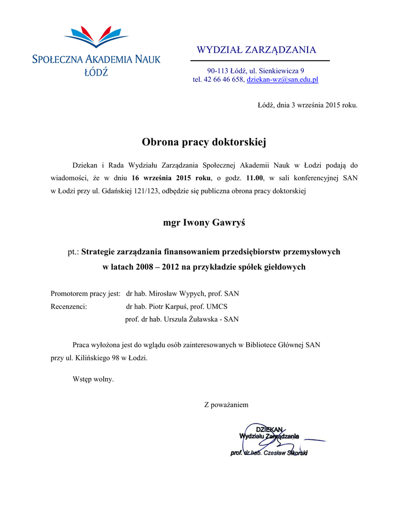 WYDZIAŁ ZARZĄDZANIA 90-113 Łódź, ul. Sienkiewicza 9 tel. 42 66 46 658, [email protected] Łódź, dnia 3 września 2015 roku. Obrona pracy doktorskiej Dziekan i Rada Wydziału Zarządzania Społecznej Akademii Nauk w Łodzi podają do wiadomości, że w dniu 16 września 2015 roku, o godz. 11.00, w sali konferencyjnej SAN w Łodzi przy ul. Gdańskiej 121/123, odbędzie się publiczna obrona pracy doktorskiej mgr Iwony Gawryś pt.: Strategie zarządzania finansowaniem przedsiębiorstw przemysłowych w latach 2008 – 2012 na przykładzie spółek giełdowych Promotorem pracy jest: dr hab. Mirosław Wypych, prof. SAN Recenzenci: dr hab. Piotr Karpuś, prof. UMCS prof. dr hab. Urszula Żuławska - SAN Praca wyłożona jest do wglądu osób zainteresowanych w Bibliotece Głównej SAN przy ul. Kilińskiego 98 w Łodzi. Wstęp wolny. Z poważaniem
