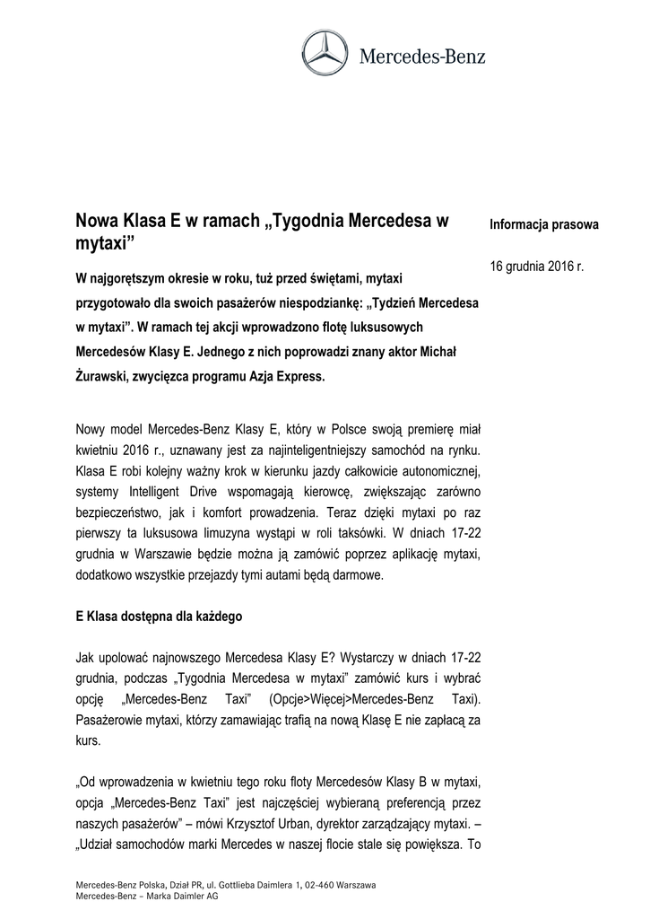 Nowa Klasa E w ramach „Tygodnia Mercedesa w mytaxi” W najgorętszym okresie w roku, tuż przed świętami, mytaxi przygotowało dla swoich pasażerów niespodziankę: „Tydzień Mercedesa w mytaxi”. W ramach tej akcji wprowadzono flotę luksusowych Mercedesów Klasy E. Jednego z nich poprowadzi znany aktor Michał Żurawski, zwycięzca programu Azja Express. Nowy model Mercedes-Benz Klasy E, który w Polsce swoją premierę miał kwietniu 2016 r., uznawany jest za najinteligentniejszy samochód na rynku. Klasa E robi kolejny ważny krok w kierunku jazdy całkowicie autonomicznej, systemy Intelligent Drive wspomagają kierowcę, zwiększając zarówno bezpieczeństwo, jak i komfort prowadzenia. Teraz dzięki mytaxi po raz pierwszy ta luksusowa limuzyna wystąpi w roli taksówki. W dniach 17-22 grudnia w Warszawie będzie można ją zamówić poprzez aplikację mytaxi, dodatkowo wszystkie przejazdy tymi autami będą darmowe. E Klasa dostępna dla każdego Jak upolować najnowszego Mercedesa Klasy E? Wystarczy w dniach 17-22 grudnia, podczas „Tygodnia Mercedesa w mytaxi” zamówić kurs i wybrać opcję „Mercedes-Benz Taxi” (Opcje>Więcej>Mercedes-Benz Taxi). Pasażerowie mytaxi, którzy zamawiając trafią na nową Klasę E nie zapłacą za kurs. „Od wprowadzenia w kwietniu tego roku floty Mercedesów Klasy B w mytaxi, opcja „Mercedes-Benz Taxi” jest najczęściej wybieraną preferencją przez naszych pasażerów” – mówi Krzysztof Urban, dyrektor zarządzający mytaxi. – „Udział samochodów marki Mercedes w naszej flocie stale się powiększa. To Mercedes-Benz Polska, Dział PR, ul. Gottlieba Daimlera 1, 02-460 Warszawa Mercedes-Benz – Marka Daimler AG Informacja prasowa 16 grudnia 2016 r. Strona 2 znak, że oprócz ceny i obsługi, nasi pasażerowie cenią sobie jakość floty. Klasa E to rdzeń marki Mercedes-Benz i synonim segmentu premium dlatego jako mytaxi postanowiliśmy dać naszym pasażerom odrobinę luksusu… w prezencie, na święta“. mytaxi express Oprócz darmowego przejazdu, szczęśliwcy, którym trafi się nowy Mercedes Benz Klasy E, będą mieli szansę spotkać się w taksówce z aktorem Michałem Żurawskim, zwycięzcą pierwszej edycji programu telewizyjnego Azja Express. Aktor w tych dniach wystąpi w nowej roli – kierowcy mytaxi i poprowadzi jedną z limuzyn - najnowszego modelu Mercedesa Klasy E. Marka Mercedes-Benz oraz mytaxi należą do koncernu Daimler AG. Kontakt: Aleksander Rzepecki e-mail: [email protected] tel. +48 22 312 72 22 Mercedes-Benz Polska, Dział PR, ul. Gottlieba Daimlera 1, 02-460 Warszawa Mercedes-Benz – Marka Daimler AG