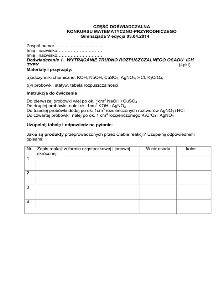 CZĘŚĆ DOŚWIADCZALNA KONKURSU MATEMATYCZNO-PRZYRODNICZEGO Gimnazjada V edycja 03.04.2014 Zespół numer……............................... Imię i nazwisko………………………… Imię i nazwisko………………………… Doświadczenie 1. WYTRĄCANIE TRUDNO ROZPUSZCZALNEGO OSADU ICH TYPY (4pkt) Materiały i przyrządy: a)odczynniki chemiczne: KOH, NaOH, CuSO4, AgNO3, HCl, K2CrO4, b)4 probówki, statyw, tabela rozpuszczalności Instrukcja do ćwiczenia Do pierwszej probówki wlej po ok. 1cm3 NaOH i CuSO4 Do drugiej probówki nalej ok. 1cm3 KOH i AgNO3 Do trzeciej probówki dodaj po ok. 1cm3 rozcieńczonych roztworów AgNO3 i HCl Do czwartej probówki nalej po ok. 1 cm3 rozcieńczonego K2CrO4 i AgNO3 Uzupełnij tabelę i odpowiedz na pytanie: Jakie są produkty przeprowadzonych przez Ciebie reakcji? Uzupełnij odpowiednimi opisami: Nr 1 2 3 4 Zapis reakcji w formie cząsteczkowej i jonowej skróconej Wzór osadu kolor Doświadczenie 2. Czy gęstość mleka 3,2% jest taka sama jak gęstość mleka 0,5% ? (3pkt) Mleko 3,2% zawiera 3,2g tłuszczu na 100ml mleka natomiast mleko 0,5% zawiera 0,5g tłuszczu na 100ml mleka. Pozostałe składniki występują w takiej samej ilości. Materiały i przyrządy: Mleko 3,2%, mleko 0,5 %, waga elektroniczna, cylinder miarowy, kalkulator Instrukcja do wykonania doświadczenia. 1.Zważyć cylinder miarowy na wadze i wytarować ją. 2. Nalać 100ml mleka 3.2 a następnie zważyć (zapisać wyniki) 3. Osuszyć cylinder miarowy i ponownie nalać 100ml mleka 0.5% 5. wyliczyć gęstość mleka Uzupełnij tabelę: Mleko 0,5% Wyniki pomiarów obliczenia Mleko 3,2% Masa mleka m [g] Objętość mleka V [cm3] Wzór na gęstość ……………………. d [….] Wniosek: Gęstość mleka 3.2% jest……………………………… w stosunku do mleka 0,5% w temperaturze otoczenia bez uwzględnienia niepewności pomiarowej. Odpowiedz na pytanie: Co trzeba zmienić w instrukcji ćwiczenia by móc uwzględnić niepewność pomiarową ………………………………………………………………………………………………… ………………………………………………………………………………………………… Doświadczenie 3. Na tropie witaminy C (4pkt) Witamina C wzmacnia naszą odporność, czyli pomaga walczyć z chorobami. Dzięki niej rany, złamane kości i siniaki goją się szybciej, a skóra starzeje się wolniej. Dzięki niej mamy zdrowe zęby, włosy i paznokcie . Nasze ciało nie umie produkować witaminy C- musimy ją zjeść. Dlatego bardzo ważne jest jedzenie warzyw i owoców które ją zawierają. Cel doświadczenia: Celem doświadczenia jest sprawdzenie gdzie jest witamina C. I gdzie jest jej najwięcej . Odczynniki i szkło laboratoryjne: zlewka, 4 kieliszki, zakraplacz, sok z połowy pomarańczy, 1 tabletka musującej (rozpuszczalnej) witaminy C, sok z kartonika, rozdrobniony cukierek z witaminą C ( rozpuść w wodzie), krochmal, jodyna. Przebieg doświadczenia: a) Przygotowanie specjalnego roztworu, który pomoże sprawdzić gdzie jest Witamina C- nazwijmy go „wykrywaczem” - do zlewki nalej 100cm3 wody, a następnie dodaj dwie krople jodyny i łyżeczkę krochmalu- wymieszaj Co zaobserwowałeś? ………………………………………………………………………………… b) Do każdego z 4 kieliszków wlej po 2cm3 „wykrywacza” .Wiedząc że roztwór ten odbarwia się przy pewnym stężeniu witaminy C, zaprojektuj doświadczenie w którym zbadasz ilość witaminy C w przygotowanych produktach. c) Musisz policzyć dodane krople, po których płyn będzie przeźroczysty. Wyniki zapisz w tabelce. produkt Liczba kropel dodanych do odbarwienia roztworu Sok ze świeżej pomarańczy Tabletka musująca witaminy C Sok z kartonika Cukierek z witaminą Pora na wnioski: Im mniej kropel wykrywacza trzeba użyć tym…………………………..witaminy C znajduje się w danym produkcie. Im więcej witaminy C w kropelce tym ………………………….odbarwia się wykrywacz. Największe stężenie witaminy C jest w…………….................. zaś najmniejsze stężenie witaminy C jest w ………………………………………………….. Pamiętajcie jednak, że najbardziej wartościowe nie są …………………………….ale witaminy zawarte w ………………………...................................................................