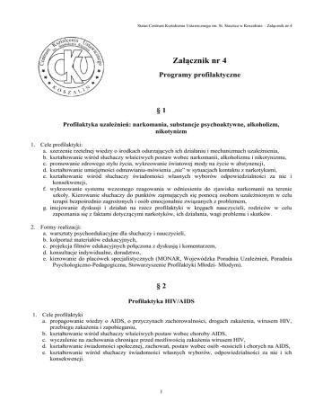 Statut Centrum Kształcenia Ustawicznego im. St. Staszica w Koszalinie – Załącznik nr 4 Załącznik nr 4 Programy profilaktyczne §1 Profilaktyka uzależnień: narkomania, substancje psychoaktywne, alkoholizm, nikotynizm 1. Cele profilaktyki: a. szerzenie rzetelnej wiedzy o środkach odurzających ich działaniu i mechanizmach uzależnienia, b. kształtowanie wśród słuchaczy właściwych postaw wobec narkomanii, alkoholizmu i nikotynizmu, c. promowanie zdrowego stylu życia, wykreowanie światowej mody na życie w abstynencji, d. kształtowanie umiejętności odmawiania-mówienia „nie” w sytuacjach kontaktu z narkotykami, e. kształtowanie wśród słuchaczy świadomości własnych wyborów odpowiedzialności za nie i konsekwencji, f. wykreowanie systemu wczesnego reagowania w odniesieniu do zjawiska narkomanii na terenie szkoły. Kierowanie słuchaczy do punktów zajmujących się pomocą osobom uzależnionym w celu terapii bezpośrednio zagrożonych i osób emocjonalnie związanych z problemem, g. inicjowanie dyskusji i działań na rzecz profilaktyki w kręgach nauczycieli, rodziców w celu zapoznania się z faktami dotyczącymi narkotyków, ich działania, wagi problemu i skutków. 2. Formy realizacji: a. warsztaty psychoedukacyjne dla słuchaczy i nauczycieli, b. kolportaż materiałów edukacyjnych, c. projekcja filmów edukacyjnych połączona z dyskusją i komentarzem, d. konsultacje indywidualne, doradztwo, e. kierowanie do placówek specjalistycznych (MONAR, Wojewódzka Poradnia Uzależnień, Poradnia Psychologiczno-Pedagogiczna, Stowarzyszenie Profilaktyki Młodzi- Młodym). §2 Profilaktyka HIV/AIDS 1. Cele profilaktyki a. propagowanie wiedzy o AIDS, o przyczynach zachorowalności, drogach zakażenia, wirusem HIV, przebiegu zakażenia i zapobieganiu, b. kształtowanie wśród słuchaczy właściwych postaw wobec choroby AIDS, c. wyczulenie na zachowania chroniące przed możliwością zakażenia wirusem HIV, d. kształtowanie świadomości społecznej, zachowań, postaw wobec osób -nosicieli i chorych na AIDS, e. kształtowanie wśród słuchaczy świadomości własnych wyborów, odpowiedzialności za nie i ich konsekwencji. 1 Statut Centrum Kształcenia Ustawicznego im. St. Staszica w Koszalinie – Załącznik nr 4 2. Formy realizacji: a. warsztaty mające na celu aranżowanie otwartych dyskusji umożliwiających słuchaczom mówienie o sobie, o swoich oczekiwaniach, o sprawach trudnych, ukierunkowywanie jej na szukanie pomocy specjalistycznej, b. projekcja filmów edukacyjnych połączona z dyskusją i komentarzem, c. organizacja konkursu na temat wiedzy o HIV/AIDS, d. konsultacje indywidualne-kierowanie do specjalistycznych placówek, punktów specjalistycznych, e. działalność profilaktyczna mająca na celu przystosowanie młodego człowieka do życia w środowisku społecznym. §3 Przeciwdziałanie demoralizacji - „Mobbing”- fala przemocy w szkole 1. Cele: a. zmniejszenie przypadków mobbingu bezpośredniego (otwarte ataki) i pośredniego (izolowanie) w szkole i poza nią a także zapobieganie powstawaniu tego typu problemów, b. zmniejszenie częstotliwości innych aspołecznych zachowań takich jak: chuligaństwo, kradzieże, wandalizm, wagary, agresja, c. poprawa klimatu panującego w szkole, wzrost porządku i dyscypliny, lepszy stosunek słuchaczy do kolegów i szkoły, d. poprawa samopoczucia słuchaczy w szkole i w domu, e. stworzenie takiego środowiska szkolnego, które charakteryzuje się ciepłem, życzliwym nastawieniem i zainteresowaniem ze strony dorosłych. 2. Formy realizacji: a. przeprowadzenie ankiety wśród słuchaczy, analiza sytuacji, b. współpraca dom-szkoła, c. większa kontrola podczas przerw (dyżury), d. organizowanie fachowej pomocy pedagoga. §4 Edukacja prozdrowotna 1. Cele: a. Zapoznanie słuchaczy z zagadnieniami związanymi ze zdrowiem człowieka: i. profilaktyka raka sutka – poznanie zasady samobadania piersi, ii. profilaktyka wirusowego zapalenia wątroby, iii. zapoznanie z metodami antykoncepcji, iv. pierwotna profilaktyka wad cewy nerwowej, v. stres i radzenie sobie z nim. b. Mobilizowanie słuchaczy do aktywnego uczestnictwa w działaniach podejmowanych na rzecz zdrowia, np. krwiodawstwo, c. Podejmowanie właściwych, korzystnych dla zdrowia decyzji w codziennym życiu, d. Poznanie skutków ryzykownych zachowań, np. palenia papierosów, nadużywania leków, zażywania narkotyków, niewłaściwego odżywiania się, e. Rozwijanie umiejętności życiowych sprzyjających rozwojowi fizycznemu, psychicznemu i społecznemu, f. Kształtowanie aktywnej postawy wobec zdrowia własnego i innych ludzi, g. Pierwsza pomoc przedmedyczna. 2 Statut Centrum Kształcenia Ustawicznego im. St. Staszica w Koszalinie – Załącznik nr 4 2. Formy realizacji: a. spotkania, warsztaty ze specjalistami, b. prezentacja broszur, filmów video, c. rozmowy z pielęgniarką, pedagogiem szkolnym, lekarzem. §5 Program zapobiegania niedostosowaniu społecznemu i przestępczości wśród słuchaczy 1. Założenie Wobec różnorodnych przejawów demoralizacji dyrekcja i nauczyciele Centrum za najbardziej niepokojojące i zagrażające słuchaczom uznaje narkomanię, alkoholizm i prostytucję. Są to zjawiska, wobec których nauczyciel, opiekun semestru nie powinien pozostawać obojętny, zwłaszcza, że zachowanie ryzykowne słuchaczy najczęściej ze sobą współwystępują. Picie alkoholu czy odurzanie się narkotykami współistnieją z zachowaniami agresywnymi, przestępczymi,- wczesną inicjacją seksualną. Wszystkie te czynniki mogą być przyczyną nawiązywania kontaktów z grupami przestępczymi, a w dalszej kolejności popełniania przestępstw. Stąd szczególny obowiązek reagowania na niepokojące sygnały zachowania słuchaczy spoczywa na nauczycielach. Jesteśmy zobowiązani do wczesnego rozpoznawania niedostosowania społecznego i podejmowania stosownych oddziaływań profilaktycznych, wychowawczych, a wobec niedostosowanych 