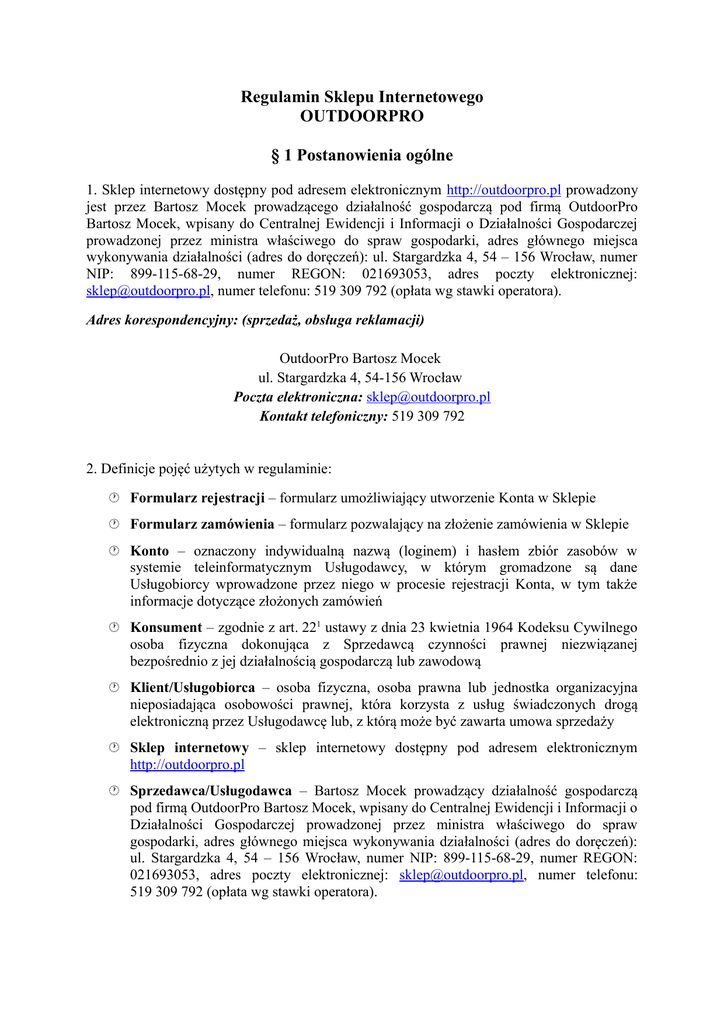 Regulamin Sklepu Internetowego OUTDOORPRO § 1 Postanowienia ogólne 1. Sklep internetowy dostępny pod adresem elektronicznym http://outdoorpro.pl prowadzony jest przez Bartosz Mocek prowadzącego działalność gospodarczą pod firmą OutdoorPro Bartosz Mocek, wpisany do Centralnej Ewidencji i Informacji o Działalności Gospodarczej prowadzonej przez ministra właściwego do spraw gospodarki, adres głównego miejsca wykonywania działalności (adres do doręczeń): ul. Stargardzka 4, 54 – 156 Wrocław, numer NIP: 899-115-68-29, numer REGON: 021693053, adres poczty elektronicznej: [email protected], numer telefonu: 519 309 792 (opłata wg stawki operatora). Adres korespondencyjny: (sprzedaż, obsługa reklamacji) OutdoorPro Bartosz Mocek ul. Stargardzka 4, 54-156 Wrocław Poczta elektroniczna: [email protected] Kontakt telefoniczny: 519 309 792 2. Definicje pojęć użytych w regulaminie: Formularz rejestracji – formularz umożliwiający utworzenie Konta w Sklepie Formularz zamówienia – formularz pozwalający na złożenie zamówienia w Sklepie Konto – oznaczony indywidualną nazwą (loginem) i hasłem zbiór zasobów w systemie teleinformatycznym Usługodawcy, w którym gromadzone są dane Usługobiorcy wprowadzone przez niego w procesie rejestracji Konta, w tym także informacje dotyczące złożonych zamówień Konsument – zgodnie z art. 221 ustawy z dnia 23 kwietnia 1964 Kodeksu Cywilnego osoba fizyczna dokonująca z Sprzedawcą czynności prawnej niezwiązanej bezpośrednio z jej działalnością gospodarczą lub zawodową Klient/Usługobiorca – osoba fizyczna, osoba prawna lub jednostka organizacyjna nieposiadająca osobowości prawnej, która korzysta z usług świadczonych drogą elektroniczną przez Usługodawcę lub, z którą może być zawarta umowa sprzedaży Sklep internetowy – sklep internetowy dostępny pod adresem elektronicznym http://outdoorpro.pl Sprzedawca/Usługodawca – Bartosz Mocek prowadzący działalność gospodarczą pod firmą OutdoorPro Bartosz Mocek, wpisany do Centralnej Ewidencji i Informacji o Działalności Gospodarczej prowadzonej przez ministra właściwego do spraw gospodarki, adres głównego miejsca wykonywania działalności (adres do doręczeń): ul. Stargardzka 4, 54 – 156 Wrocław, numer NIP: 899-115-68-29, numer REGON: 021693053, adres poczty elektronicznej: [email protected], numer telefonu: 519 309 792 (opłata wg stawki operatora). 3. Usługodawca świadczy usługi drogą elektroniczną zgodnie z zasadami i warunkami określonymi w niniejszym regulaminie. Regulamin jest udostępniony nieodpłatnie za pośrednictwem Sklepu internetowego, w formie umożliwiającej jego pozyskanie, odtworzenie i utrwalenie regulaminu za pomocą systemu teleinformatycznego, którym posługuje się Usługobiorca. Pobranie regulaminu w formacie PDF wymaga posiadania oprogramowania obsługującego pliki PDF – program można pobrać ze strony internetowej http://get.adobe.com/pl/reader 4. Usługodawca świadczy za pośrednictwem Sklepu internetowego następujące usługi: rejestracja i prowadzenie Konta Klienta, złożenie zamówienia za pośrednictwem Formularza zamówienia, usługi dodatkowe: „Newsletter”, „Przypomnij hasło”, „Zapytaj o produkt”, „Formularz kontaktowy”, „Zlokalizuj przesyłkę”, „Opinie o sklepie”. 5. W sprawach nieuregulowanych niniejszym regulaminem zastosowanie znajdą przepisy powszechnie obowiązującego prawa polskiego, w szczególności ustawy z dnia 18 lipca 2002 r. o świadczeniu usług drogą elektroniczną (Dz.U. 2002 nr 144 poz. 1204), ustawy z dnia 30 maja 2014 r. o prawach konsumenta (Dz.U. 2014 r. poz. 827 ze zm.), ustawy z dnia 23 kwietnia 1964 r. Kodeks cywilny (Dz.U. nr 16, poz. 93 z późn. zm.), ustawy z dnia 29 sierpnia 1997 roku o ochronie danych osobowych (Dz.U. 1997 nr 131, poz. 883 z późn. zm.) oraz inne właściwe przepisy. § 2 Warunki świadczenia usług drogą elektroniczną 1. Świadczenie usług drogą elektroniczną odbywa się 24 godziny na dobę przez 7 dni w tygodniu. Warunkiem korzystania z usług Sklepu internetowego jest: posiadanie komputera stacjonarnego, laptopa lub innego urządzenia multimedialnego, aktywne połączenie z siecią Internet zapewniające transmisję danych, aktywne konto poczty elektronicznej (e-mail), system operacyjny Microsoft Windows XP, 7, 8, 10, Vista, Linux, OsX, Android, przeglądarka internetowa: Internet Explorer, Mozilla FireFox, Google Chrome, Opera, Safari, włączona obsługa apletu JavaScript, plików Cookies, zalecana minimalna rozdzielczość ekranu: 1024 x 768 pikseli lub wyższa. 2. W przypadku korespondencji otrzymywanej za pośrednictwem poczty elektronicznej niezbędne jest posiadanie aktywnego konta poczty e-mail, natomiast w przypadku załączników dostarczanych wraz z pocztą e-mail, programu obsługującego pliki danego typu w szczególności: pdf, doc, docx, jpg. 3. Usługobiorca zobowiązany jest korzystać ze Sklepu internetowego, zgodnie z jego przeznaczeniem i powinien powstrzymywać się od dostarczania treści o charakterze bezprawnym. 4. Usługodawca zwraca szczególną uwagę, iż świadczenie usług drogą elektroniczną wiąże się z zagrożeniem po stronie Usługobiorcy, jako użytkownika korzystającego z sieci Internet. Aby uniknąć zagrożeń bezpośrednio związanych z korzystaniem z sieci Internet podczas zakupów w Sklepie internetowym jak i pozostałych usług świadczonych drogą elektroniczną, Klient powinien stosować odpowiednie oprogramowanie mające na celu stworzenie zabezpieczeń w szczególności zainstalowany program antywirusowy stale aktualizowany a także programy chroniące urządzenie użytkownika przed nieautoryzowanym dostępem osób trzecich. § 3 Warunki zawarcia i rozwiązania umowy o świadczenie usługi drogą elektroniczną polegającej na prowadzeniu Konta 1. Umowa o świadczenie usługi drogą elektroniczną polegająca na prowadzeniu Konta wymaga dokonania rejestrac