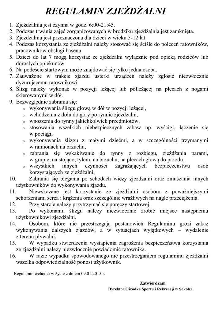 REGULAMIN ZJEŻDŻALNI Zjeżdżalnia jest czynna w godz. 6:00-21:45. Podczas trwania zajęć zorganizowanych w brodziku zjeżdżalnia jest zamknięta. Zjeżdżalnia jest przeznaczona dla dzieci w wieku 5-12 lat. Podczas korzystania ze zjeżdżalni należy stosować się ściśle do poleceń ratowników, pracowników obsługi basenu. 5. Dzieci do lat 7 mogą korzystać ze zjeżdżalni wyłącznie pod opieką rodziców lub dorosłych opiekunów. 6. Na podeście startowym może znajdować się tylko jedna osoba. 7. Zauważone w trakcie zjazdu usterki urządzeń należy zgłosić niezwłocznie dyżurującemu ratownikowi. 8. Ślizg należy wykonać w pozycji leżącej lub półleżącej na plecach z nogami skierowanymi w dół. 9. Bezwzględnie zabrania się: o wykonywania ślizgu głową w dół w pozycji leżącej, o wchodzenia z dołu do góry po rynnie zjeżdżalni, o wnoszenia do rynny jakichkolwiek przedmiotów, o stosowania wszelkich niebezpiecznych zabaw np. wyścigi, łączenie się w pociągi, o wykonywania ślizgu z małymi dziećmi, a w szczególności trzymanymi w ramionach na brzuchu, o zabrania się wskakiwanie do rynny z rozbiegu, zjeżdżania parami, w grupie, na stojąco, tyłem, na brzuchu, na plecach głową do przodu, o wszystkich innych czynności zagrażających bezpieczeństwu osób korzystających ze zjeżdżalni, 10. Zabrania się biegania po schodach wieży zjeżdżalni oraz zmuszania innych użytkowników do wykonywania zjazdu. 11. Niewskazane jest korzystanie ze zjeżdżalni osobom z poważniejszymi schorzeniami serca i krążenia oraz szczególnie wrażliwych na nagle przeciążenia. 12. Przy starcie należy przytrzymać się poręczy startowej. 13. Po wykonaniu ślizgu należy niezwłocznie zrobić miejsce następnemu użytkownikowi zjeżdżalni. 14. Osobom, które nie przestrzegają postanowień Regulaminu grozi zakaz wykonywania dalszych zjazdów, a w sytuacjach wyjątkowych – wydalenie z terenu pływalni. 15. W wypadku stwierdzenia wystąpienia zagrożenia bezpieczeństwa korzystania ze zjeżdżalni należy niezwłocznie powiadomić ratownika. 16. W razie wypadku spowodowanego nie przestrzeganiem regulaminu zjeżdżalni wszelka odpowiedzialność ponosi użytkownik. 1. 2. 3. 4. Regulamin wchodzi w życie z dniem 09.01.2015 r. Zatwierdzam Dyrektor Ośrodka Sportu i Rekreacji w Sokółce