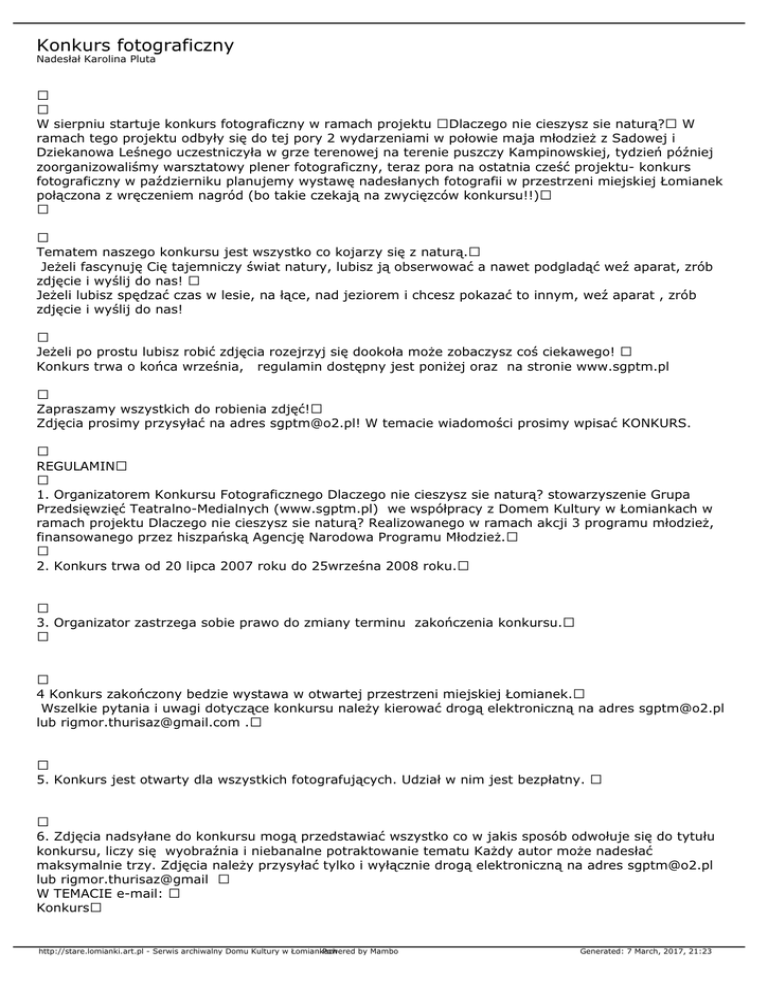Konkurs fotograficzny Nadesłał Karolina Pluta W sierpniu startuje konkurs fotograficzny w ramach projektu Dlaczego nie cieszysz sie naturą? W ramach tego projektu odbyły się do tej pory 2 wydarzeniami w połowie maja młodzież z Sadowej i Dziekanowa Leśnego uczestniczyła w grze terenowej na terenie puszczy Kampinowskiej, tydzień później zoorganizowaliśmy warsztatowy plener fotograficzny, teraz pora na ostatnia cześć projektu- konkurs fotograficzny w październiku planujemy wystawę nadesłanych fotografii w przestrzeni miejskiej Łomianek połączona z wręczeniem nagród (bo takie czekają na zwycięzców konkursu!!) Tematem naszego konkursu jest wszystko co kojarzy się z naturą. Jeżeli fascynuję Cię tajemniczy świat natury, lubisz ją obserwować a nawet podgladąć weź aparat, zrób zdjęcie i wyślij do nas! Jeżeli lubisz spędzać czas w lesie, na łące, nad jeziorem i chcesz pokazać to innym, weź aparat , zrób zdjęcie i wyślij do nas! Jeżeli po prostu lubisz robić zdjęcia rozejrzyj się dookoła może zobaczysz coś ciekawego! Konkurs trwa o końca września, regulamin dostępny jest poniżej oraz na stronie www.sgptm.pl Zapraszamy wszystkich do robienia zdjęć! Zdjęcia prosimy przysyłać na adres [email protected]! W temacie wiadomości prosimy wpisać KONKURS. REGULAMIN 1. Organizatorem Konkursu Fotograficznego Dlaczego nie cieszysz sie naturą? stowarzyszenie Grupa Przedsięwzięć Teatralno-Medialnych (www.sgptm.pl) we współpracy z Domem Kultury w Łomiankach w ramach projektu Dlaczego nie cieszysz sie naturą? Realizowanego w ramach akcji 3 programu młodzież, finansowanego przez hiszpańską Agencję Narodowa Programu Młodzież. 2. Konkurs trwa od 20 lipca 2007 roku do 25wrześna 2008 roku. 3. Organizator zastrzega sobie prawo do zmiany terminu zakończenia konkursu. 4 Konkurs zakończony bedzie wystawa w otwartej przestrzeni miejskiej Łomianek. Wszelkie pytania i uwagi dotyczące konkursu należy kierować drogą elektroniczną na adres [email protected] lub [email protected] . 5. Konkurs jest otwarty dla wszystkich fotografujących. Udział w nim jest bezpłatny. 6. Zdjęcia nadsyłane do konkursu mogą przedstawiać wszystko co w jakis sposób odwołuje się do tytułu konkursu, liczy się wyobraźnia i niebanalne potraktowanie tematu Każdy autor może nadesłać maksymalnie trzy. Zdjęcia należy przysyłać tylko i wyłącznie drogą elektroniczną na adres [email protected] lub rigmor.thurisaz@gmail W TEMACIE e-mail: Konkurs http://stare.lomianki.art.pl - Serwis archiwalny Domu Kultury w Łomiankach Powered by Mambo Generated: 7 March, 2017, 21:23 W TREŚCI e-mail: Imie i nazwisko autora telefon(komórkowy lub stacjonatny) Tytuł zdjęcia oraz oświadczenie o posiadaniu praw autorskich do zdjęć oraz zgodę na przetwarzanie danych osobowych, zgodnie z zał. do niniejszego regulaminu "Potwierdzam swoje prawa autorskie do nadesłanego zdjęcia oraz zapoznałem/am się z regulaminem konkursu - IMIĘ NAZWISKO" 7.Zdjęcie nadesłane w załączniku powinno być w rozdzielczości minimum 1280x1024 px. 8. Oceny zdjęć dokona jury powołane przez organizatora. Decyzje jury są ostateczne. 9. Wybrane zdjęcia zostaną zaprezentowane mieszkańcom Łomianek podczas otwartej wystawy w przestrzeni miejskiej, dokładny termin wystawy zostanie podany później, oraz na stronie internetowej www.sgptm.pl 10. O wygranej autor zdjęcia zostanie powiadomiony podczas wernisażu, oraz telefonicznie lub mailowo w przypadku gdyby nie mógł w nim uczestniczyć oraz informacja ta (nagrodzone zdjęcie, imię i nazwisko autora) zostanie opublikowana na stronie www Domu Kultury w Łomiankach, a także na stronie www.sgptm.pl 11. Zdjęcia nadesłane na konkurs nie tracą praw autorskich, są nadal własnością autora. 12. Organizatorzy mają prawo publikować nadesłane zdjęcia (wraz z imieniem i nazwiskiem autora) na łamach lokalnej prasy, na własnych stronach www oraz używać je w celach marketingowych związanych z promocją portalu. 13. Uczestnik biorący udział w konkursie potwierdza, że wyraża zgodę na zasady konkursu zawarte w niniejszym regulaminie. 14. Organizator zastrzega sobie prawo do przerwania lub odwołania konkursu. 15. Dane osobowe uczestników konkursu będą przetwarzane wyłącznie do celów związanych z organizowaniem konkursu przy zachowaniu zasad określonych w ustawie o ochronie danych osobowych (Dz. U. z 2002r. Nr101, poz. 926). http://stare.lomianki.art.pl - Serwis archiwalny Domu Kultury w Łomiankach Powered by Mambo Generated: 7 March, 2017, 21:23