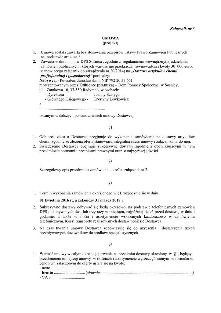 Załącznik nr 3 UMOWA (projekt) 1. Umowa została zawarta bez stosowania przepisów ustawy Prawo Zamówień Publicznych na podstawie art.4 ust 8 2. Zawarta w dniu ........ w DPS Sośnica , zgodnie z regulaminem wewnętrznym( udzielania zamówień publicznych , których wartość nie przekracza równowartości kwoty 30 000 euro, stanowiącego załącznik do zarządzenia nr 20/2014) na „Dostawę artykułów chemii profesjonalnej i gospodarczej” pomiędzy: Nabywcą, - Powiatem Jarosławskim, NIP 792 20 33 661 reprezentowanym przez Odbiorcę (płatnika) – Dom Pomocy Społecznej w Sośnicy, ul. Zamkowa 10, 37-550 Radymno, w osobach: - Dyrektora Joanny Szałyga - Głównego Księgowego - Krystyny Lewkowicz a ................................................................ zwanym w dalszych postanowieniach umowy Dostawcą. §1 1. Odbiorca zleca a Dostawca przyjmuje do wykonania zamówienie na dostawy artykułów chemii zgodnie ze złożoną ofertą stanowiąca integralną część umowy i załącznikami do niej. 2. Świadczenie Dostawcy obejmuje sukcesywne dostawy zgodnie z obowiązującymi w tym przedmiocie normami i przepisami prawnymi oraz o najwyższej jakości. §2 Szczegółowy opis przedmiotu zamówienia określa załącznik nr 2. §3 1. Termin wykonania zamówienia określonego w §1 rozpocznie się w dniu 01 kwietnia 2016 r., a zakończy 31 marca 2017 r. 2. Sukcesywne dostawy odbywać się będą okresowo, na podstawie telefonicznych zamówień DPS dokonywanych dwa lub trzy razy w miesiącu, najpóźniej dzień przed dostawą, w dniu i godzinie, a także w ilości i asortymencie wskazanych każdorazowo w zamówieniu telefonicznym. Koszt transportu realizowanych dostaw poniesie Dostawca. 3. Na czas trwania umowy Dostawca zobowiązuje się do użyczenia i dostarczenia trzech przepływowych dozowników do środków specjalistycznych §4 1. Wartość umowy w całym okresie jej trwania na przedmiot dostawy określony w §1, będący przedmiotem niniejszej umowy w ilościach i asortymencie wyszczególnionym w formularzu cenowym załączonym do oferty ustala się na kwotę: - netto ................................. - brutto .............................. (słownie...........................................................................................) - VAT ................................. 2. Nabywcą wyszczególnionym na fakturze będzie Powiat Jarosławski, zaś Odbiorcą(płatnikiem) za dostawy będzie Dom Pomocy Społecznej. 3. Wynagrodzenie za wykonanie przedmiotu umowy będzie płatne Dostawcy na podstawie faktury dotyczącej wyłącznie dostarczonej ilości leków, na konto Dostawcy, w terminie 30 dni od dnia dokonania dostawy. 4. W przypadku zmiany stawek podatku VAT, jeżeli termin zapłaty należności przypadnie po wejściu w życie nowych przepisów dotyczących stawek podatku VAT, cena brutto, o której mowa w ust. 1 zostanie zmieniona o stawki obowiązujące na dzień zapłaty, bez konieczności zawierania aneksu, do tej umowy. 5. Cena uzgodnionego przedmiotu zamówienia obejmuje w szczególności cenę z podatkiem VAT koszt transportu i rozładunku. §5 1. Strony zobowiązują się do współpracy w zakresie realizacji przedmiotu umowy. 2. Odbiorca w razie stwierdzenia, że towar zamówiony został dostarczony w większej ilości niż było w zamówieniu ma prawo odmówić przyjęcia nadwyżki oraz domagać się korygującej faktury, jeśli towar zostanie dostarczony ilościach mniejszych niż przewidywało zamówienie Dostawca ma obowiązek dostarczenia brakujących ilości jeszcze w tym samym dniu. 3. Nazwy towarów ujętych na fakturach VAT muszą być zgodne z nazwami towarów ujętych w załączniku nr 2 do niniejszej umowy. 4. W przypadku , gdy asortyment z załącznika nr 2 w czasie realizacji umowy będzie odbiegał jakością od wymagań postawionych przez Odbiorcę zamówienia, czego nie można było dowieść na etapie podpisywania umowy- Dostawca zobowiązany jest zamienić na produkt zastępczy, w cenie nie wyższej niż ta, którą zaproponował za pierwotny asortyment. 5. Dostawca zapoznał się z siedzibą Odbiorcy, gdzie będzie realizowany przedmiot zamówienia i nie widzi żadnych trudności w dostawie przedmiotu zamówienia w miejsce wskazane przez Odbiorcę . 6. Osobą odpowiedzialną za przedmiot zamówienia ze strony jest: - Odbiorcy - Dostawcy - Beata Tas - tel. 022-213 13 83, wew.10 - ..................................................... §6 Odbiorca może żądać od Dostawcy zapłaty kar umownych w następujących wypadkach: 1. W razie zwłoki w realizacji zamówienia, Odbiorca może żądać od Dostawcy kary umownej wysokości 2% wartości zamówienia określonego w §4, pkt.1 za każdy dzień zwłoki, a jeżeli okres zwłoki przekroczy 3 dni, zamawiający może odstąpić od umowy, niezależnie od żądania kary umownej. 2. W przypadku odstąpienia od umowy przez Odbiorcę na skutek okoliczności określonych w pkt. 1 – Dostawca zapłaci Odbiorcy karę umowną w wysokości 10% wartości zamówienia określonego w §4, pkt.1. 3. W przypadku zerwania umowy przez Dostawcę – Odbiorca będzie żądał kary umownej w wysokości 15% (piętnaście) wartości zamówienia określonego w §4, pkt.1 4. W razie wystąpienia istotnej zmiany okoliczności powodującej, że wykonanie umowy nie leży w interesie publicznym, czego nie można było przewidzieć w chwili zawarcia umowy, Odbiorca może odstąpić od umowy w terminie 30 dni od momentu powzięcia wiadomości o powyższych okolicznościach. W takim wypadku Dostawca może żądać jedynie wynagrodzenia należnego mu z tytułu wykonanej części umowy. 5. Strony zastrzegają sobie prawo dochodzenia odszkodowania uzupełniającego do wysokości rzeczywiście poniesionej straty. §7 Odstąpienie od umowy wymaga miesięcznego okresu wypowiedzenia oraz formy pisemnej pod rygorem nieważności. Strona mająca zamiar odstąpić od umowy powinna także uzasadnić pisemnie swoją decyzję. §8 W spra