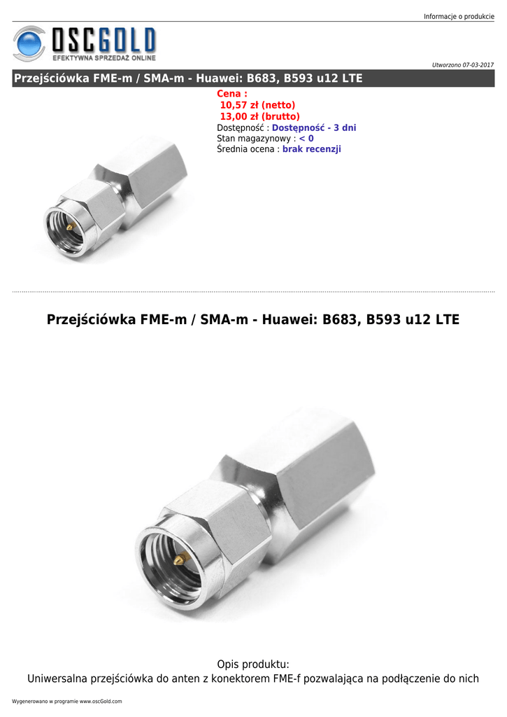 Informacje o produkcie Utworzono 07-03-2017 Przejściówka FME-m / SMA-m - Huawei: B683, B593 u12 LTE Cena : 10,57 zł (netto) 13,00 zł (brutto) Dostępność : Dostępność - 3 dni Stan magazynowy : < 0 Średnia ocena : brak recenzji Przejściówka FME-m / SMA-m - Huawei: B683, B593 u12 LTE Opis produktu: Uniwersalna przejściówka do anten z konektorem FME-f pozwalająca na podłączenie do nich Wygenerowano w programie www.oscGold.com modemów i innych urządzeń z wejściem SMA-f. Przejściówka FME-m / SMA-m kompatybilna z: Huawei: B260a, B593, B593 u12 LTE, B593S-22, B683, B961, B970, B970b, NB970 ZTE: RL400, RL500 Netkom: BT2, ES75, HC25, MC55, MC55S, TC63, TC65, TC65S, XT65, XT75 Siemens: ES75 Sagem: RL300 AnyTone: AT-400 Mobilebox: NetBox, MC35 TechLab: ED77 i innych ze złączem SMA-f
