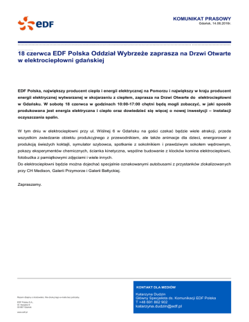 KOMUNIKAT PRASOWY Gdańsk, 14.06.2016r. ````````````````````````````````````````````````````````````````````````````````````````````````````````````````````````````` ```````````````````````````` ``````````` 18 czerwca EDF Polska Oddział Wybrzeże zaprasza na Drzwi Otwarte w elektrociepłowni gdańskiej EDF Polska, największy producent ciepła i energii elektrycznej na Pomorzu i największy w kraju producent energii elektrycznej wytwarzanej w skojarzeniu z ciepłem, zaprasza na Drzwi Otwarte do elektrociepłowni w Gdańsku. W sobotę 18 czerwca w godzinach 10:00-17:00 chętni będą mogli zobaczyć, w jaki sposób produkowana jest energia elektryczna i ciepło oraz dowiedzieć się więcej o nowej inwestycji – instalacji oczyszczania spalin. W tym dniu w elektrociepłowni przy ul. Wiślnej 6 w Gdańsku na gości czekać będzie wiele atrakcji, przede wszystkim zwiedzanie obiektu produkcyjnego z przewodnikiem, ale także animacje dla dzieci, energorower z produkcją świeżych koktajli, symulator szybowca, spotkanie z sokolnikiem i prawdziwym sokołem wędrownym, pokazy eksperymentów chemicznych, ścianka kinetyczna, wspólne budowanie z klocków komina elektrociepłowni, fotobudka z pamiątkowymi zdjęciami i wiele innych. Do elektrociepłowni będzie można dojechać specjalnie oznakowanymi autobusami z przystanków zlokalizowanych przy CH Medison, Galerii Przymorze i Galerii Bałtyckiej. Zapraszamy. KONTAKT DLA MEDIÓW Razem dbajmy o środowisko. Nie drukuj tego e-maila bez potrzeby. EDF Polska S.A., Ul. Swojska 9 00-867 Gdańsk www.edf.pl Katarzyna Dudzin Główny Specjalista ds. Komunikacji EDF Polska T +48 691 862 902 [email protected] EDF Polska Oddział Wybrzeże w Gdańsku EDF Polska Oddział Wybrzeże posiada dwie elektrociepłownie: w Gdańsku i Gdyni, które są największym producentem ciepła i energii elektrycznej na Pomorzu. Z roczną produkcją 11000 TJ ciepła i 1300 GWh energii elektrycznej zaspokaja ponad połowę potrzeb grzewczych w Gdańsku, Gdyni, Sopocie i Rumi. EDF Polska dba o zachowanie równowagi między działalnością biznesową, inicjatywami na rzecz społeczności lokalnej i środowiska naturalnego. Jako jedna z nielicznych firm w Trójmieście ma zawarte z władzami miast Gdańska i Gdyni Partnerstwa na Rzecz Zrównoważonego Rozwoju, realizując wspólnie wiele działań mających poprawiać jakość życia mieszkańców. Grupa EDF w Polsce Grupa EDF, jeden z liderów na europejskim rynku energii, jest firmą zintegrowaną, obecną w obszarach wytwarzania, obrotu i sprzedaży energii oraz usług. W Polsce posiada blisko 10% udziału w rynku energii elektrycznej i 15% w rynku ciepła sieciowego. EDF jest też największym zagranicznym inwestor em w branży energetycznej. Grupa EDF jest w Polsce czołowym producentem energii elektrycznej i ciepła w procesie wysokosprawnej kogeneracji, zaopatrując w ciepło Kraków, Gdańsk i Gdynię, Wrocław, Zieloną Górę i Toruń. W Rybniku posiada systemową elektrownię węglową o mocy 1 775 MW. Poprzez swoje spółki zależne EDF Polska, DK Energy, Fenice, Tiru i Citelum, Grupa EDF oferuje społecznościom lokalnym oraz klientom biznesowym szeroki zestaw usług związanych z efektywnością energetyczną. EDF oferuje również sprzedaż energii elektrycznej i usługi dużym klientom biznesowym oraz małym i średnim przedsiębiorstwom. Grupa EDF Grupa EDF, istotny uczestnik transformacji energetycznej, jest firmą zintegrowaną, działającą w dziedzinach wytwarzania, przesyłu, obrotu, sprzedaży energii oraz usług energetycznych. EDF jest światowym liderem energetyki niskoemisyjnej i dysponuje zróżnicowanym miksem produkcyjnym obejmującym elektrownie atomowe, wodne, odnawialne i konwencjonalne. Grupa pośredniczy w dostawie energii i usług do 37,8 mln klientów, w tym 28,3 mln we Francji. W 2015 roku skonsolidowane przychody Grupy wyniosły 75 mld euro, z czego 47,2% wypracowano poza Francją. EDF jest notowany na paryskiej giełdzie.