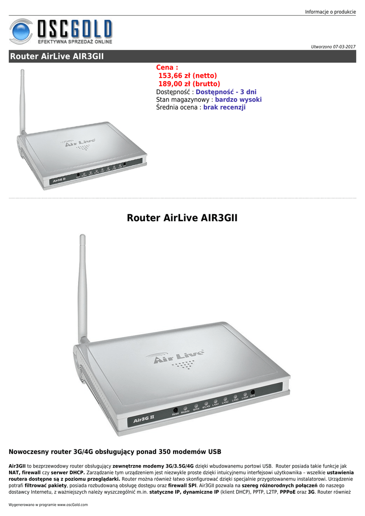 Informacje o produkcie Utworzono 07-03-2017 Router AirLive AIR3GII Cena : 153,66 zł (netto) 189,00 zł (brutto) Dostępność : Dostępność - 3 dni Stan magazynowy : bardzo wysoki Średnia ocena : brak recenzji Router AirLive AIR3GII Nowoczesny router 3G/4G obsługujący ponad 350 modemów USB Air3GII to bezprzewodowy router obsługujący zewnętrzne modemy 3G/3.5G/4G dzięki wbudowanemu portowi USB. Router posiada takie funkcje jak NAT, firewall czy serwer DHCP. Zarządzanie tym urządzeniem jest niezwykle proste dzięki intuicyjnemu interfejsowi użytkownika – wszelkie ustawienia routera dostępne są z poziomu przeglądarki. Router można również łatwo skonfigurować dzięki specjalnie przygotowanemu instalatorowi. Urządzenie potrafi filtrować pakiety, posiada rozbudowaną obsługę dostępu oraz firewall SPI. Air3GII pozwala na szereg różnorodnych połączeń do naszego dostawcy Internetu, z ważniejszych należy wyszczególnić m.in. statyczne IP, dynamiczne IP (klient DHCP), PPTP, L2TP, PPPoE oraz 3G. Router również Wygenerowano w programie www.oscGold.com współpracuje ze standardami sieci bezprzewodowej IEEE 802.11b/g/n. Najważniejsze cechy produktu: ● ● ● ● ● ● Współdzielenie bezprzewodowo swoje łącze z sieci 3G/3.5G/4G Port WAN obsługujący sieci xDSL oraz klasyczne modemy ADSL Wsparcie WAN przez 3G – komfort pracy i ciągły dostęp do Internetu Współpracuje z modemami USB 3G/3.5G/4G obsługującymi sieci komórkowe w standardach HSxPA, HSPA+, EV-DO oraz TD-SCDMA Obsługa ponad 350 modeli modemów USB Współpraca ze smartfonami Wsparcie WAN poprzez 3G Air3GII posiada port USB dzięki któremu możemy dzielić się swoim łączem internetowym z innymi za pomocą zewnętrznego modemu 3G/3.5G/4G. Dodatkowo przez wbudowany port WAN można dzielić się łączem z linii xDSL czy klasycznego modemu ADSL. Air3GII posiada niezwykłą funkcję wspierania WAN poprzez 3G – jeżeli połączenie internetowe nie powiedzie się z jednego źródła (WAN) router automatycznie łączy się poprzez drugie (3G), co pozwala użytkownikowi na komfortową pracę bez ingerencji w zmianę trybu połączenia. Funkcja ta jest niezwykle użyteczna podczas pracy w biurze czy rozrywki w domu, zabezpiecza ona połączenie tak, by móc komfortowo korzystać z zasobów Internetu. Internet w środkach transportu Air3GII to idealne urządzenie które jest odpowiedzią na coraz większe zapotrzebowanie dostępu do Internetu w środkach transportu. Głównymi zaletami wyróżniającymi go na tle konkurencji jest znikomy pobór prądu plasujący się na poziomie 5V (opcjonalnie można dokupić adapter samochodowy CAR-100USB). Dołączając do tego bogatą funkcjonalność urządzenia, Air3GII jest idealny do dostarczania połączenia Internetowego w takich środkach transportu jak autokary, pociągi czy samoloty. Łatwa instalacja oraz intuicyjna konfiguracja Aby móc korzystać z Internetu poprzez 3G/3.5G/4G wystarczy podłączyć modem poprzez port USB znajdujący się na urządzeniu. Air3GII został wyposażony w szereg sterowników popularnych firm produkujących modemy, dzięki czemu nie jest wymagana żadna instalacja sterowników – urządzenie obsługuje ponad 350 modeli modemów! Użytkownik ogranicza się tylko do wpięcia modemu w port USB . Karta SIM jest zabezpieczona hasłem? Air3GII pozwala na podanie hasła do karty na stronie konfiguracyjnej urządzenia, dzięki czemu możesz korzystać z zabezpieczonej karty i dzielić się Internetem ze wszystkimi. Router obsługuje modemy pracujące w technologiach HSPA+, EV-DO oraz obsługuje protokół TDSCDMA. Internet z telefonu Air3GII umożliwia podłączenie smartfona – funkcjonalność ta jest świetnym rozwiązaniem dla tych, którzy nie posiadają modemu 3G/3.5G/4G a chcieliby się dzielić swoim łączem z innymi. Zasada działania jest równie prosta jak przy podłączaniu modemu, wystarczy podpiąć smartfon do routera przy pomocy kabla USB i już można się cieszyć bezprzewodowym Internetem poprzez WiFi w każdym urządzeniu, np. w notebooku, tablecie czy innym smartfonie. Takie Informacje o produkcie rozwiązanie zmniejsza zużycie baterii w telefonie dzięki przejęciu funkcji obsługi urządzeń oraz połączeń na router. DANE TECHNICZNE 3G WAN 1 x USB port for 3G/3.5G/4G Dongle Ethernet WAN 1 x RJ-45 port, 10/100Mbps, auto-MDI/MDIX Ethernet LAN 4 x RJ-45 port, 10/100Mbps, auto-MDI/MDIX WPS 1 x WPS button for WPS connection Reset 1 x Reset Button WLAN Antenna R-SMA connector with detachable antenna LED Indication WAN / 3G / WLAN(WPS) / LAN1~LAN4 Wireless LAN (WiFi) IEEE 802.11n compliance SSID Broadcast or Hide SSID Channel Auto-selection, manually Security WEP, WPA, WPA-PSK, WPA2, WPA2-PSK 3G WAN PPP (for WCDMA/HSPA) Ethernet WAN PPPoE, DHCP client, Static IP, PPTP, L2TP WAN Connection Auto-reconnect, dial-on-demand, manually NAT Virtual server, special application, DMZ SPI Firewall IP/Service filter, URL blocking, MAC control DoS Protection DoS (Deny of Service) detection and protection Routing Protocol Static route, dynamic route (RIP v1/v2) Management SNMP, UPnP IGD, Syslog Administration Web-based UI, remote login, backup/restore setting Wygenerowano w programie www.oscGold.com