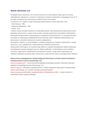 Numer alarmowy 112 Europejski Numer Alarmowy 112 to numer alarmowy do wykorzystania wtedy, gdy nie umiemy zidentyfikować zagrożenia w wymiarze 3 aktualnych numerów ratunkowych, zaczynających się od "9" lub kiedy wymagana jest interwencja wszystkich służb równocześnie. Z numerem 112 w dalszym ciągu funkcjonują dotychczasowe numery alarmowe, czyli: - Straż Pożarna - 998, - Pogotowie Ratunkowe - 999, - Policja - 997, z których należy korzystać stosownie do zaistniałej sytuacji. Idea dostosowania zasad alarmowania jednostek ratowniczych w naszym kraju wynika z potrzeby zapewnienia obywatelom odpowiednich standardów bezpieczeństwa obowiązujących w państwach stowarzyszonych, co wymaga stworzenia warunków do właściwego współdziałania Straży Pożarnej, Policji i Pogotowia Ratunkowego oraz opracowania i wdrożenia stosownych procedur postępowania. Korzystanie z telefonu 112 jest bezpłatne i umożliwia połączenie ze służbami ratowniczymi o każdej porze dnia i nocy, podobnie jak z dotychczasowych telefonów alarmowych. Jednocześnie informujemy, że używanie tego telefonu w sposób nieuzasadniony będzie skutkowało przewidzianymi prawem sankcjami karnymi. Należy podkreślić, że identyfikacja numeru telefonu rozmówcy, nagrywanie i rejestrowanie prowadzonych rozmów, mogą zostać wykorzystane do ustalenia zasadności wezwania służby ratowniczej, a także danych osoby wywołującej alarm fałszywy. Adresy stron propagujących i dostarczających informacje na temat zasad korzystania i funkcjonowania numeru alarmowego 112. www.ec.europa.eu/112 - strona Komisji Europejskiej prezentująca aktualne informacje dotyczące działania Europejskiego Numeru Alarmowego 112, www.112.gov.pl - informacje o podejmowanych w Polsce działaniach dotyczących funkcjonowania numeru alarmowego 112 i pracach nad jego upowszechnianiem, www.ec.europa.eu/information_society/activities/112/kids/index_en.htm - wersja dla dzieci (z możliwością wyboru języka polskiego).