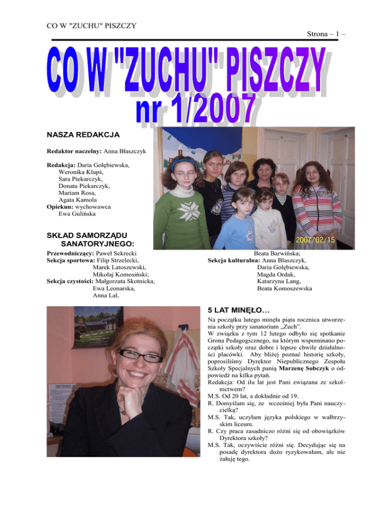 CO W "ZUCHU" PISZCZY Strona – 1 – NASZA REDAKCJA Redaktor naczelny: Anna Błaszczyk Redakcja: Daria Gołębiewska, Weronika Klupś, Sara Piekarczyk, Donata Piekarczyk, Mariam Rosa, Agata Kamola Opiekun: wychowawca Ewa Gulińska SKŁAD SAMORZĄDU SANATORYJNEGO: Przewodniczący: Paweł Sekrecki Sekcja sportowa: Filip Strzelecki, Marek Latoszewski, Mikołaj Komosiński; Sekcja czystości: Małgorzata Skotnicka, Ewa Leonarska, Anna Lal, Beata Barwińska; Sekcja kulturalna: Anna Blaszczyk, Daria Gołębiewska, Magda Ordak, Katarzyna Lang, Beata Komoszewska 5 LAT MINĘŁO… Na początku lutego minęła piąta rocznica utworzenia szkoły przy sanatorium „Zuch”. W związku z tym 12 lutego odbyło się spotkanie Grona Pedagogicznego, na którym wspominano początki szkoły oraz dobre i lepsze chwile działalności placówki. Aby bliżej poznać historię szkoły, poprosiliśmy Dyrektor Niepublicznego Zespołu Szkoły Specjalnych panią Marzenę Sobczyk o odpowiedź na kilka pytań. Redakcja: Od ilu lat jest Pani związana ze szkolnictwem? M.S. Od 20 lat, a dokładnie od 19. R. Domyślam się, ze wcześniej była Pani nauczycielką? M.S. Tak, uczyłam języka polskiego w wałbrzyskim liceum. R. Czy praca zasadniczo różni się od obowiązków Dyrektora szkoły? M.S. Tak, oczywiście różni się. Decydując się na posadę dyrektora dużo ryzykowałam, ale nie żałuję tego. CO W "ZUCHU" PISZCZY Strona – 2 – R. Czy udało się zrealizować wszystkie plany, które Pani miała w momencie zakładania szkoły? M.S. Tak, po zrealizowaniu w ostatnim okresie podsumowania, doszłam do wniosku, że udało się. R. Czy chciałaby Pani zmienić coś jeszcze w szkole? M.S. Tak, chciałabym aby warsztaty pracy były jeszcze nowocześniejsze. Życzyłabym sobie również, aby do naszego sanatorium przyjeżdżało jeszcze więcej młodzieży. R. Czy Pani zdaniem dzisiejsze dzieci i młodzież różnią się od tych sprzed kilku, kilkunastu lat? M.S. Różnią się, ponieważ dzisiejsza młodzież ma odmienne zainteresowania, między innymi: literatura i muzyka. R. Która praca bardziej się Pani podoba: jako nauczyciela – wychowawcy, kiedy jest bezpośredni kontakt z dziećmi, czy dyrektora, który ustala zasady panujące w placówce? M.S. Kocham posadę nauczycielki i zawsze się nią czuję. Rola dyrektora polega na czymś innym, ale również lubię tę pracę. R. Czy jest Pani zadowolona z działalności szkoły? M.S. Tak, ponieważ poziom jest wysoki i ciągle rośnie. Staramy się także ciągle udoskonalać wnętrze budynku. R. Dziękujemy za wywiad, a także życzymy kolejnych sukcesów i następnych rocznic oraz rozwoju placówki i realizacji dalszych planów. BAL PRZEBIERAŃCÓW Dnia 2 lutego 2007r. wybraliśmy się do Teatru Zdrojowego na Bal Przebierańców. W Teatrze czekało na nas wiele niespodzianek: konkursy, zabawy i słodkie nagrody. Wszystkie dzieci bardzo chętnie uczestniczyły w konkursie na najładniej zaśpiewaną piosenkę. Najwięcej emocji wzbudził jednak konkurs tzw. „krzesełka”, polegający na tym, że dzieci tańczyły wokół rozstawionych krzeseł, których było mniej niż osób. Kiedy muzyka cichła dzieci zajmowały krzesełka i za każdym razem jedna osoba musiała odpaść z gry, ta która nie znalazła wolnego miejsca. Uczestnik, który odchodził z gry zabierał ze sobą krzesełko i w ten sposób znów było więcej osób niż miejsc. Zabawa trwała do momentu kiedy zostały dwie osoby. Ostatecznie konkurs wygrała ośmioletnia Nikola. Główną atrakcją balu były stroje. W Te- trze można było spotkać: biedronki, osy, wróżki, królewny, a także żołnierzy i wojowników. Również młodsze dzieci sanatoryjne zaprezentowały się w przepięknych strojach karnawałowych: diabełka, czerwonego kapturka, czarownicy. Po trwającej kilka godzin zabawie, wszyscy kuracjusze bardzo zadowoleni wrócili do sanatorium. WALENTYNKI W środku zimy, 14 lutego, obchodzimy od niedawna nowe dla naszej kultury święto - Walentynki. Na zachodzie Europy Walentynki obchodzone są, co najmniej od XV w., zaś u nas zakochani w tym czasie świętowali w czerwcu, w wigilię św. Jana, w noc świętojańską. Walentynki najbardziej są obchodzone w USA i Anglii. Tego dnia zakochani, i młodsi i starsi, obdarowują się drobnymi prezencikami, oraz wyznają sobie miłość wysyłając kartki z życzeniami, tzw. Walentynki. Takie kartki - walentynki (najczęściej spotykany kształt i motyw na kartce to serce) powinny być anonimowe, podpisane tylko jako "Twój Walenty" lub "Twoja Walentynka", ale naprawdę zakochani łatwo orientują się, kto przysłał to wyznanie miłosne. Walentynki to również dobra okazja do okazania uczuć przez osoby nieśmiałe - można wysłać sympatyczną kartkę Walentynkę z serduszkami... i czekać na reakcję obdarowanej osoby, może miłość zostanie odwzajemniona! Walentynki to nowe dla nas święto, ale bardzo miłe, bo o miłość warto zabiegać nie tylko w Walentynki! Również w naszym sanatorium dzień 14 lutego był obchodzony w atmosferze miło- CO W "ZUCHU" PISZCZY Strona – 3 – ści. Wszystkie osoby, które skrywają swą miłość, mogły wysłać walentynkę ukochanej osobie. Dnia 14 lutego były walentynki. Oczywiście nasze sanatorium też je obchodziło, ale tylko niektórzy od rana. Po południu zaczęły się przygotowanie do zabawy dyskotekowej. Jedni wypisywali kartki dla swoich walentynek. a inni dmuchali balony i przywieszali serduszka. Już przed kolacją za- częło się przedstawienie, w którym chłopcy i dziewczyny ze starszych grup czytali wiersze o miłości znanych pisarzy. O godz.18.30 odbyła się dyskoteka. Tańczyły na niej pary zakochane i nie tylko. Niestety zakończyła się o 20.30 i nie wszyscy byli z tego powodu zadowoleni. KALAMBURY We wtorek 6 lutego, po kolacji w naszym sanatorium odbył się konkurs pt. „Kalambury”. W konkurencji brało udział pięć drużyn, reprezentujących każd