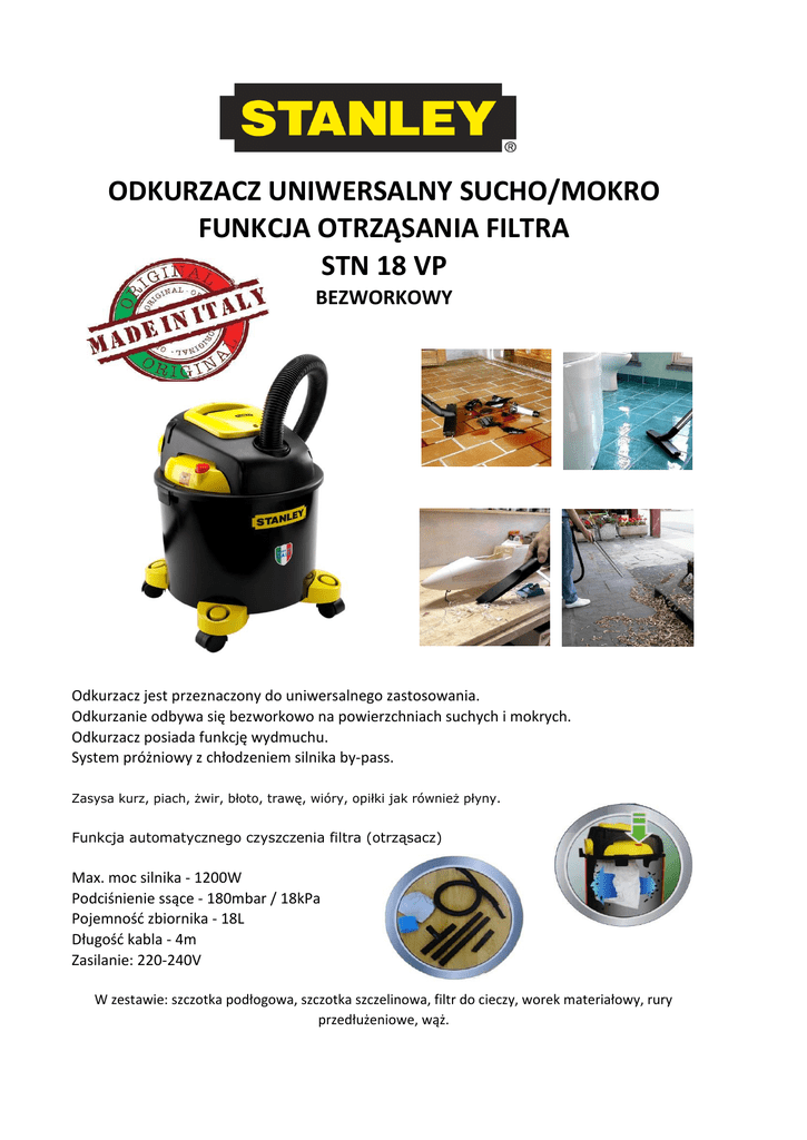 ODKURZACZ UNIWERSALNY SUCHO/MOKRO FUNKCJA OTRZĄSANIA FILTRA STN 18 VP BEZWORKOWY Odkurzacz jest przeznaczony do uniwersalnego zastosowania. Odkurzanie odbywa się bezworkowo na powierzchniach suchych i mokrych. Odkurzacz posiada funkcję wydmuchu. System próżniowy z chłodzeniem silnika by-pass. Zasysa kurz, piach, żwir, błoto, trawę, wióry, opiłki jak również płyny. Funkcja automatycznego czyszczenia filtra (otrząsacz) Max. moc silnika - 1200W Podciśnienie ssące - 180mbar / 18kPa Pojemność zbiornika - 18L Długość kabla - 4m Zasilanie: 220-240V W zestawie: szczotka podłogowa, szczotka szczelinowa, filtr do cieczy, worek materiałowy, rury przedłużeniowe, wąż.
