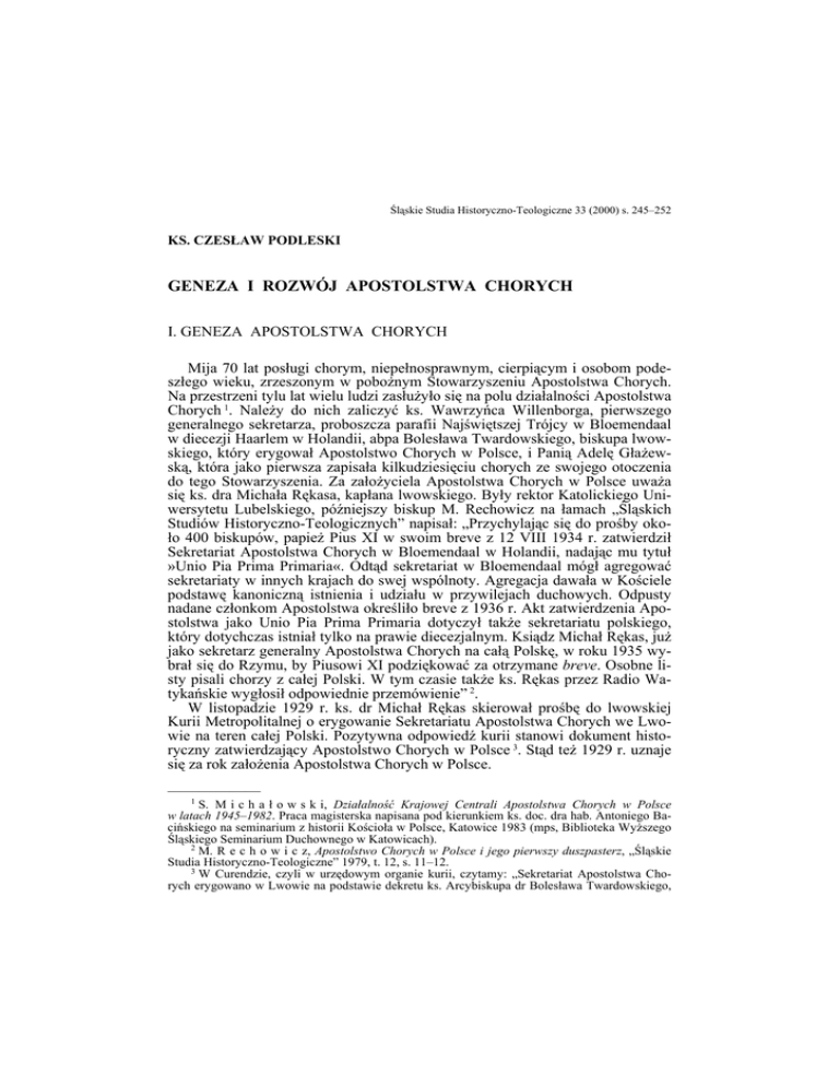 Śląskie Studia Historyczno-Teologiczne 33 (2000) s. 245–252 KS. CZESŁAW PODLESKI GENEZA I ROZWÓJ APOSTOLSTWA CHORYCH I. GENEZA APOSTOLSTWA CHORYCH Mija 70 lat posługi chorym, niepełnosprawnym, cierpiącym i osobom podeszłego wieku, zrzeszonym w pobożnym Stowarzyszeniu Apostolstwa Chorych. Na przestrzeni tylu lat wielu ludzi zasłużyło się na polu działalności Apostolstwa Chorych 1. Należy do nich zaliczyć ks. Wawrzyńca Willenborga, pierwszego generalnego sekretarza, proboszcza parafii Najświętszej Trójcy w Bloemendaal w diecezji Haarlem w Holandii, abpa Bolesława Twardowskiego, biskupa lwowskiego, który erygował Apostolstwo Chorych w Polsce, i Panią Adelę Głażewską, która jako pierwsza zapisała kilkudziesięciu chorych ze swojego otoczenia do tego Stowarzyszenia. Za założyciela Apostolstwa Chorych w Polsce uważa się ks. dra Michała Rękasa, kapłana lwowskiego. Były rektor Katolickiego Uniwersytetu Lubelskiego, późniejszy biskup M. Rechowicz na łamach „Śląskich Studiów Historyczno-Teologicznych” napisał: „Przychylając się do prośby około 400 biskupów, papież Pius XI w swoim breve z 12 VIII 1934 r. zatwierdził Sekretariat Apostolstwa Chorych w Bloemendaal w Holandii, nadając mu tytuł »Unio Pia Prima Primaria«. Odtąd sekretariat w Bloemendaal mógł agregować sekretariaty w innych krajach do swej wspólnoty. Agregacja dawała w Kościele podstawę kanoniczną istnienia i udziału w przywilejach duchowych. Odpusty nadane członkom Apostolstwa określiło breve z 1936 r. Akt zatwierdzenia Apostolstwa jako Unio Pia Prima Primaria dotyczył także sekretariatu polskiego, który dotychczas istniał tylko na prawie diecezjalnym. Ksiądz Michał Rękas, już jako sekretarz generalny Apostolstwa Chorych na całą Polskę, w roku 1935 wybrał się do Rzymu, by Piusowi XI podziękować za otrzymane breve. Osobne listy pisali chorzy z całej Polski. W tym czasie także ks. Rękas przez Radio Watykańskie wygłosił odpowiednie przemówienie” 2. W listopadzie 1929 r. ks. dr Michał Rękas skierował prośbę do lwowskiej Kurii Metropolitalnej o erygowanie Sekretariatu Apostolstwa Chorych we Lwowie na teren całej Polski. Pozytywna odpowiedź kurii stanowi dokument historyczny zatwierdzający Apostolstwo Chorych w Polsce 3. Stąd też 1929 r. uznaje się za rok założenia Apostolstwa Chorych w Polsce. —————— 1 S. M i c h a ł o w s k i, Działalność Krajowej Centrali Apostolstwa Chorych w Polsce w latach 1945–1982. Praca magisterska napisana pod kierunkiem ks. doc. dra hab. Antoniego Bacińskiego na seminarium z historii Kościoła w Polsce, Katowice 1983 (mps, Biblioteka Wyższego Śląskiego Seminarium Duchownego w Katowicach). 2 M. R e c h o w i c z, Apostolstwo Chorych w Polsce i jego pierwszy duszpasterz, „Śląskie Studia Historyczno-Teologiczne” 1979, t. 12, s. 11–12. 3 W Curendzie, czyli w urzędowym organie kurii, czytamy: „Sekretariat Apostolstwa Chorych erygowano w Lwowie na podstawie dekretu ks. Arcybiskupa dr Bolesława Twardowskiego, 246 KS. CZESŁAW PODLESKI Ks. Rękas zaplanował na listopad 1939 r. uroczyste obchody 10-lecia Apostolstwa Chorych, a w 1979 r. ks. dr Jan Szurlej obchodził 50-lecie Apostolstwa Chorych w Polsce. II. CZYM JEST APOSTOLSTWO CHORYCH? Apostolstwo Chorych jest wspólnotą, która pomaga chorym przeżywać cierpienie w sposób twórczy, bardziej Chrystusowy. Jest stowarzyszeniem w ten sposób nazwanym przez papieża Piusa XI. Papież wyraził nadzieję, że świat ludzi cierpiących, tak często niezauważonych i lekceważonych przez zdrowych i silnych tego świata, jest duchową potęgą. Pius XI uczynił Apostolstwo Chorych obok Akcji Katolickiej wzorem postawy apostolskiej. „Oczekuję od tego Apostolstwa – napisał Pius XI – wielkich korzyści dla Kościoła, ponieważ tu otwierają się nowe źródła dotąd ukryte” 4. Zwróćmy uwagę na apostolski charakter owego pobożnego stowarzyszenia. Apostolstwo Chorych, według ks. Michała Rękasa, nie zastępuje duszpasterstwa i miłosierdzia, lecz je uzupełnia. „Dopełnia to, czego tam nie ma i pragnie własną rodzinę, własną parafię, a przede wszystkim siebie uświęcić, złączyć z Chrystusem żyjącym w Kościele na większy pożytek chorego, rodziny, towarzystw, do których chory należy i całego narodu” 5. Ks. Rękas uważał, że: „Apostolstwo Chorych ma za cel uczynić z chorych apostołów przez przyjęcie, znoszenie i ofiarowanie cierpień za Kościół i zbawienie dusz. Apostolstwo podnosi chorego na duchu, ukazuje mu wielkie możliwości pracy twórczej mimo choroby i przez chorobę, uczy chorego cierpieć dobrze, po chrześcijańsku” 6. Apostolstwo chorego jest szczególnym świadectwem. Jest to świadectwo o Chrystusie. Rękas poucza: „Apostolstwo Chorych dąży w pierwszym rzędzie do tego, by skarb cierpienia oddać na chwałę Bożą, ale również przez uporządkowanie wewnętrznego życia u chorego, ułatwia mu walkę o zdrowie, wyzwala jego siły do skuteczniejszej współpracy z lekarzem, pielęgniarka i rodziną” 7. III. ZAŁOŻYCIEL APOSTOLSTWA CHORYCH I JEGO DZIAŁALNOŚĆ Ks. dr Michał Rękas urodził się 28 IX 1895 r. we wsi Łany Polskie w woj. tarnopolskim. Tam też uczęszczał do szkoły podstawowej. W czerwcu 1914 r. zdał egzamin dojrzałości w gimnazjum klasycznym we Lwowie. Po maturze ze względów zdrowotnych przez rok przebywał w domu. W 1915 r. wstąpił do Seminarium Duchownego we Lwowie i studiował na Wydziale Teologicznym Uniwersytetu im. Jana Kazimierza. Po ukończeniu studiów teologicznych 29 V 1919 r. otrzymał w bazylice lwowskiej święcenia kapłańskie z rąk abpa Bilczewskiego. Pierwszymi placówkami pracy ks. Rękasa był Tarnopol i Złoczów, —————— z dnia 12 maja 1930 r. Konferencja Episkopatu Polski zebrana dnia 24 czerwca 1930 r. w Poznaniu zatwierdziła dzieło Apostolstwa Chorych dla całej Polski, a sekretariat we Lwowie, ul.