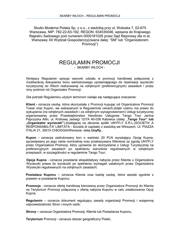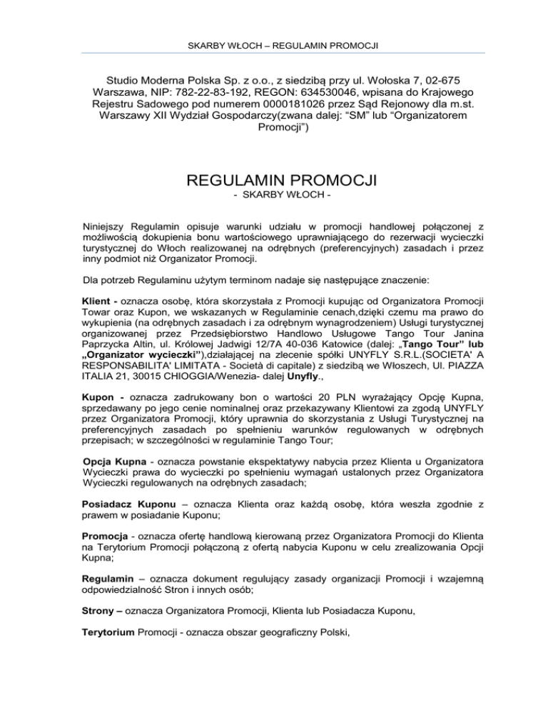 SKARBY WŁOCH – REGULAMIN PROMOCJI Studio Moderna Polska Sp. z o.o., z siedzibą przy ul. Wołoska 7, 02-675 Warszawa, NIP: 782-22-83-192, REGON: 634530046, wpisana do Krajowego Rejestru Sadowego pod numerem 0000181026 przez Sąd Rejonowy dla m.st. Warszawy XII Wydział Gospodarczy(zwana dalej: “SM” lub “Organizatorem Promocji”) REGULAMIN PROMOCJI - SKARBY WŁOCH - Niniejszy Regulamin opisuje warunki udziału w promocji handlowej połączonej z możliwością dokupienia bonu wartościowego uprawniającego do rezerwacji wycieczki turystycznej do Włoch realizowanej na odrębnych (preferencyjnych) zasadach i przez inny podmiot niż Organizator Promocji. Dla potrzeb Regulaminu użytym terminom nadaje się następujące znaczenie: Klient - oznacza osobę, która skorzystała z Promocji kupując od Organizatora Promocji Towar oraz Kupon, we wskazanych w Regulaminie cenach,dzięki czemu ma prawo do wykupienia (na odrębnych zasadach i za odrębnym wynagrodzeniem) Usługi turystycznej organizowanej przez Przedsiębiorstwo Handlowo Usługowe Tango Tour Janina Paprzycka Altin, ul. Królowej Jadwigi 12/7A 40-036 Katowice (dalej: „Tango Tour” lub „Organizator wycieczki”),działającej na zlecenie spółki UNYFLY S.R.L.(SOCIETA' A RESPONSABILITA' LIMITATA - Società di capitale) z siedzibą we Włoszech, Ul. PIAZZA ITALIA 21, 30015 CHIOGGIA/Wenezia- dalej Unyfly., Kupon - oznacza zadrukowany bon o wartości 20 PLN wyrażający Opcję Kupna, sprzedawany po jego cenie nominalnej oraz przekazywany Klientowi za zgodą UNYFLY przez Organizatora Promocji, który uprawnia do skorzystania z Usługi Turystycznej na preferencyjnych zasadach po spełnieniu warunków regulowanych w odrębnych przepisach; w szczególności w regulaminie Tango Tour; Opcja Kupna - oznacza powstanie ekspektatywy nabycia przez Klienta u Organizatora Wycieczki prawa do wycieczki po spełnieniu wymagań ustalonych przez Organizatora Wycieczki regulowanych na odrębnych zasadach; Posiadacz Kuponu – oznacza Klienta oraz każdą osobę, która weszła zgodnie z prawem w posiadanie Kuponu; Promocja - oznacza ofertę handlową kierowaną przez Organizatora Promocji do Klienta na Terytorium Promocji połączoną z ofertą nabycia Kuponu w celu zrealizowania Opcji Kupna; Regulamin – oznacza dokument regulujący zasady organizacji Promocji i wzajemną odpowiedzialność Stron i innych osób; Strony – oznacza Organizatora Promocji, Klienta lub Posiadacza Kuponu, Terytorium Promocji - oznacza obszar geograficzny Polski, Towar – oznacza jakąkolwiek rzecz ruchomą z oferty Organizatora Promocji, Usługa turystyczna – oznacza stosunek umowny powstały po wykonaniu Opcji Kupna w postaci zawarcia przez Posiadacza Kuponu umowy o świadczenie usług turystycznych w rozumieniu Ustawy o usługach turystycznych z dnia 29 sierpnia 1997 r. tekst jednolity z dnia 26 czerwca 2003 r. (Dz.U. Nr 153, poz. 1503 ze zm.), organizowanych przez Tango Tour na zlecenie Unyfly. I. Postanowienia wstępne 1.1. Organizator Promocji kieruje ją do Klientów na podstawie Regulaminu. 1.2. Regulamin określa prawa i obowiązki Stron Promocji oraz relację z innymi podmiotami. 1.3. Udział w Promocji jest dobrowolny. II. Podstawowe zasady Promocji, Prawa Posiadacza Kuponu 2.1. Aby zostać Klientem, uczestnik Promocji, tj. osoba, do której ją skierowano, zobowiązany jest dokonać zakupu Towaru w kwocie nie niższej niż 200 PLN za pośrednictwem sklepu internetowego Organizatora Promocji znajdującego się na stronie www.topshop.pl lub przez centrum telefoniczne (callcenter) Organizatora Promocji pod numerem telefonu 22 512 53 23 oraz dokupić do nabytego Towaru Kupon i go otrzymać w ustalony przez SM sposób łącznie z Towarem. 2.2. Z chwilą doręczenia Towaru Klientowi wraz z Kuponem powstaje prawo do przenoszenia posiadania Kuponu na osoby trzecie. 2.3. Posiadacz Kuponu ma prawo, przed wygaśnięciem ważności Kuponu, do rezerwacji Usługi turystycznej za wniesieniem opłaty rezerwacyjnej u Organizatora Wycieczki w kwocie 220 PLNna zasadach opisanych w regulaminie Organizatora Wycieczki;. 2.4. Z chwilą rezerwacji wycieczki wygasa prawo Posiadacza Kuponu do jego przenoszenia na osoby trzecie. 2.5. roku. Ważność Kuponów uczestniczących w Promocji wygasa w dniu 31 grudnia 2013 III. Rola Organizatora Promocji oraz innych podmiotów 3.1. Wystawcą Kuponów jest UNIFLY. 3.2. Organizator Promocji, oferując nabycie Kuponów działa jako agent na rzecz Unyfly, ale nie w jej imieniu. Oznacza to, że stroną ewentualnej umowy o świadczenie Usługi Turystycznej oraz gwarantem Opcji Kupna i wyłącznie odpowiedzialnym z tych tytułów w odniesieniu do Posiadacza Kuponu jest Organizator wycieczki działający na zlecenie Unyfly (odpowiedzialność solidarna). 3.3. Organizator Promocji pośredniczy w sprzedaży Kuponów oferując ich nabycie za pośrednictwem środków masowego przekazu w tym mediów elektronicznych oraz innych kanałów marketingowych, które uzna za stosowne. 2|Strona 3.4. Organizator Promocji nie składa obietnicy zrealizowania Usługi Turystycznej jako nagrody za nabycie przez Klienta Kuponu i skorzystania z Opcji Kupna w rozumieniu art. 919 ustawy Kodeks cywilny. 3.5. Niezależnie od szkód, jakie każda ze Stron lub osoba trzecia mogą ponieść z tytułu udziału w Promocji odpowiedzialność Organizatora Promocji wobec Posiadacza Kuponu,w stopniu dopuszczonym przez prawo, jest ograniczona do kwoty pieniężnej rzeczywiście otrzymanej przez SM. IV. Proces reklamacyjny 4.1 Organizator wycieczki przyjmuje, zarządza oraz jest wyłącznie odpowiedzialny za reklamacje wnoszone przez Posiadaczy Kuponów dotyczące Usługi Turystycznej oraz Opcji Kupna. 4.2. Z uwagi na to, że Organizator Promocji nie jest stroną umowy o wykonanie Usługi Turystycznej, nie gwarantuje jej zawarcia, ani jej nie obiecuje, nie jest także w odniesieniu do Kuponu i Opcji Kupna stroną umowy zawieranej na odległość w rozumieniu Ustawy o ochronie 