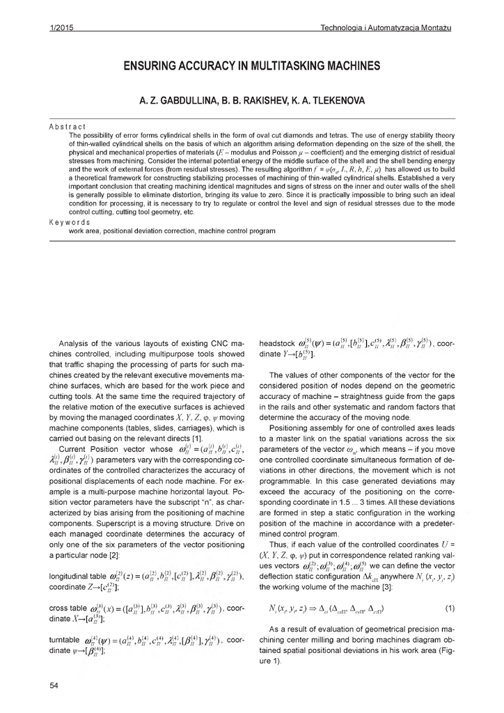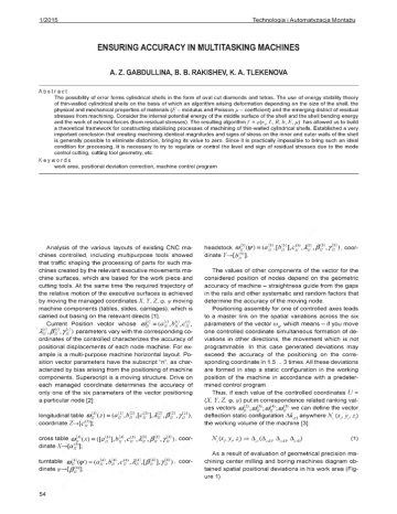 1/2015 Technologia i Automatvzacja Montazu ENSURING ACCURACY IN MULTITASKING MACHINES A. Z. GABDULLINA, B. B. RAKISHEV, K. A. TLEKENOVA Abstract The possibility of error forms cylindrical shells in the form of oval cut diamonds and tetras. The use of energy stability theory of thin-walled cylindrical shells on the basis of which an algorithm arising deformation depending on the size of the shell, the physical and mechanical properties of materials (E - modulus and Poisson и - coefficient) and the emerging district of residual stresses from machining. Consider the internal potential energy of the middle surface of the shell and the shell bending energy and the work of external forces (from residual stresses). The resulting algorithm f = q>(pe, L, R, h, E, /и) has allowed us to build a theoretical framework for constructing stabilizing processes of machining of thin-walled cylindrical shells. Established a very important conclusion that creating machining identical magnitudes and signs of stress on the inner and outer walls of the shell is generally possible to eliminate distortion, bringing its value to zero. Since it is practically impossible to bring such an ideal condition for processing, it is necessary to try to regulate or control the level and sign of residual stresses due to the mode control cutting, cutting tool geometry, etc. Keywor ds work area, positional deviation correction, machine control program Analysis of the various layouts of existing CNC ma chines controlled, including multipurpose tools showed headstock (D^\y/) = ( a ^ \ [ b ^ ] , c ^ \ ^ , , coor dinate Г —> [^ 5)]. that traffic shaping the processing of parts for such ma chines created by the relevant executive movements ma The values of other components of the vector for the chine surfaces, which are based for the w ork piece and considered position of nodes depend on the geometric cutting tools. A t the same time the required trajectory of accuracy of machine - straightness guide from the gaps the relative motion of the executive surfaces is achieved in the rails and other system atic and random factors that by moving the managed coordinates X, Y, Z, ф, ц moving determine the accuracy of the moving node. machine components (tables, slides, carriages), which is carried out basing on the relevant directs [1]. Positioning assembly for one of controlled axes leads to a master link on the spatial variations across the six = (a ^ ,b ^ ,c ^ , parameters of the vector ып, which means - if you move , y ^ ) parameters vary with the corresponding co one controlled coordinate simultaneous formation of de ordinates of the controlled characterizes the accuracy of viations in other directions, the movement which is not Current Position vector whose positional displacements of each node machine. For ex programmable. In this case generated deviations may ample is a multi-purpose machine horizontal layout. Po exceed the accuracy of the positioning on the corre sition vector parameters have the subscript "n” , as char sponding coordinate in 1.5 ... 3 times. All these deviations acterized by bias arising from the positioning of machine are formed in step a static configuration in the working components. Superscript is a moving structure. Drive on position of the machine in accordance with a predeter each managed coordinate determines the accuracy of mined control program. only one of the six parameters of the vector positioning Thus, if each value of the controlled coordinates U = (X, Y, Z, ф, ц) put in correspondence related ranking val a particular node [2]: ues vectors longitudinal table a $ ( z ) = ( a ^ , y$), coordinate Z —>[c^2)]; cross table c o f ( x ) = ( [ a ^ ], b f , c ™, dinate X —>[aifl )\, ) , coor we can define the vector deflection static configuration Akcn anywhere N X y,, z) the working volume of the machine [3]: N,(X,, У,, Z) ^ Ac(Acxn, А суП, A czn) (1) As a result of evaluation of geometrical precision ma turntable a% \yf) = (а[* \Ь [* \ с ^ \ Л [§ dinate > coor' chining center milling and boring machines diagram ob tained spatial positional deviations in his work area (Fig ure 1). 54 Technologia i Automatvzacja Montazu 1/2015 Fig. 1. The spatial positional deviation in the working area of the machine Compensation arising positional deviations Akcn can be accomplished in the following manner correction. The method consists in the fact that in accordance with the where (X, Y, Z, y) - coordinates given in the source pro identified deviations in the values of a particular point of gram the machine control; K „ , K „ , K „ , K - correction the working area of the machine A c. = (Acxn, A cyn, A czn) value for each of the control coordinates; X * , Y*, Z *, autom atically makes the necessary amendm ent to the coordinates of the controlled program block [4]: y * - corrected coordinate values transmitted by refine ment of the actuators of the machine. Correction, introduced by each control coordinate is (K , K y i, K x i')= L[(-A ), (-A ), (-A ) v xi ' cxi' ' cyi' ' czi' for x.i e (x ... x ' max ); *yi e (y ... *y V” max (2) ); zi e (z ' m given by: z (4) Manage a multi-purpose machine with a computer implemented method allows applying corrections to the machine control program by changing the text frame pro gram immediately before the information received from them for mining machine. This method allows for the rapid correction in the course of performing the process or in short notation K = A ■Y ing required to make a change in the text of the corre where A - functional matrix coefficients that take into ac sponding frame of the control program. When this restric count the impact of the current coordinates to the value tion correction procedure can only be the time required of corrective action. to change the desired setting, which does not affect the continuity of the processing details. Elements of the matrix A is determined according to the expression (4) by a composite tra