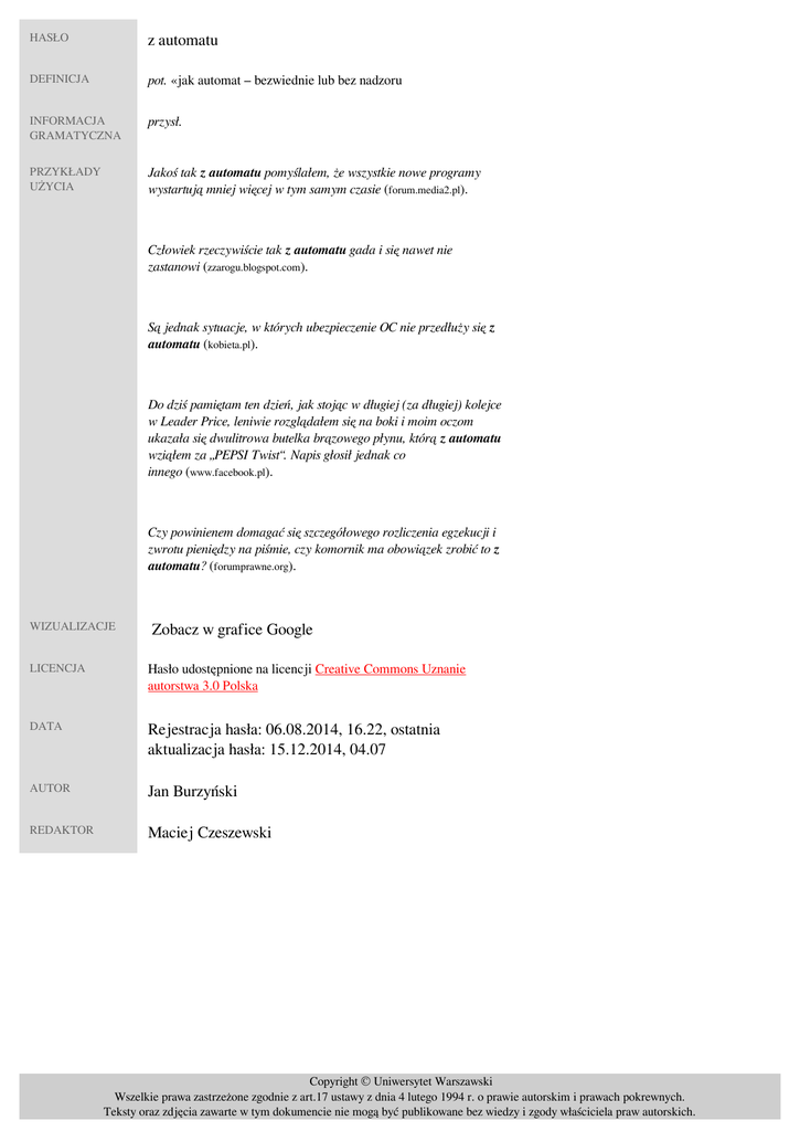 HASŁO z automatu DEFINICJA pot. «jak automat – bezwiednie lub bez nadzoru» INFORMACJA GRAMATYCZNA przysł. PRZYKŁADY UŻYCIA Jakoś tak z automatu pomyślałem, że wszystkie nowe programy wystartują mniej więcej w tym samym czasie (forum.media2.pl). Człowiek rzeczywiście tak z automatu gada i się nawet nie zastanowi (zzarogu.blogspot.com). Są jednak sytuacje, w których ubezpieczenie OC nie przedłuży się z automatu (kobieta.pl). Do dziś pamiętam ten dzień, jak stojąc w długiej (za długiej) kolejce w Leader Price, leniwie rozglądałem się na boki i moim oczom ukazała się dwulitrowa butelka brązowego płynu, którą z automatu wziąłem za „PEPSI Twist“. Napis głosił jednak co innego (www.facebook.pl). Czy powinienem domagać się szczegółowego rozliczenia egzekucji i zwrotu pieniędzy na piśmie, czy komornik ma obowiązek zrobić to z automatu? (forumprawne.org). WIZUALIZACJE Zobacz w grafice Google LICENCJA Hasło udostępnione na licencji Creative Commons Uznanie autorstwa 3.0 Polska DATA Rejestracja hasła: 06.08.2014, 16.22, ostatnia aktualizacja hasła: 15.12.2014, 04.07 AUTOR Jan Burzyński REDAKTOR Maciej Czeszewski Copyright © Uniwersytet Warszawski Wszelkie prawa zastrzeżone zgodnie z art.17 ustawy z dnia 4 lutego 1994 r. o prawie autorskim i prawach pokrewnych. Teksty oraz zdjęcia zawarte w tym dokumencie nie mogą być publikowane bez wiedzy i zgody właściciela praw autorskich. Powered by TCPDF (www.tcpdf.org)