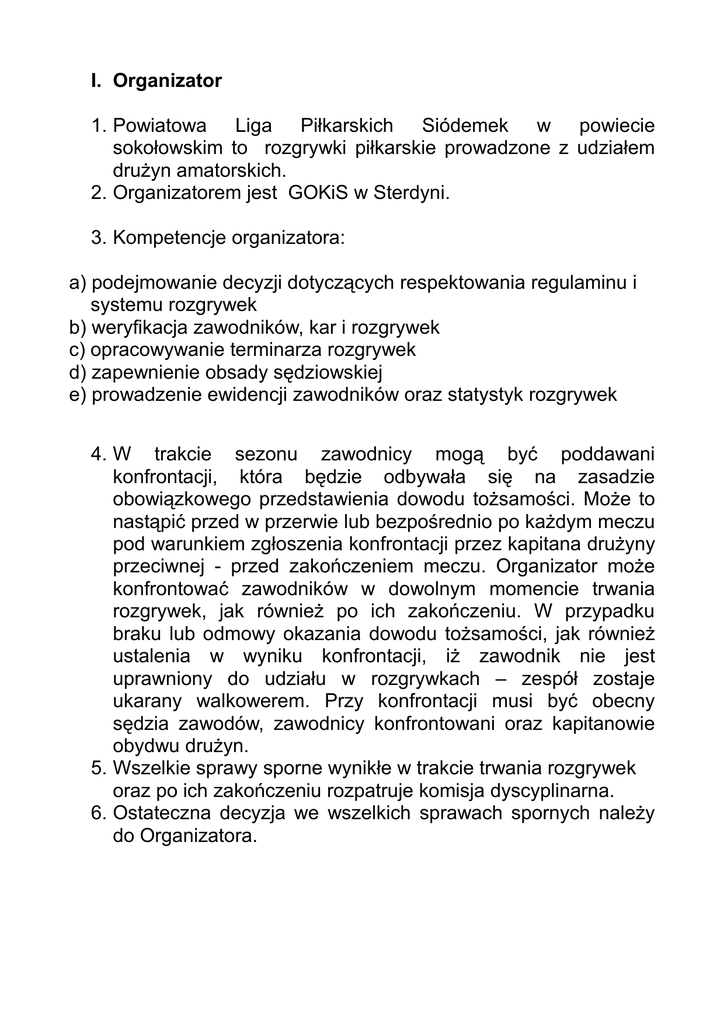 I. Organizator 1. Powiatowa Liga Piłkarskich Siódemek w powiecie sokołowskim to rozgrywki piłkarskie prowadzone z udziałem drużyn amatorskich. 2. Organizatorem jest GOKiS w Sterdyni. 3. Kompetencje organizatora: a) podejmowanie decyzji dotyczących respektowania regulaminu i systemu rozgrywek b) weryfikacja zawodników, kar i rozgrywek c) opracowywanie terminarza rozgrywek d) zapewnienie obsady sędziowskiej e) prowadzenie ewidencji zawodników oraz statystyk rozgrywek 4. W trakcie sezonu zawodnicy mogą być poddawani konfrontacji, która będzie odbywała się na zasadzie obowiązkowego przedstawienia dowodu tożsamości. Może to nastąpić przed w przerwie lub bezpośrednio po każdym meczu pod warunkiem zgłoszenia konfrontacji przez kapitana drużyny przeciwnej - przed zakończeniem meczu. Organizator może konfrontować zawodników w dowolnym momencie trwania rozgrywek, jak również po ich zakończeniu. W przypadku braku lub odmowy okazania dowodu tożsamości, jak również ustalenia w wyniku konfrontacji, iż zawodnik nie jest uprawniony do udziału w rozgrywkach – zespół zostaje ukarany walkowerem. Przy konfrontacji musi być obecny sędzia zawodów, zawodnicy konfrontowani oraz kapitanowie obydwu drużyn. 5. Wszelkie sprawy sporne wynikłe w trakcie trwania rozgrywek oraz po ich zakończeniu rozpatruje komisja dyscyplinarna. 6. Ostateczna decyzja we wszelkich sprawach spornych należy do Organizatora. II. System rozgrywek 1. System rozgrywek w każdej edycji PLPS uzależniony będzie od ilości zgłoszonych drużyn. 2. Precyzyjne określenie systemu rozgrywek m.in. z podziałem na ligi, zasady awansu i spadku zespołów, organizator określi po zamknięciu terminu do zgłaszania drużyn. 3. Każdy zespół zgłasza do rozgrywek listę zawodników z dokładną datą urodzenia i informacją o osobie odpowiedzialnej za drużynę – kierownik, kapitan. 4. W lidze mogą brać udział: a) zawodnicy powyżej 14 roku życia b) zawodnicy niezrzeszeni c) zawodnicy zrzeszeni w klubach sportowych, niezależnie od klasy rozgrywkowej, którzy w rundzie jesiennej danego sezonu rozgrywkowego nie wystąpili w żadnym oficjalnym meczu seniorów. d) zawodnicy którzy ukończyli 35 lat bez względu na przynależność do jakiegokolwiek klubu. 5. Drużyny składają się maksymalnie z 15 zawodników, zgłoszonych wcześniej na liście startowej i występują w jednolitych, ponumerowanych strojach (bramkarz musi grać w stroju odróżniającym się kolorystycznie od stroju drużyny). a) zespoły grają w składach 6 graczy w polu + bramkarz b) zmiany prowadzone są w systemie „hokejowym” w czasie przerw w grze. Ilość zmian jest nieograniczona. c) wprowadza się „strefę zmian”, która dotyczy linii środkowej boiska d) bramkarz może zamienić się miejscami z każdym zawodnikiem pod warunkiem, że zmiana zostanie dokonana za zgodą sędziego oraz nastąpi ona podczas przerw w grze e) zawodnicy występują w obuwiu odpowiadającym wymogom nawierzchni boiska. f) zawodnik może grać tylko w jednym zespole, natomiast zmiany w składzie drużyny (w tym transfery pomiędzy zespołami) można dokonać tylko i wyłącznie w okresie transferowym tzn. między poszczególnymi rundami rozgrywek. g) transfer z drużyny do drużyny biorącej udział w rozgrywkach wymaga uregulowania należności finansowej w kwocie 100 PLN h) zespół może zgłosić w okresie transferowym nowego zawodnika w miejsce znajdującego się już na liście – bądź uzupełniając w ten sposób jej skład do poziomu opisanego w ust. 5 (max. 3 (trzech)) po uregulowaniu należności finansowych w kwocie 50 PLN za każdego zawodnika. i) prawo wyboru koszulek przysługuje zespołowi wymienionemu w terminarzu na pozycji – gospodarze j) kapitan drużyny musi posiadać na ramieniu widoczną opaskę. 6. Do prowadzenia zawodów musi być wyznaczony sędzia, który odpowiada za obiektywne prowadzenie zawodów. Uprawnienia sędziego i posługiwanie się prawem nadanym mu przez Przepisy Gry, rozpoczynają się z chwilą wejścia na obiekt gdzie rozgrywane będą zawody. Rozstrzygnięciom sędziowskim podlegają również przewinienia dokonywane podczas chwilowej przerwy w grze oraz gdy piłka jest poza grą. Zawodnik rezerwowy również podlega odpowiedzialności przed sędzią. Ta sama sytuacja dotyczy wszystkich zawodników po zakończeniu spotkania, aż do momentu opuszczenia przez sędziego obiektu, na którym znajduje się boisko. Rozstrzygnięcia sędziego dotyczące faktów związanych z grą, jak również i wyniku meczu są ostateczne. Zawody muszą się odbywać również w przypadku nie przybycia na nie sędziego, wyznaczonego do ich prowadzenia. W razie nie przybycia na zawody, najpóźniej na 5 minut przed wyznaczoną godziną meczu Kapitanowie obydwu drużyn proponują swojego kandydata do prowadzenia zawodów. Wymieniony sędzia ma identyczne prawa i obowiązki jak sędzia pierwotnie wyznaczony do prowadzenia meczu. W czasie spotkania sędzia nie może być zmieniony. Wyjątek stanowi niedyspozycja lub kontuzja sędziego, uniemożliwiająca mu kontynuowanie prowadzenia spotkania. Sędzia ma prawo nie dopuścić zawodnika do gry wówczas, gdy zawodnik nie zachowuje się sportowo lub jest w stanie wskazującym na spożycie alkoholu. 7. W przypadku niemożności rozegrania przez jedną z drużyn meczu, w ustalonym dniu i o określonej godzinie, zainteresowana drużyna musi ustalić ze swym przeciwnikiem – najpóźniej tydzień przed terminem spotkania - inny termin, oraz uzyskać zgodę Organizatora. Obowiązek załatwienia wszystkich spraw związanych z tym faktem spada na kierownika zespołu zainteresowanego zmianą. Przełożenie meczu możliwe jest tylko jednorazowo i wymaga uregulowania należności w kwocie 50 PLN na rzecz organizatora. a) przełożony mecz musi być rozegrany w terminie 3 kolejek od pierwotnego terminu, jednakże nie później niż na 2 kolejki przed zakończeniem rozgrywek PLPS. b)