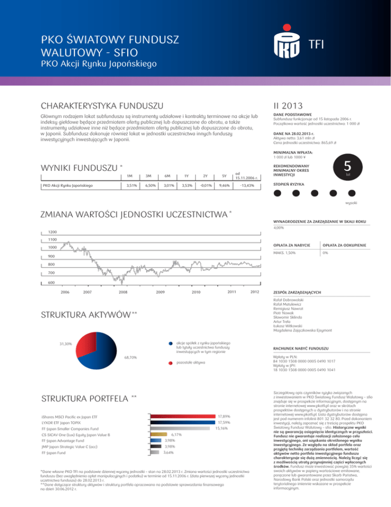 PKO ŚWIATOWY FUNDUSZ WALUTOWY - SFIO PKO Akcji Rynku Japońskiego CHARAKTERYSTYKA FUNDUSZU II 2013 Głównym rodzajem lokat subfunduszu są instrumenty udziałowe i kontrakty terminowe na akcje lub indeksy giełdowe będące przedmiotem oferty publicznej lub dopuszczone do obrotu, a także instrumenty udziałowe inne niż będące przedmiotem oferty publicznej lub dopuszczone do obrotu, w Japonii. Subfundusz dokonuje również lokat w jednostki uczestnictwa innych funduszy inwestycyjnych inwestujących w Japonii. DANE PODSTAWOWE Subfundusz funkcjonuje od 15 listopada 2006 r. Początkowa wartość jednostki uczestnictwa: 1 000 zł DANE NA 28.02.2013 r. Aktywa netto: 3,61 mln zł Cena jednostki uczestnictwa: 865,69 zł MINIMALNA WPŁATA: 1 000 zł lub 1000 ¥ WYNIKI FUNDUSZU * PKO Akcji Rynku Japońskiego 1M 3M 6M 3,51% 6,50% 3,01% 1Y 2Y 5Y od 15.11.2006 r. 3,53% -0,01% 9,46% -13,43% 5 REKOMENDOWANY MINIMALNY OKRES INWESTYCJI lat STOPIEŃ RYZYKA wysoki ZMIANA WARTOŚCI JEDNOSTKI UCZESTNICTWA * WYNAGRODZENIE ZA ZARZĄDZANIE W SKALI ROKU 4,00% 1200 1100 1000 900 OPŁATA ZA NABYCIE OPŁATA ZA ODKUPIENIE MAKS. 1,50% 0% 800 700 600 2006 2007 2008 2009 2010 2011 31,30% akcje spółek z rynku japońskiego lub tytuły uczestnictwa funduszy inwestujących w tym regionie RACHUNEK NABYĆ FUNDUSZU pozostałe aktywa Wpłaty w PLN: 84 1030 1508 0000 0005 0490 1017 Wpłaty w JPY: 18 1030 1508 0000 0005 0490 1041 68,70% ** 17,89% iShares MSCI Pacific ex Japan ETF 17,59% LYXOR ETF Japan TOPIX 15,16% FF-Japan Smaller Companies Fund CS SICAV One (Lux) Equity Japan Value B FF-Japan Advantage Fund JMP Japan Strategic Value C (acc) FF-Japan Fund ZESPÓŁ ZARZĄDZAJĄCYCH Rafał Dobrowolski Rafał Matulewicz Remigiusz Nawrat Piotr Nowak Sławomir Sklinda Artur Trela Łukasz Witkowski Magdalena Zajączkowska Ejsymont STRUKTURA AKTYWÓW ** STRUKTURA PORTFELA 2012 6,17% 3,98% 3,98% 3,64% *Dane własne PKO TFI na podstawie dziennej wyceny jednostki – stan na 28.02.2013 r. Zmiana wartości jednostki uczestnictwa funduszu (bez uwzględnienia opłat manipulacyjnych i podatku) w terminie od 15.11.2006 r. (data pierwszej wyceny jednostki uczetnictwa funduszu) do 28.02.2013 r. **Dane dotyczące struktury aktywów i struktury portfela opracowano na podstawie sprawozdania finansowego na dzień 30.06.2012 r. Szczegółowy opis czynników ryzyka związanych z inwestowaniem w PKO Światowy Fundusz Walutowy – sfio znajduje się w prospekcie informacyjnym, dostępnym na stronie internetowej www.pkotfi.pl oraz w skrótach prospektów dostępnych u dystrybutorów i na stronie internetowej www.pkotfi.pl. Lista dystrybutorów dostępna jest pod numerem infolinii 801 32 32 80. Przed dokonaniem inwestycji, należy zapoznać się z treścią prospektu PKO Światowy Fundusz Walutowy – sfio. Historyczne wyniki nie są gwarancją osiągnięcia identycznych w przyszłości. Fundusz nie gwarantuje realizacji założonego celu inwestycyjnego, ani uzyskania określonego wyniku inwestycyjnego. Ze względu na skład portfela oraz przyjętą technikę zarządzania portfelem, wartość aktywów netto portfela inwestycyjnego funduszu charakteryzuje się dużą zmiennością. Należy liczyć się z możliwością utraty przynajmniej części wpłaconych środków. Fundusz może inwestować powyżej 35% wartości swoich aktywów w papiery wartościowe emitowane, poręczone lub gwarantowane przez Skarb Państwa, Narodowy Bank Polski oraz jednostki samorządu terytorialnego imiennie wskazane w prospekcie informacyjnym.