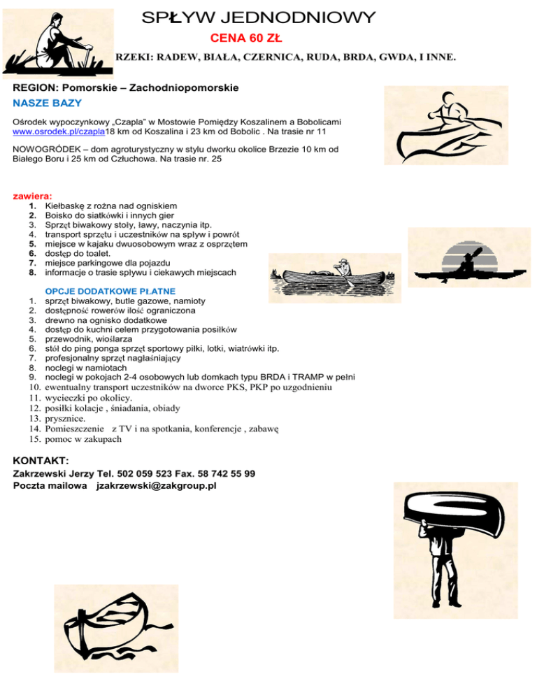 SPŁYW JEDNODNIOWY CENA 60 ZŁ RZEKI: RADEW, BIAŁA, CZERNICA, RUDA, BRDA, GWDA, I INNE. REGION: Pomorskie – Zachodniopomorskie NASZE BAZY Ośrodek wypoczynkowy „Czapla” w Mostowie Pomiędzy Koszalinem a Bobolicami www.osrodek.pl/czapla18 km od Koszalina i 23 km od Bobolic . Na trasie nr 11 NOWOGRÓDEK – dom agroturystyczny w stylu dworku okolice Brzezie 10 km od Białego Boru i 25 km od Człuchowa. Na trasie nr. 25 zawiera: 1. 2. 3. 4. 5. 6. 7. 8. Kiełbaskę z rożna nad ogniskiem Boisko do siatkówki i innych gier Sprzęt biwakowy stoły, ławy, naczynia itp. transport sprzętu i uczestników na spływ i powrót miejsce w kajaku dwuosobowym wraz z osprzętem dostęp do toalet. miejsce parkingowe dla pojazdu informacje o trasie spływu i ciekawych miejscach 1. 2. 3. 4. 5. 6. 7. 8. 9. OPCJE DODATKOWE PŁATNE sprzęt biwakowy, butle gazowe, namioty dostępność rowerów ilość ograniczona drewno na ognisko dodatkowe dostęp do kuchni celem przygotowania posiłków przewodnik, wioślarza stół do ping ponga sprzęt sportowy piłki, lotki, wiatrówki itp. profesjonalny sprzęt nagłaśniający noclegi w namiotach noclegi w pokojach 2-4 osobowych lub domkach typu BRDA i TRAMP w pełni 10. 11. 12. 13. 14. 15. ewentualny transport uczestników na dworce PKS, PKP po uzgodnieniu wycieczki po okolicy. posiłki kolacje , śniadania, obiady prysznice. Pomieszczenie z TV i na spotkania, konferencje , zabawę pomoc w zakupach KONTAKT: Zakrzewski Jerzy Tel. 502 059 523 Fax. 58 742 55 99 Poczta mailowa [email protected]
