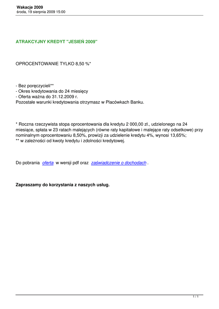 Wakacje 2009 środa, 19 sierpnia 2009 15:00 ATRAKCYJNY KREDYT "JESIEŃ 2009" OPROCENTOWANIE TYLKO 8,50 %* - Bez poręczycieli** - Okres kredytowania do 24 miesięcy - Oferta ważna do 31.12.2009 r. Pozostałe warunki kredytowania otrzymasz w Placówkach Banku. * Roczna rzeczywista stopa oprocentowania dla kredytu 2 000,00 zł., udzielonego na 24 miesiące, spłata w 23 ratach malejących (równe raty kapitałowe i malejące raty odsetkowe) przy nominalnym oprocentowaniu 8,50%, prowizji za udzielenie kredytu 4%, wynosi 13,65%; ** w zależności od kwoty kredytu i zdolności kredytowej. Do pobrania oferta w wersji pdf oraz zaświadczenie o dochodach . Zapraszamy do korzystania z naszych usług. 1/1