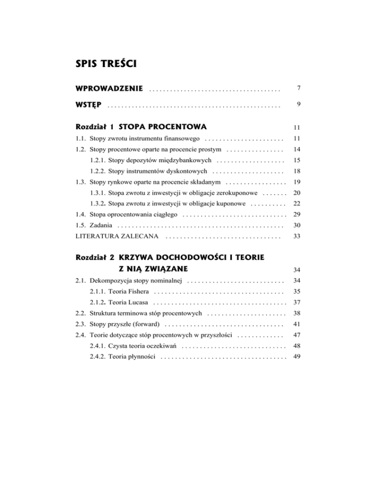 SPIS TREŚCI WPROWADZENIE . . . . . . . . . . . . . . . . . . . . . . . . . . . . . . . . . . . . . . 7 WSTĘP . . . . . . . . . . . . . . . . . . . . . . . . . . . . . . . . . . . . . . . . . . . . . . . . . . 9 Rozdział 1 STOPA PROCENTOWA 11 1.1. Stopy zwrotu instrumentu finansowego . . . . . . . . . . . . . . . . . . . . . . 11 1.2. Stopy procentowe oparte na procencie prostym . . . . . . . . . . . . . . . . 14 1.2.1. Stopy depozytów międzybankowych . . . . . . . . . . . . . . . . . . . 15 1.2.2. Stopy instrumentów dyskontowych . . . . . . . . . . . . . . . . . . . . 18 1.3. Stopy rynkowe oparte na procencie składanym . . . . . . . . . . . . . . . . . 19 1.3.1. Stopa zwrotu z inwestycji w obligacje zerokuponowe . . . . . . . 20 1.3.2. Stopa zwrotu z inwestycji w obligacje kuponowe . . . . . . . . . . 22 1.4. Stopa oprocentowania ciągłego . . . . . . . . . . . . . . . . . . . . . . . . . . . . . 29 1.5. Zadania . . . . . . . . . . . . . . . . . . . . . . . . . . . . . . . . . . . . . . . . . . . . . . 30 LITERATURA ZALECANA 33 ................................ Rozdział 2 KRZYWA DOCHODOWOŚCI I TEORIE Z NIĄ ZWIĄZANE 34 2.1. Dekompozycja stopy nominalnej . . . . . . . . . . . . . . . . . . . . . . . . . . . 34 2.1.1. Teoria Fishera . . . . . . . . . . . . . . . . . . . . . . . . . . . . . . . . . . . . 35 2.1.2. Teoria Lucasa . . . . . . . . . . . . . . . . . . . . . . . . . . . . . . . . . . . . . 37 2.2. Struktura terminowa stóp procentowych . . . . . . . . . . . . . . . . . . . . . . 38 2.3. Stopy przyszłe (forward) . . . . . . . . . . . . . . . . . . . . . . . . . . . . . . . . . 41 2.4. Teorie dotyczące stóp procentowych w przyszłości . . . . . . . . . . . . . 47 2.4.1. Czysta teoria oczekiwań . . . . . . . . . . . . . . . . . . . . . . . . . . . . . 48 2.4.2. Teoria płynności . . . . . . . . . . . . . . . . . . . . . . . . . . . . . . . . . . . 49 2.4.3. Teoria segmentacji rynku . . . . . . . . . . . . . . . . . . . . . . . . . . . . 50 2.4.4. Teoria preferencji . . . . . . . . . . . . . . . . . . . . . . . . . . . . . . . . . . 52 2.5. Zadania . . . . . . . . . . . . . . . . . . . . . . . . . . . . . . . . . . . . . . . . . . . . . . 52 LITERATURA ZALECANA . . . . . . . . . . . . . . . . . . . . . . . . . . . . . . . . . . 55 Rozdział 3 KONSTRUKCJA KRZYWEJ DOCHODOWOŚCI 56 3.1. Czynnik dyskontowy i współzależność stóp . . . . . . . . . . . . . . . . . . . 56 3.2. Własności modelowanej krzywej dochodowości . . . . . . . . . . . . . . . 64 3.3. Metody konstrukcji krzywej . . . . . . . . . . . . . . . . . . . . . . . . . . . . . . . 66 3.3.1. Metoda interpolacji liniowej . . . . . . . . . . . . . . . . . . . . . . . . . . 67 3.3.2. Metoda linii trendu . . . . . . . . . . . . . . . . . . . . . . . . . . . . . . . . . 70 3.3.3. Metoda oparta na estymacji krzywej dyskontowej . . . . . . . . . 71 3.3.4. Modele parametryczne . . . . . . . . . . . . . . . . . . . . . . . . . . . . . . 72 3.4. Zadania . . . . . . . . . . . . . . . . . . . . . . . . . . . . . . . . . . . . . . . . . . . . . . 76 LITERATURA ZALECANA . . . . . . . . . . . . . . . . . . . . . . . . . . . . . . . . . 78 Rozdział 4 ZASTOSOWANIE KRZYWEJ DOCHODOWOŚCI 79 4.1. Wyznaczanie teoretycznych stóp spotowych . . . . . . . . . . . . . . . . . . 79 4.2. Wycena nowych emisji obligacji . . . . . . . . . . . . . . . . . . . . . . . . . . . 80 4.3. Konstrukcja benchmarku i klasyfikacja cheap-dear . . . . . . . . . . . . . 82 4.4. Konstrukcja implikowanych krzywych forward . . . . . . . . . . . . . . . . 84 4.5. Zadania . . . . . . . . . . . . . . . . . . . . . . . . . . . . . . . . . . . . . . . . . . . . . . 86 LITERATURA ZALECANA . . . . . . . . . . . . . . . . . . . . . . . . . . . . . . . . . . 88 BIBLIOGRAFIA 89 SPIS RYSUNKÓW ......................................... ................................... 95