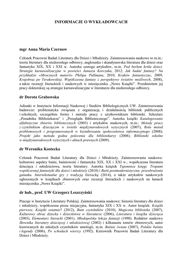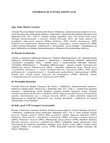 INFORMACJE O WYKŁADOWCACH mgr Anna Maria Czernow Członek Pracowni Badań Literatury dla Dzieci i Młodzieży. Zainteresowania naukowe to m.in.: teoria literatury dla niedorosłego odbiorcy, anglosaska i skandynawska literatura dla dzieci oraz fantastyka XIX, XX i XXI w. Autorka szeregu artykułów, m.in. Pod berłem króla dzieci. Strategie karnawalizacyjne w powieści Janusza Korczaka, 2012; Jak badać fantasy? Na przykładzie «Mrocznych materii» Philipa Pullmana, 2010; Kraków fantastyczny, 2009; Krajobraz po Terakowskiej. Współczesna fantasy z perspektywy światów możliwych, 2008), a także recenzji literackich i naukowych w miesięczniku „Nowe Książki”. Przedmiotem jej pracy doktorskiej są strategie karnawalizacyjne w literaturze dla niedorosłego odbiorcy. dr Dorota Grabowska Adiunkt w Instytucie Informacji Naukowej i Studiów Bibliologicznych UW. Zainteresowania badawcze: problematyka związana z organizacją i działalnością bibliotek publicznych i szkolnych, szczególnie formy i metody pracy z użytkownikiem biblioteki. Sekretarz „Poradnika Bibliotekarza” i „Przeglądu Bibliotecznego”. Autorka książki Katalogowanie alfabetyczne zbiorów bibliotecznych (2003) i artykułów naukowych, m.in.: Metody pracy z czytelnikiem dziecięcym w świetle międzynarodowych wytycznych (2007); Rola metod problemowych i programowanych w kształtowaniu społeczeństwa informacyjnego (2008); Projekt jako metoda godna polecenia dla bibliotekarzy (2008); Biblioteki szkolne w międzynarodowych wytycznych i aktach prawnych (2009). dr Weronika Kostecka Członek Pracowni Badań Literatury dla Dzieci i Młodzieży. Zainteresowania naukowe: kulturowe aspekty baśni, baśniowość i fantastyka XIX, XX i XXI w., współczesna literatura dziecięca i młodzieżowa, teoria literatury. Autorka książek Tajemnica księgi. Tropami współczesnej fantastyki dla dzieci i młodzieży (2010) i Baśń postmodernistyczna: przeobrażenia gatunku. Intertekstualne gry z tradycją literacką (2014), a także artykułów naukowych ogłoszonych w książkach zbiorowych oraz recenzji literackich i naukowych na łamach miesięcznika „Nowe Książki”. dr hab., prof. UW Grzegorz Leszczyński Pracuje w Instytucie Literatury Polskiej. Zainteresowania naukowe: historia literatury dla dzieci i młodzieży, współczesna proza inicjacyjna, fantastyka XIX i XX w. Autor książek: Książki pierwsze. Książki ostatnie? (2012), Bunt czytelników (2010), Magiczna biblioteka (2007), Kulturowy obraz dziecka i dzieciństwa w literaturze (2006), Literatura i książka dziecięca (2003), Elementarz literacki (2001), Młodopolska lekcja fantazji (1990). Redaktor naukowy Słownika literatury dziecięcej i młodzieżowej (2002) i kilkunastu tomów zbiorowych, autor kierowanych do młodych czytelników antologii, m.in. Baśnie świata (2007), Polskie baśnie i legendy (2006), Po schodach wierszy (1992). Kierownik Pracowni Badań Literatury dla Dzieci i Młodzieży. dr Grażyna Lewandowicz-Nosal Adiunkt w Instytucie Książki i Czytelnictwa Biblioteki Narodowej. Zainteresowania naukowe: bibliotekarstwo publiczne dla dzieci, książka dziecięca i jej obieg społeczny. Autorka książek: Książki dla najmłodszych. Od zera do trzech. Poradnik (2011); Biblioteki dla dzieci wczoraj i dziś. Poradnik (2008); Biblioteki publiczne dla dzieci. Wczoraj i dziś. Poradnik (2008); Wykaz działów katalogu rzeczowego w bibliotekach publicznych dla dzieci i młodzieży (2008); Biblioteki publiczne dla dzieci w Polsce. Raport z badań (2003). Redaktor naukowy kilku tomów zbiorowych. mgr Joanna Olech Z wykształcenia graficzka, autorka książek dla dzieci i młodzieży. Pisze artykuły o literaturze dziecięcej w „Tygodniku Powszechnym, „Rzeczpospolitej”, „Nowych Książkach” i „Gazecie Wyborczej”. Od roku 2007 w zarządzie Sekcji Polskiej International Board on Books for Young People (IBBY). Współautorka podręczników PWN do języka polskiego dla gimnazjalistów. Ekspertka Polskiego Instytutu Sztuki Filmowej. Autorka (tekstów i ilustracji) do znanych i nagradzanych książek dla dzieci, takich jak Dynastia Miziołków (Nagroda Literacka im. Kornela Makuszyńskiego, Dziecięcy Bestseller Roku) Czerwony Kapturek z serii „Niebaśnie” (Najpiękniejsze książki roku 2005, wyróżnienie; konkurs polskiej sekcji IBBY Książka Roku 2005, honorowe wyróżnienie), Różowy prosiaczek (konkurs polskiej sekcji IBBY Książka Roku 2006, wyróżnienie za ilustracje – autorem tekstu jest Marcin Brykczyński). prof. Joanna Papuzińska Wieloletni pracownik naukowy Uniwersytetu Warszawskiego, wykładowca (od 1982 r. związana z Instytutem Informacji Naukowej i Studiów Bibliologicznych Wydziału Historycznego UW). Prozaik i poetka – wydała kilkadziesiąt książek dla dzieci. Krytyk literacki; z jej inicjatywy powstało czasopismo „Guliwer”, którego redaktorem naczelnym była do 2002 r. Autorka wielu rozpraw naukowych dotyczących literatury dziecięcej, czytelnictwa i bibliotekoznawstwa (m.in. Inicjacje literackie. Problemy pierwszych kontaktów dziecka z książką, 1975; Zatopione królestwo. O polskiej literaturze fantastycznej XX wieku dla dzieci i młodzieży, 1989, 2008; Książki, dzieci, biblioteka. Z zagadnień upowszechniania czytelnictwa i książki dziecięcej, 1992; Derliczek czyli wędrówki literackie, 2013). Wielokrotnie nagradzana za swoją twórczość i działalność – m.in. Nagrodą Ministra Kultury i Sztuki za działalność w dziedzinie upowszechniania kultury (1996) i Nagrodą Polskiej Sekcji IBBY za całokształt twórczości (2005); jej wspomnienia z czasów okupacji i pierwszych lat powojennych pt. Darowane kreski zostały wyróżnione Międzynarodową Nagrodą Literacką im. Janusza Korczaka (1994). dr Grażyna Walczewska-Klimczak Adiunkt w Instytucie Książki i Czytelnictwa Biblioteki Narodowej, wcześniej na Wydziale Pedagogicznym UW. Członek-założyciel Polskiego Stowarzyszen