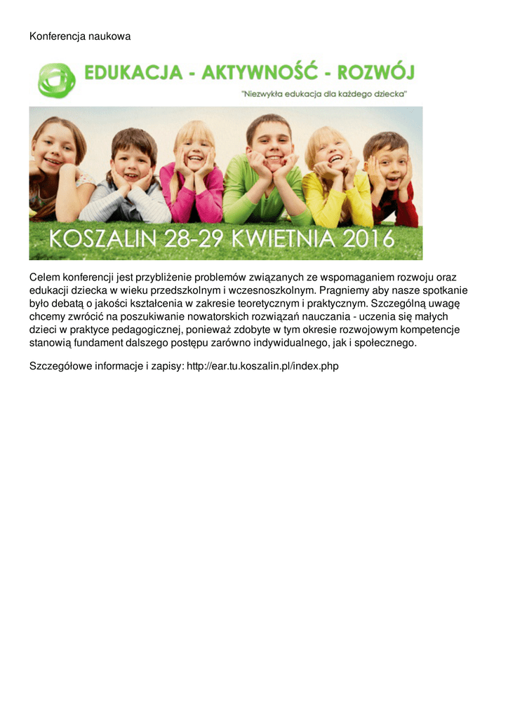 Konferencja naukowa Celem konferencji jest przybliżenie problemów związanych ze wspomaganiem rozwoju oraz edukacji dziecka w wieku przedszkolnym i wczesnoszkolnym. Pragniemy aby nasze spotkanie było debatą o jakości kształcenia w zakresie teoretycznym i praktycznym. Szczególną uwagę chcemy zwrócić na poszukiwanie nowatorskich rozwiązań nauczania - uczenia się małych dzieci w praktyce pedagogicznej, ponieważ zdobyte w tym okresie rozwojowym kompetencje stanowią fundament dalszego postępu zarówno indywidualnego, jak i społecznego. Szczegółowe informacje i zapisy: http://ear.tu.koszalin.pl/index.php